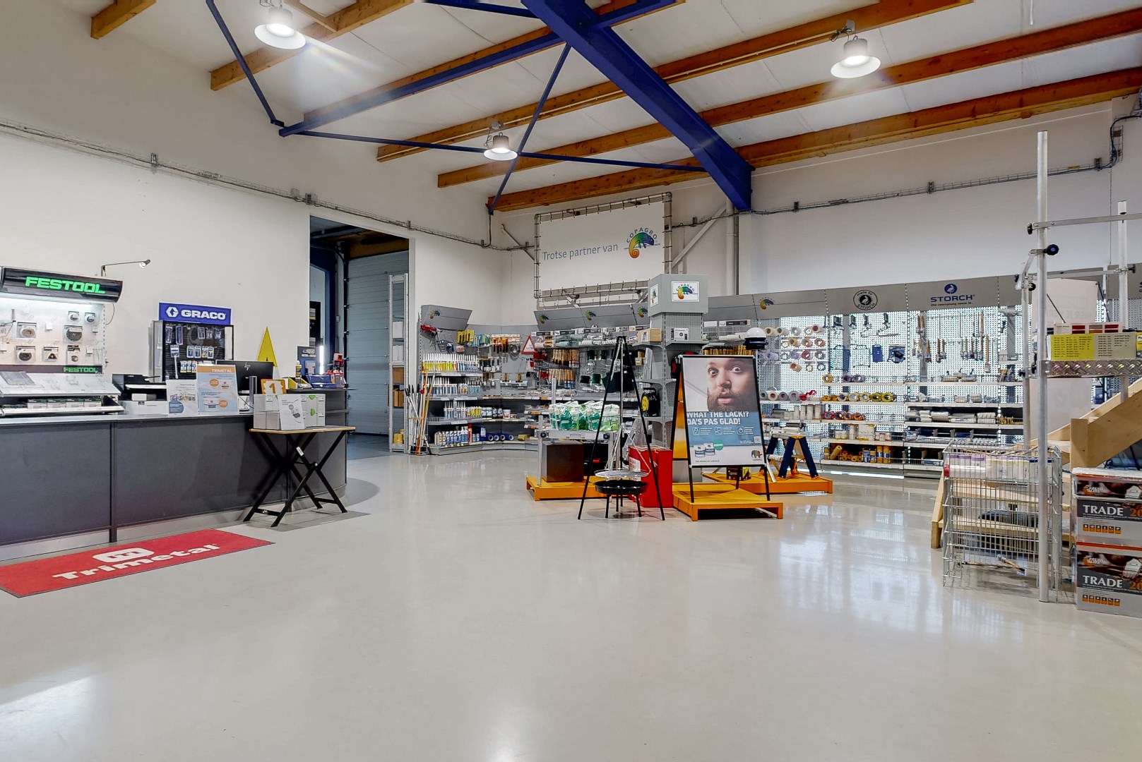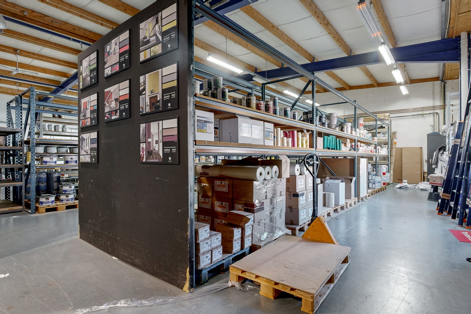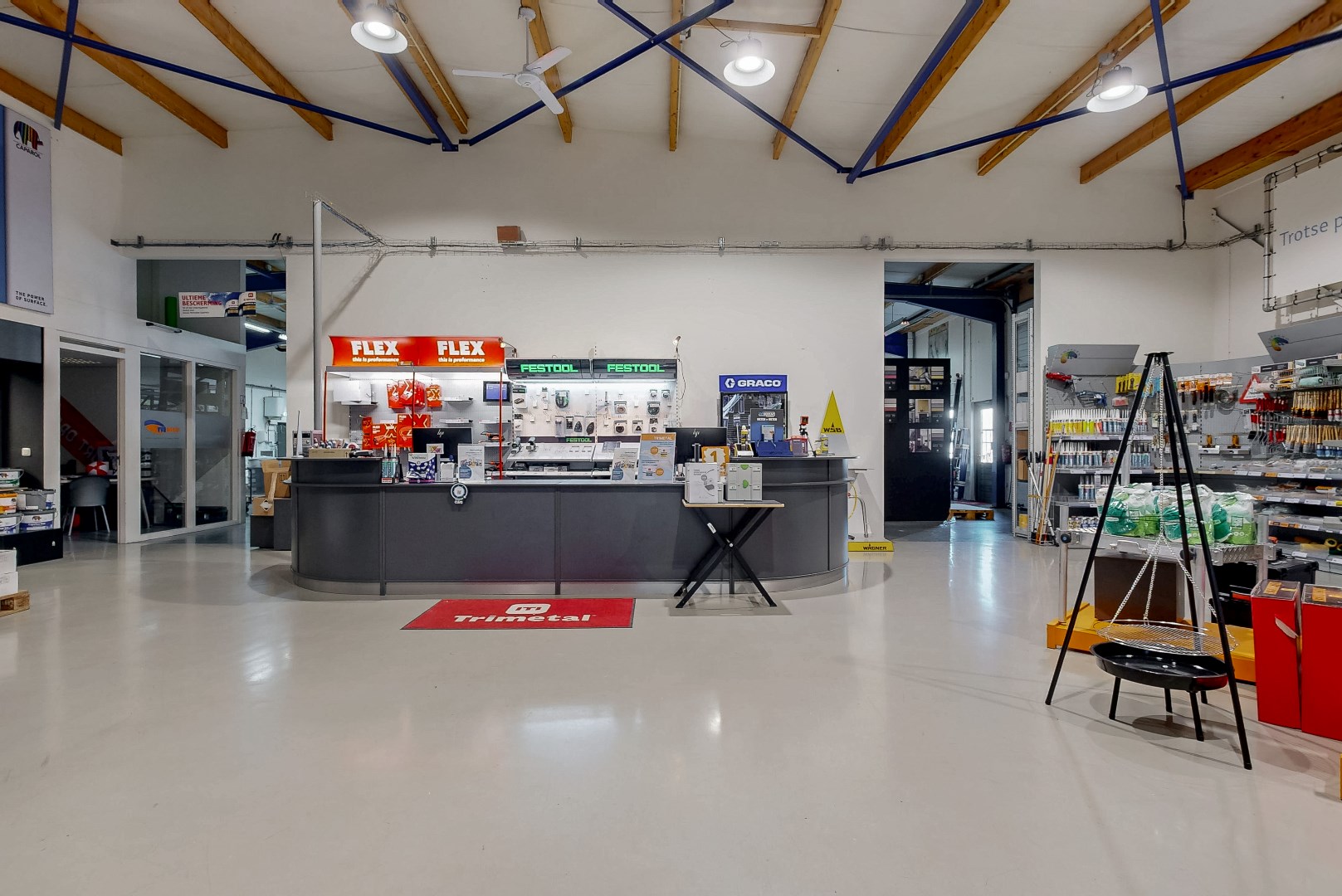 Entree tot ruime showroom, keuken en magazijn, totaal ca. 572 m².