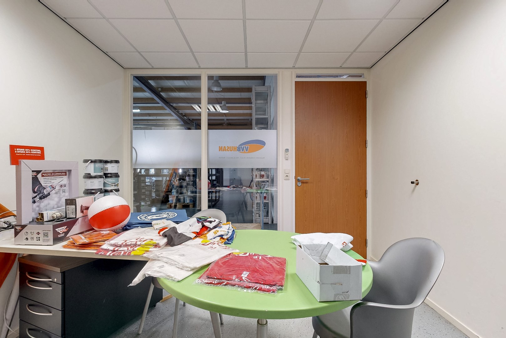 Op de begane grond bevinden zich twee kantoren, een showroom, een bedrijfsruimte, een keuken en een toiletgroep.
