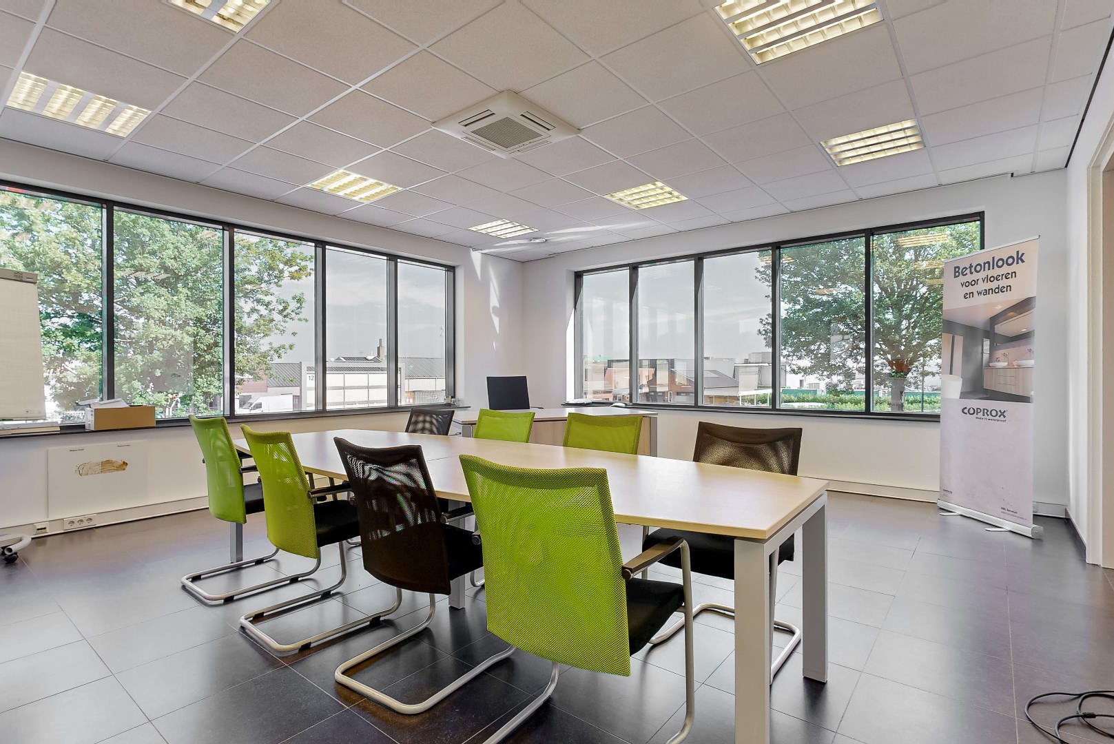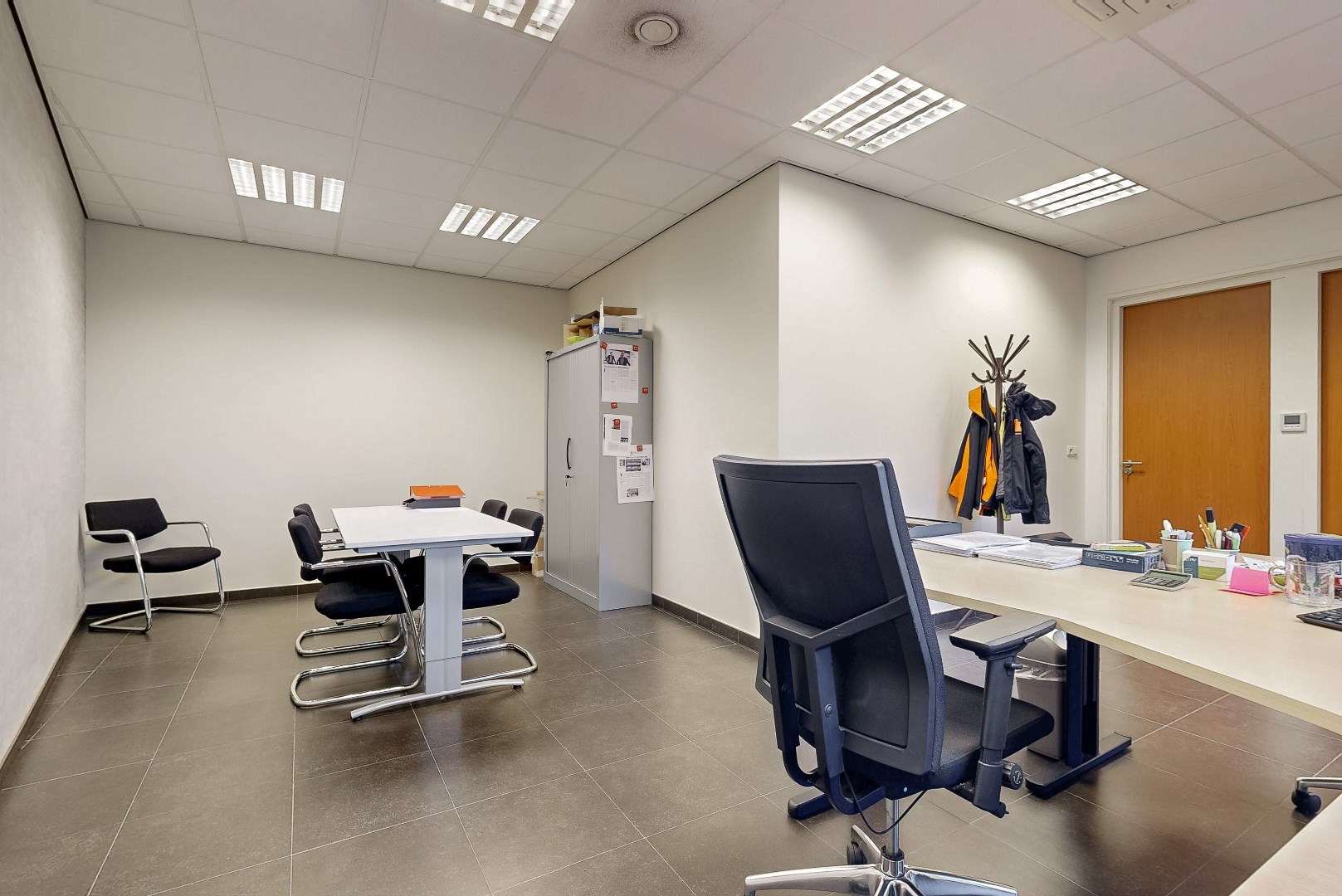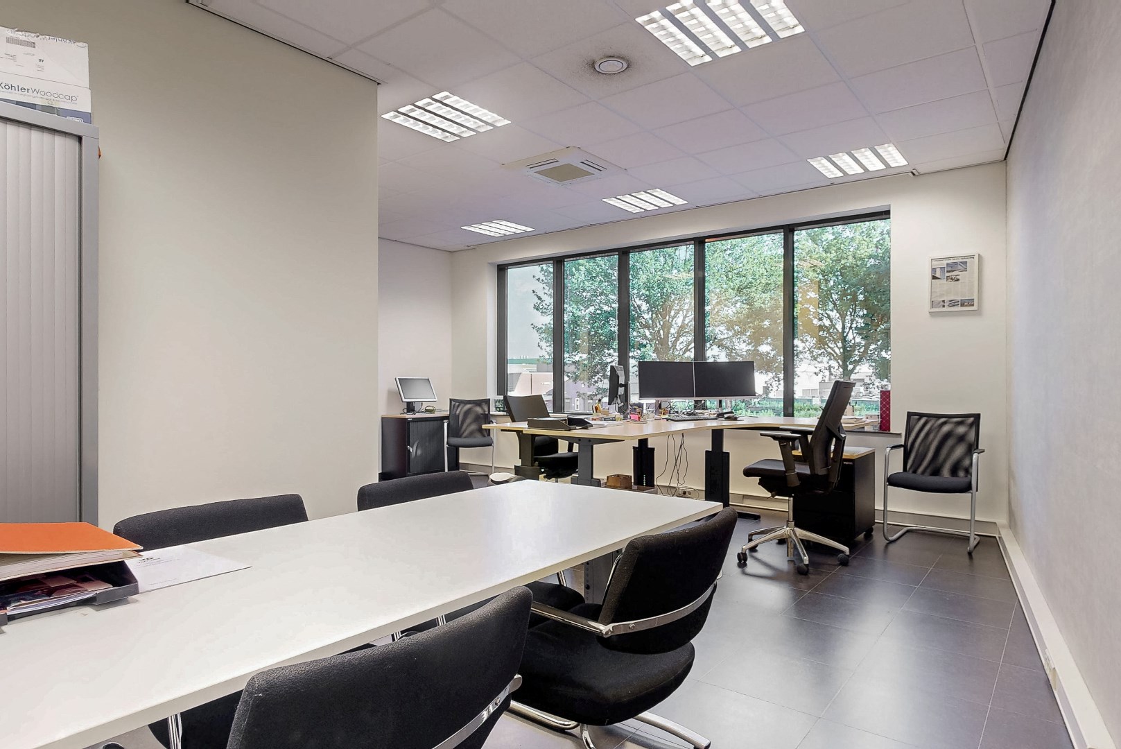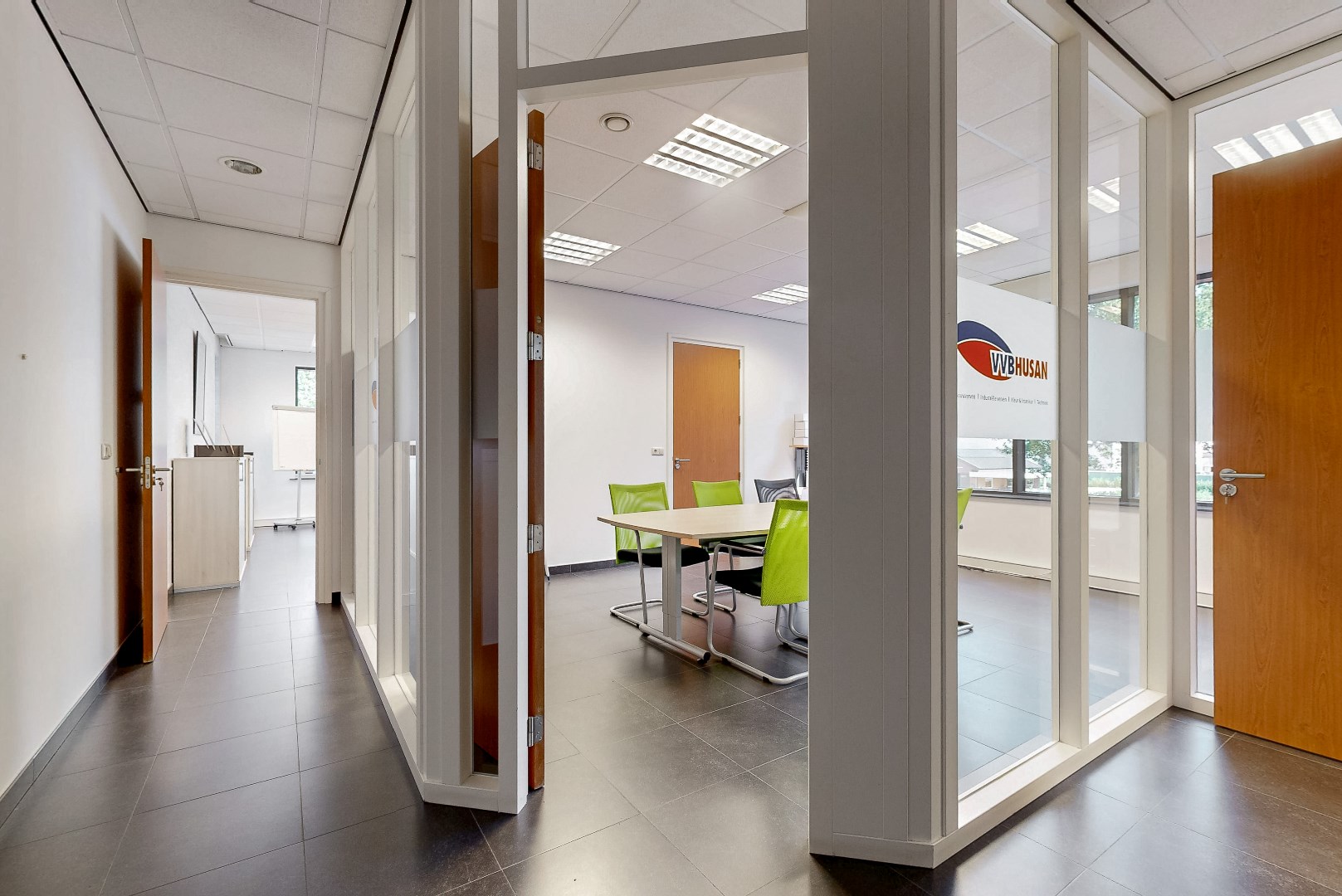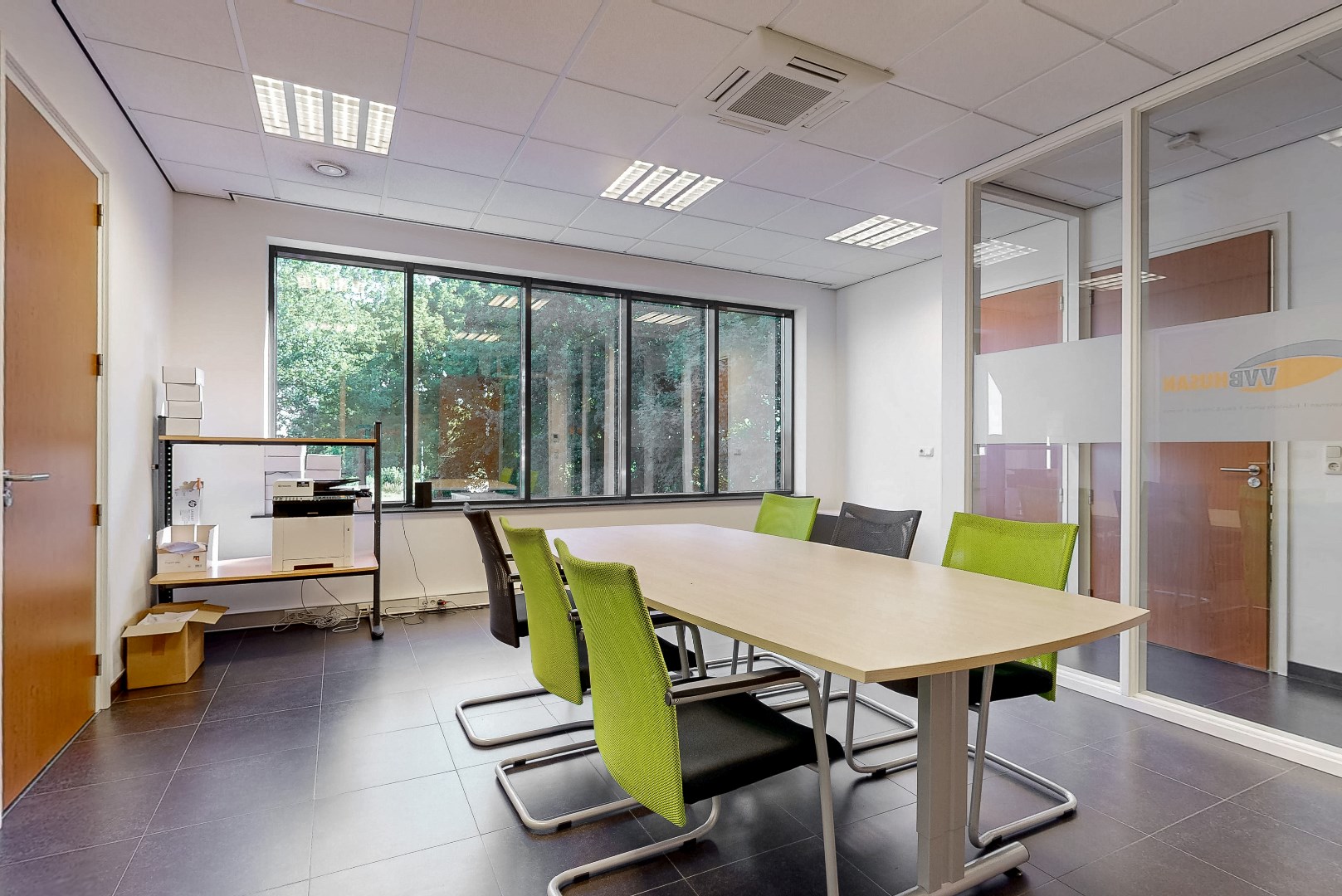 Door de grote ramen is er veel lichtinval. De kantooruimtes zijn voorzien van tegelvloer.