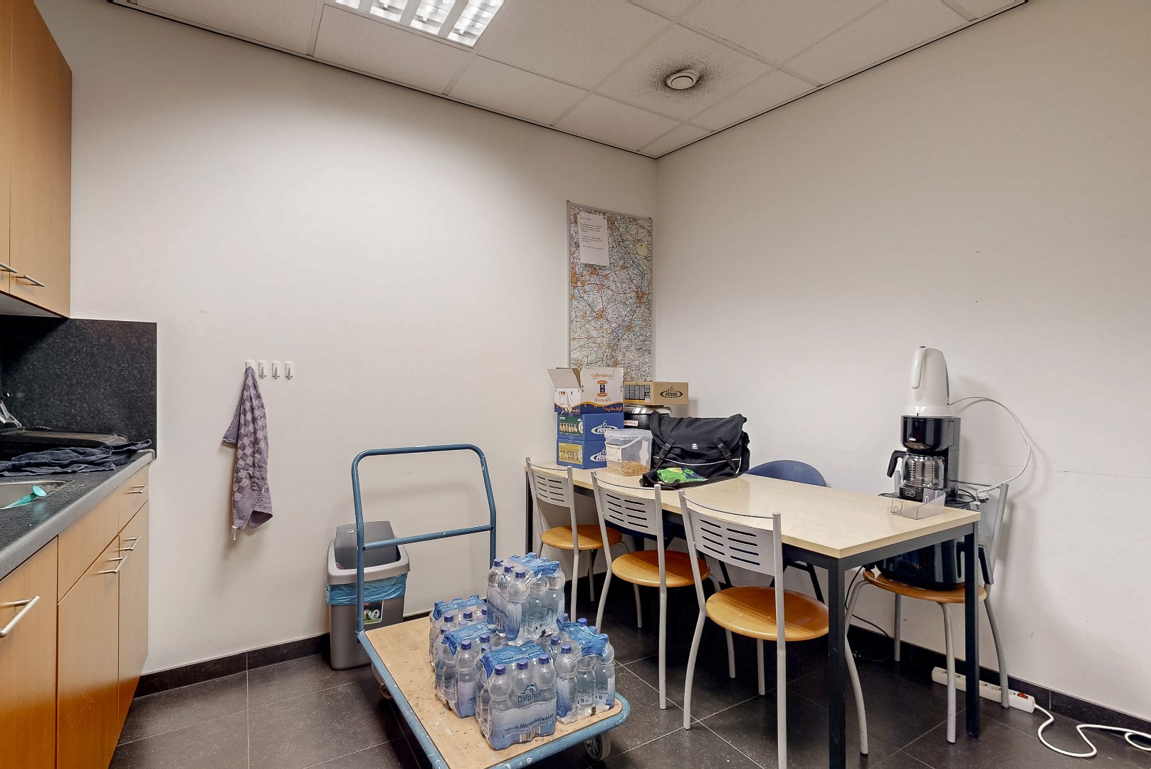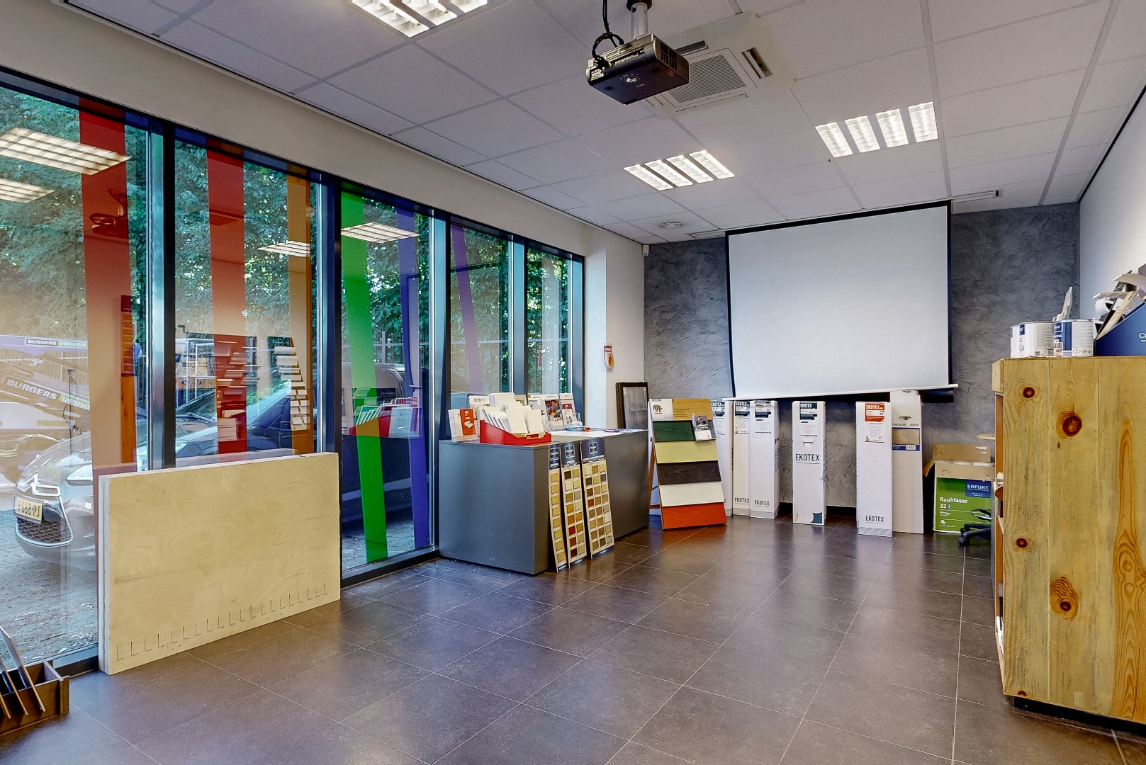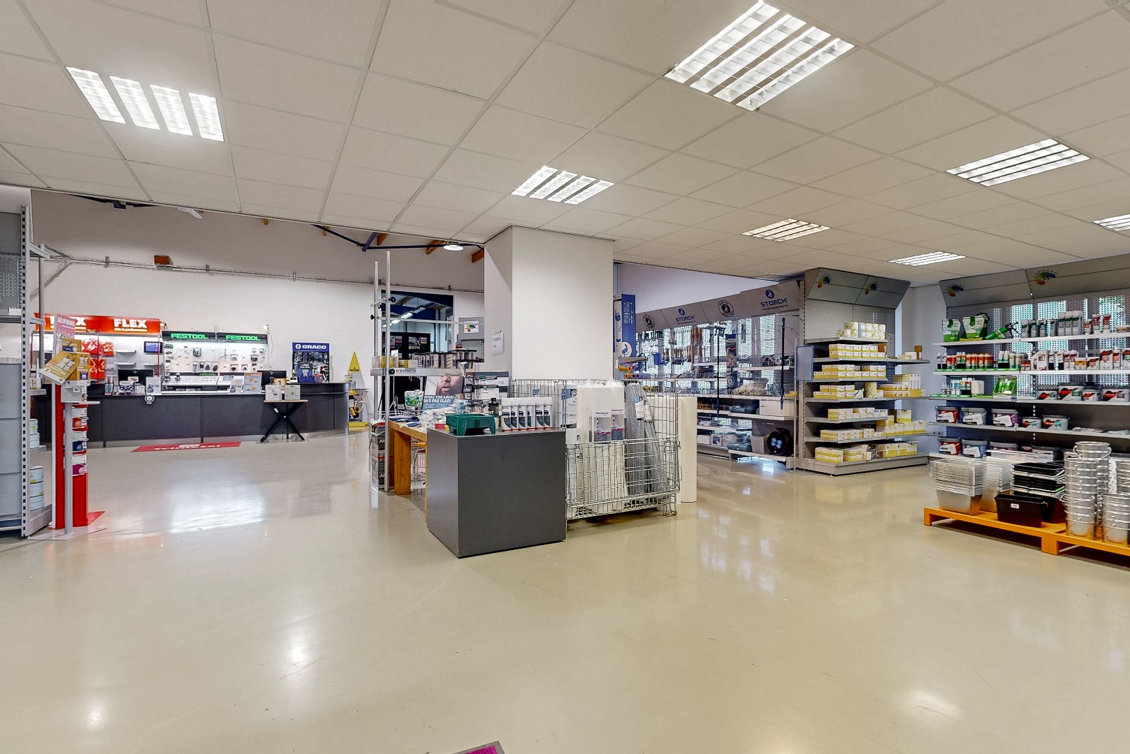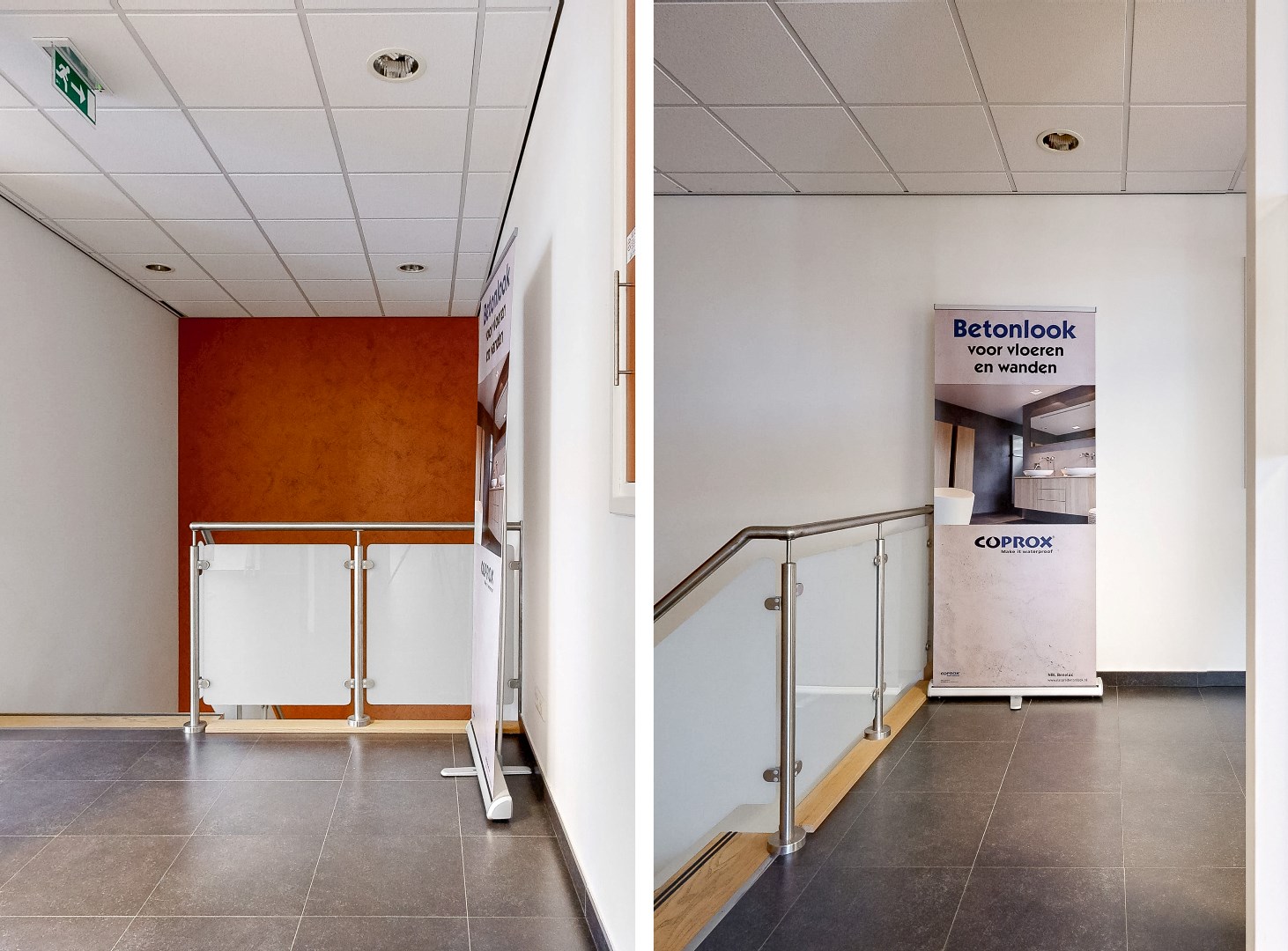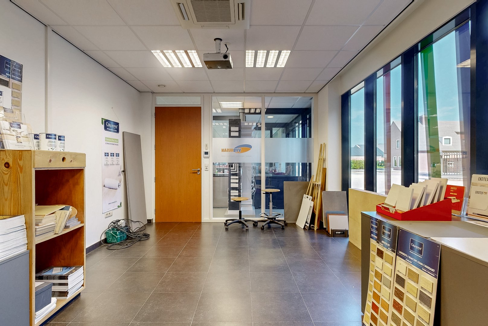 Showroom, keuken, toilet, overloop en kantoren eerste verdieping: tegelvloer