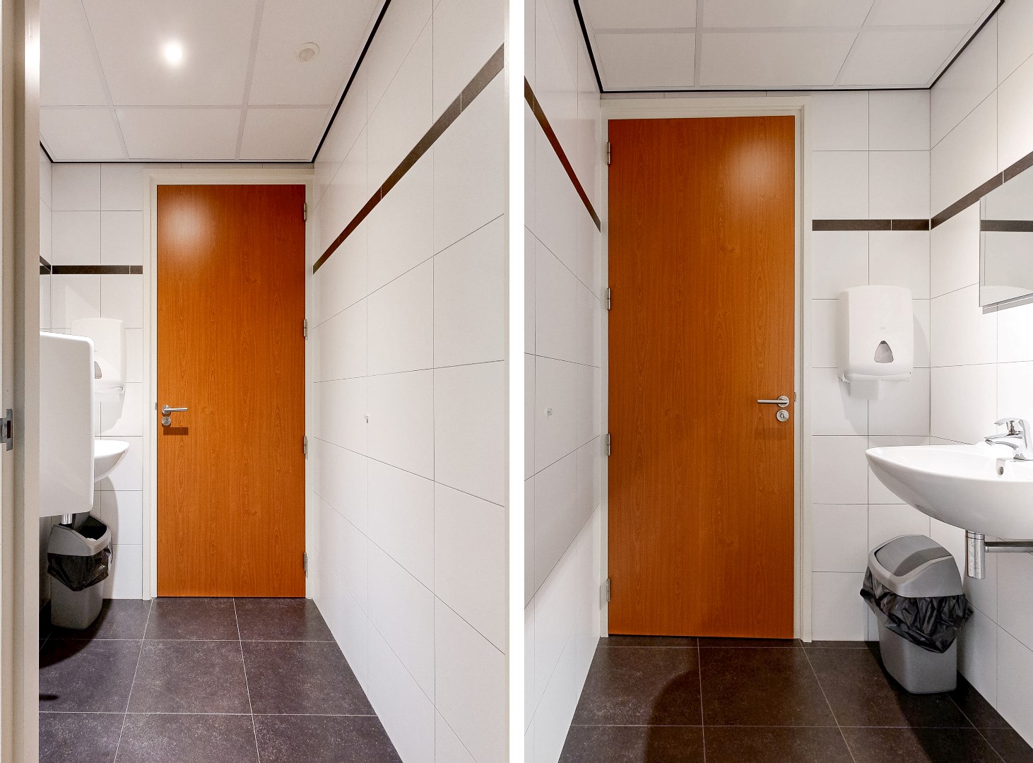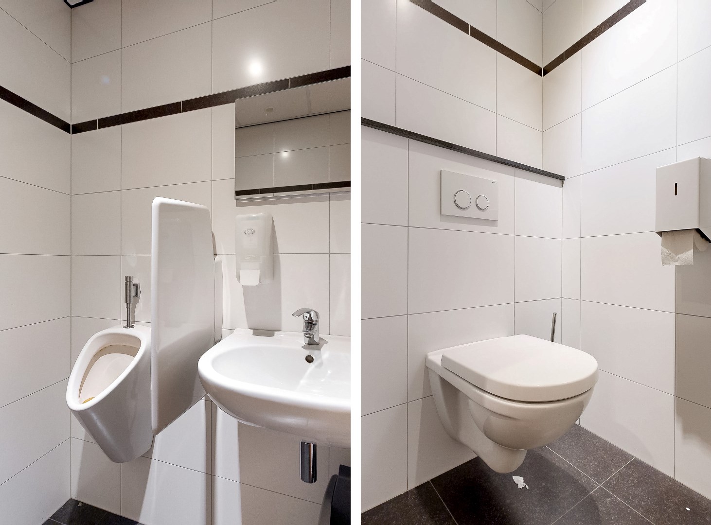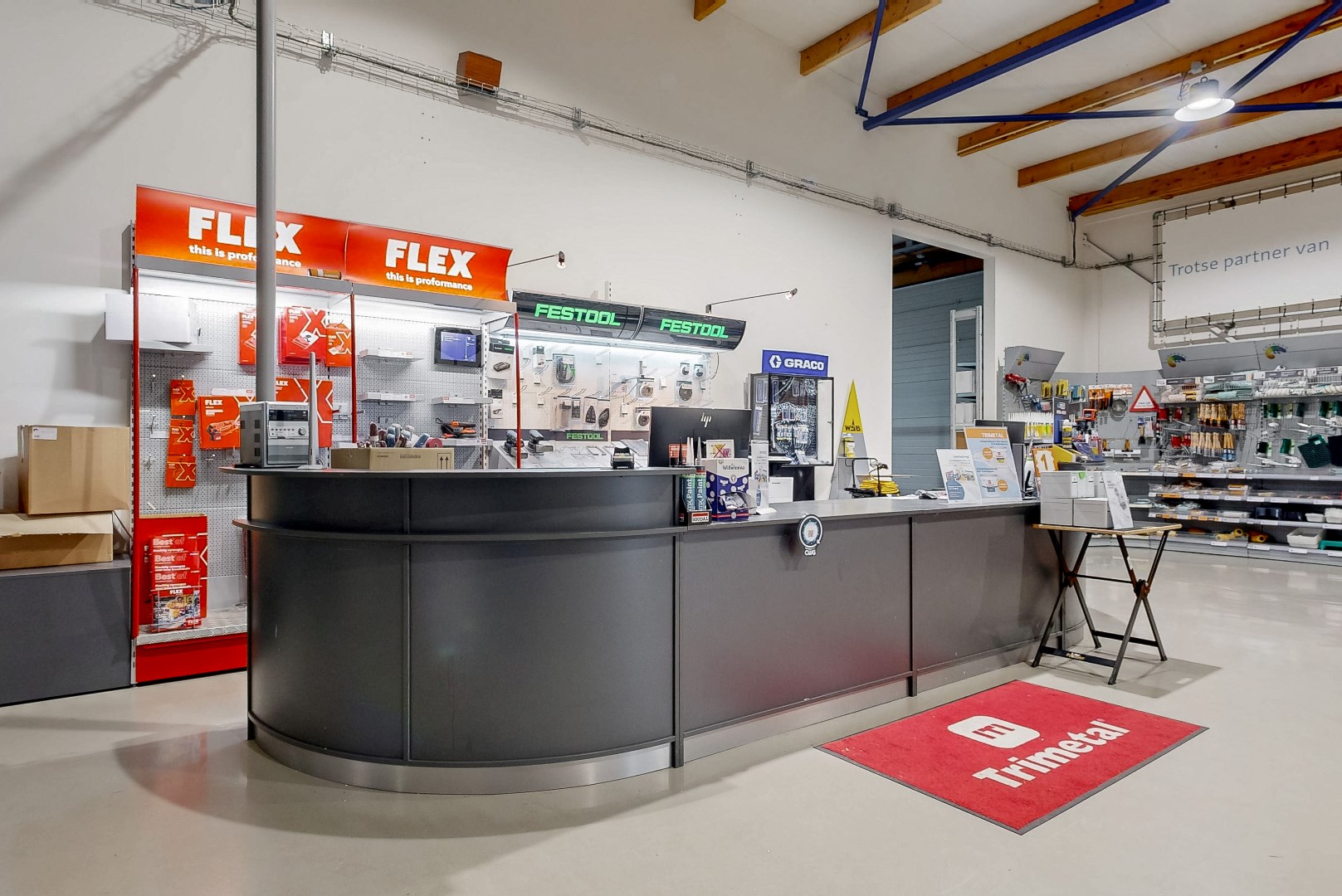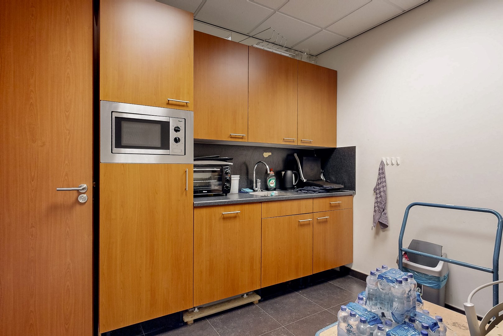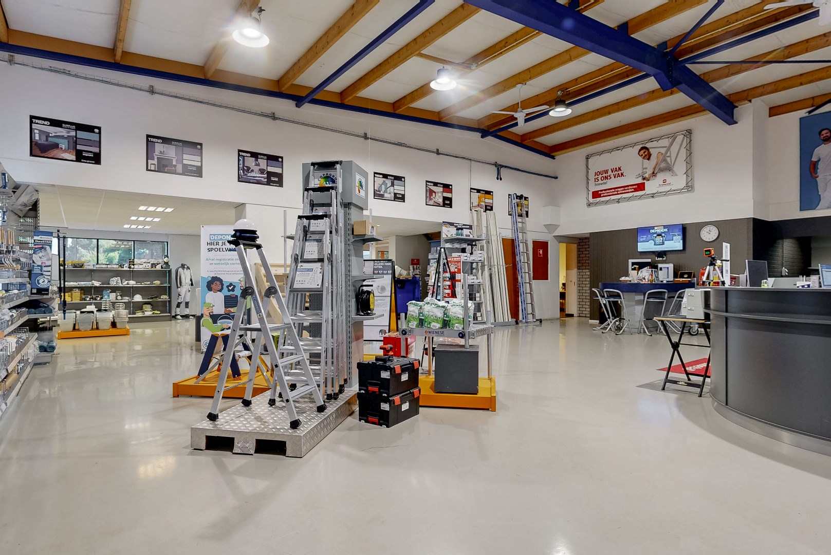 Showroom, keuken, toilet, overloop en kantoren eerste verdieping: tegelvloer