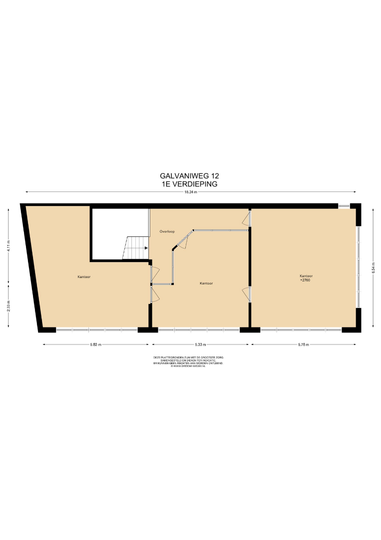 Overloop en drie kantoorruimtes van respectievelijk ±37 m², ±22 m², ±17m².