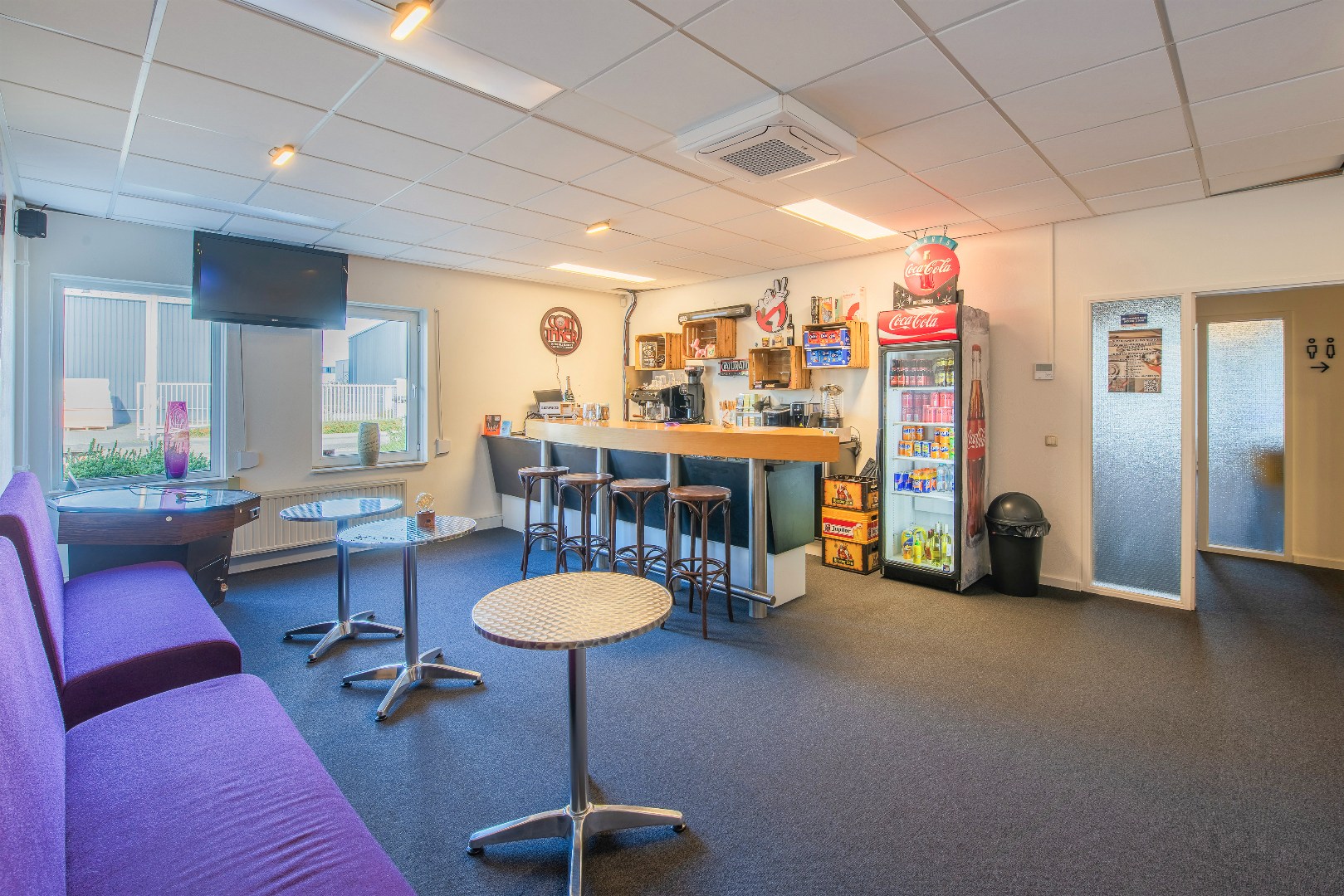 Entree/receptie. 8 kantoorruimtes. Toiletruimte. Kantine met ruim keukenblok en verschillende apparatuur (afzuigkap, kookplaat, oven, vaatwasser). Magazijnruimte met rolpoort en 2 extra inpandige ruimtes.