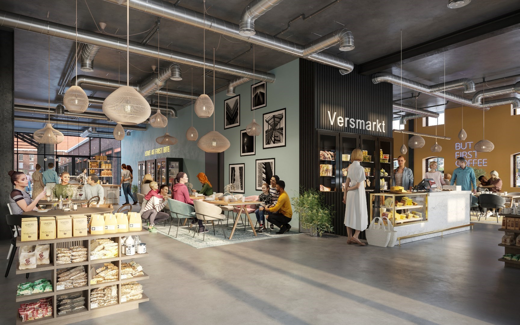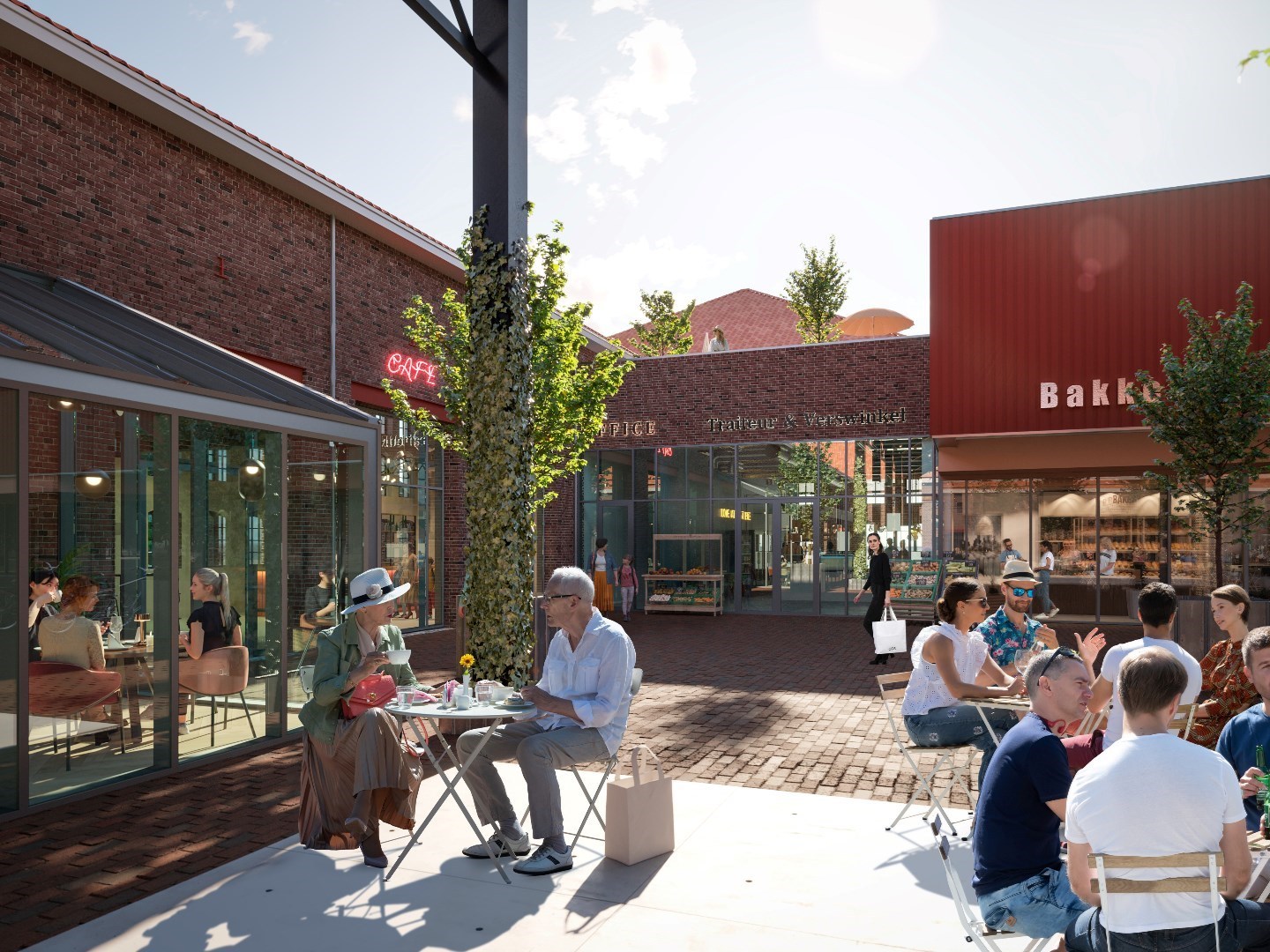 In de smaakvol gerestaureerde, rijksmonumentale fabriekshallen en bijbehorende gebouwen zijn een ambachtelijke brouwerij met gastropub, meerdere restaurants met internationale keukens en een vergaderlocatie gevestigd. Ook vinden er dienstverlenende bedrijven, particuliere bewoners en een expositieruimte en atelier voor kunstenaars en ontwerpers van bijzondere creaties een onderkomen. In twee nieuw gebouwde objecten zijn een Jumbo Foodmarkt, een bakkerij gespecialiseerd in zuurdesemproducten en zakelijke dienstverleners gehuisvest. Op het buitenterrein staat een imposante markthal passend bij de authentieke sfeer van het industrieel erfgoed. In en om deze markthal zijn gezellige terrassen, speelvoorzieningen en een podium voor muzikale en theatrale optredens geplaatst.