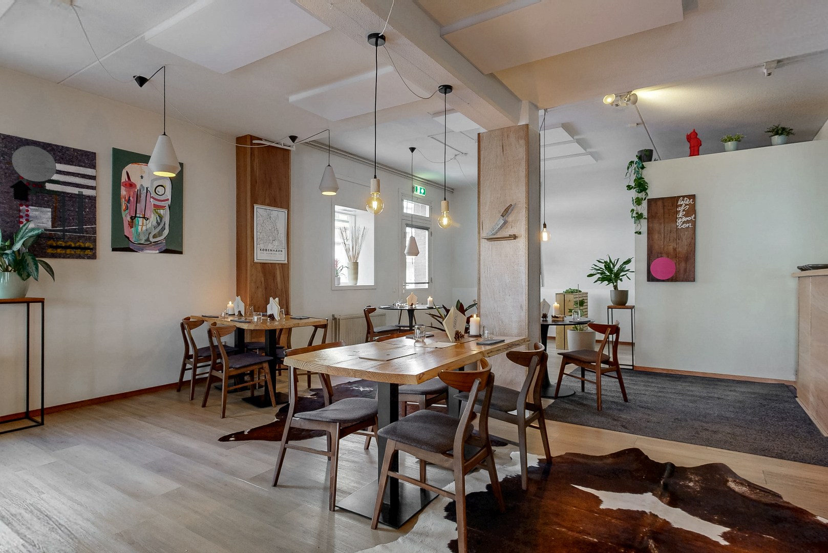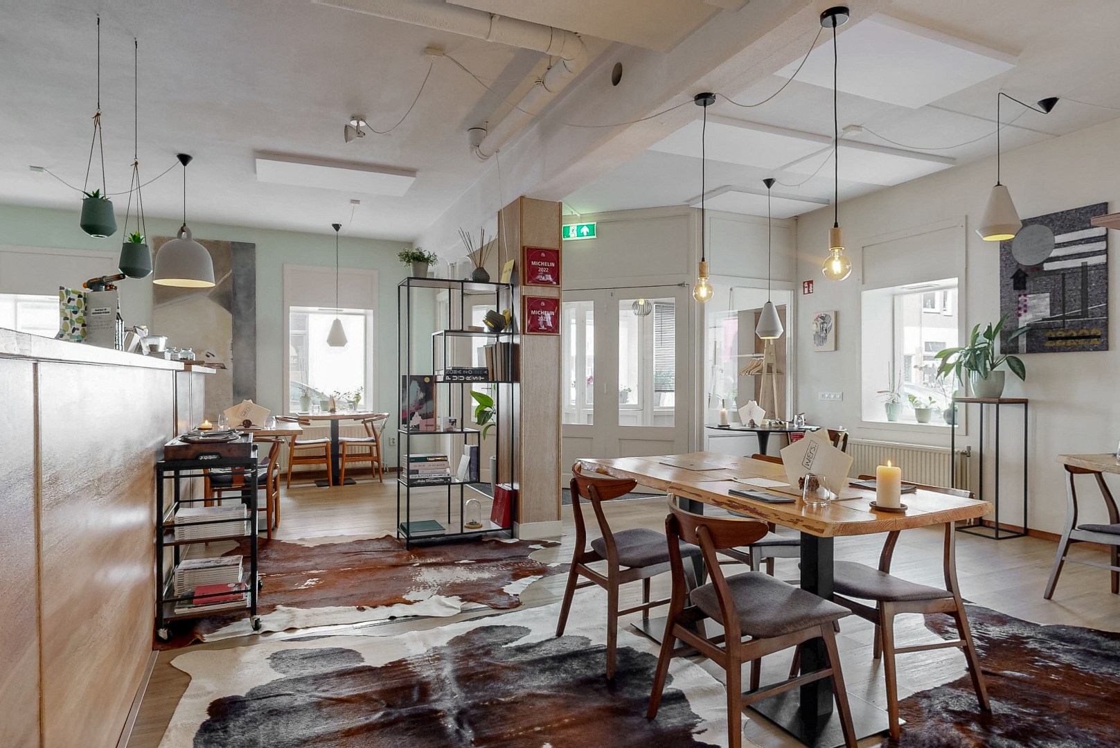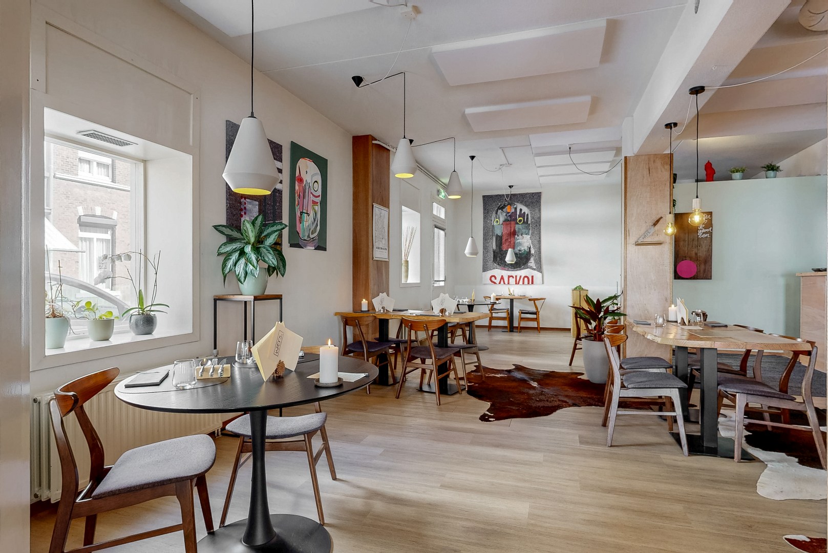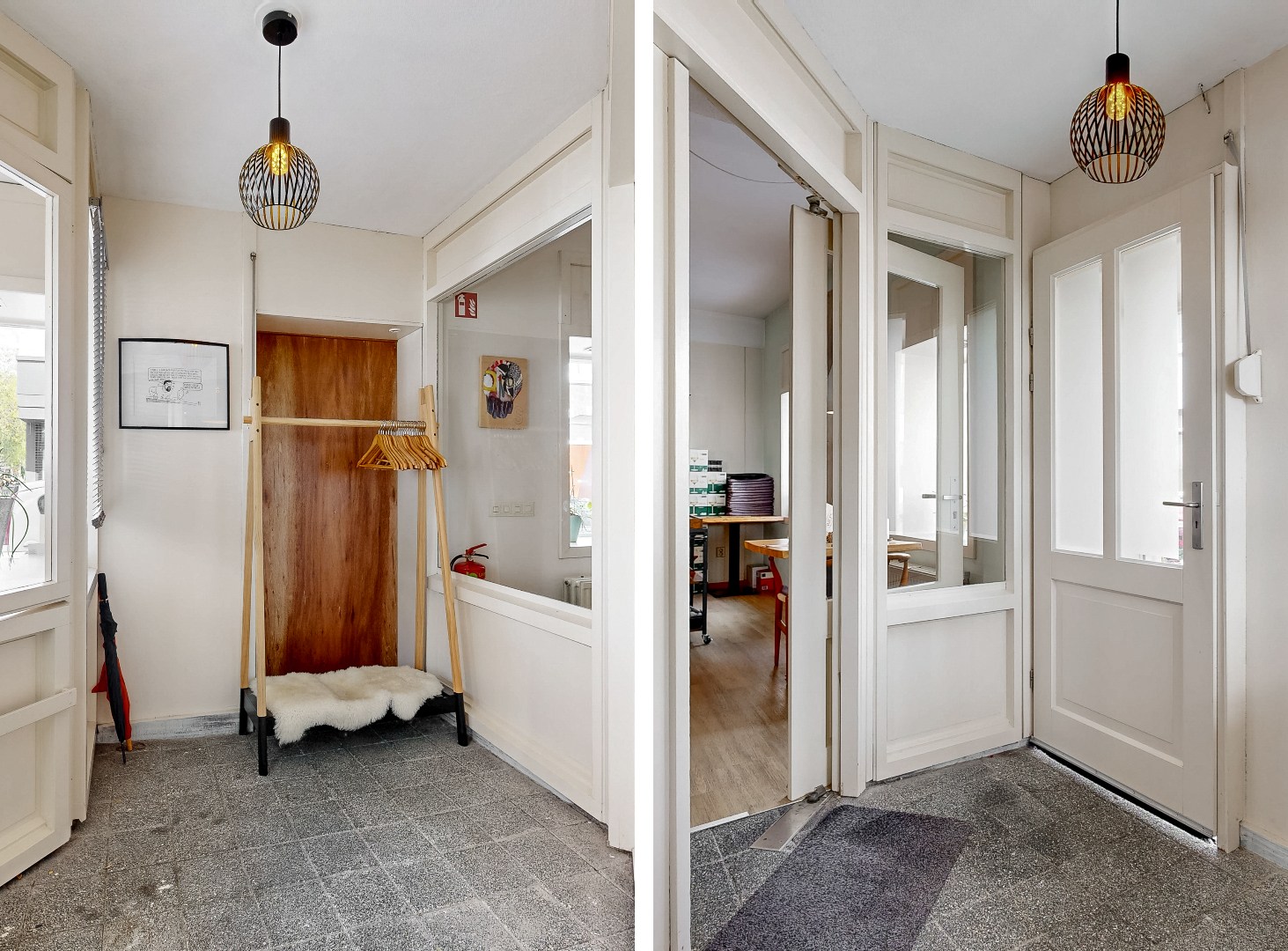 Via de entree met garderobe stapt u direct het gezellige restaurant binnen. De grote raampartijen zorgen voor een aangename lichtinval, terwijl de houtlook laminaatvloer het interieur een warme, uitnodigende sfeer geeft.