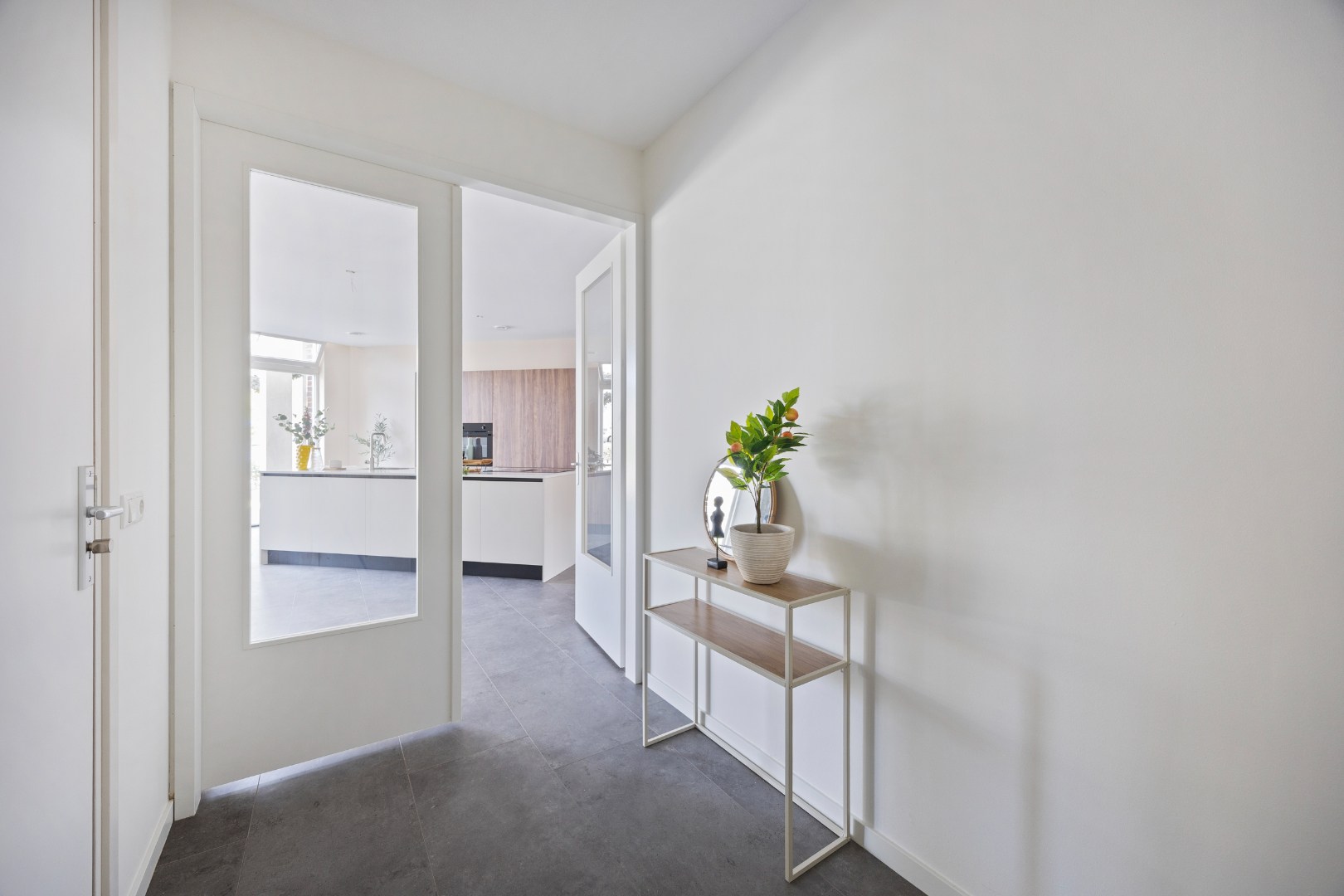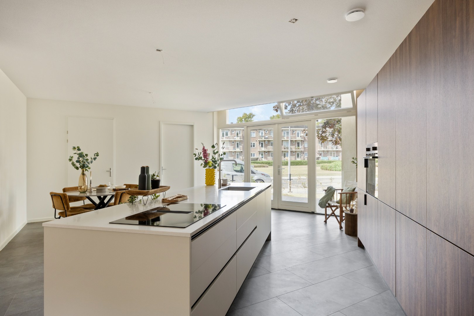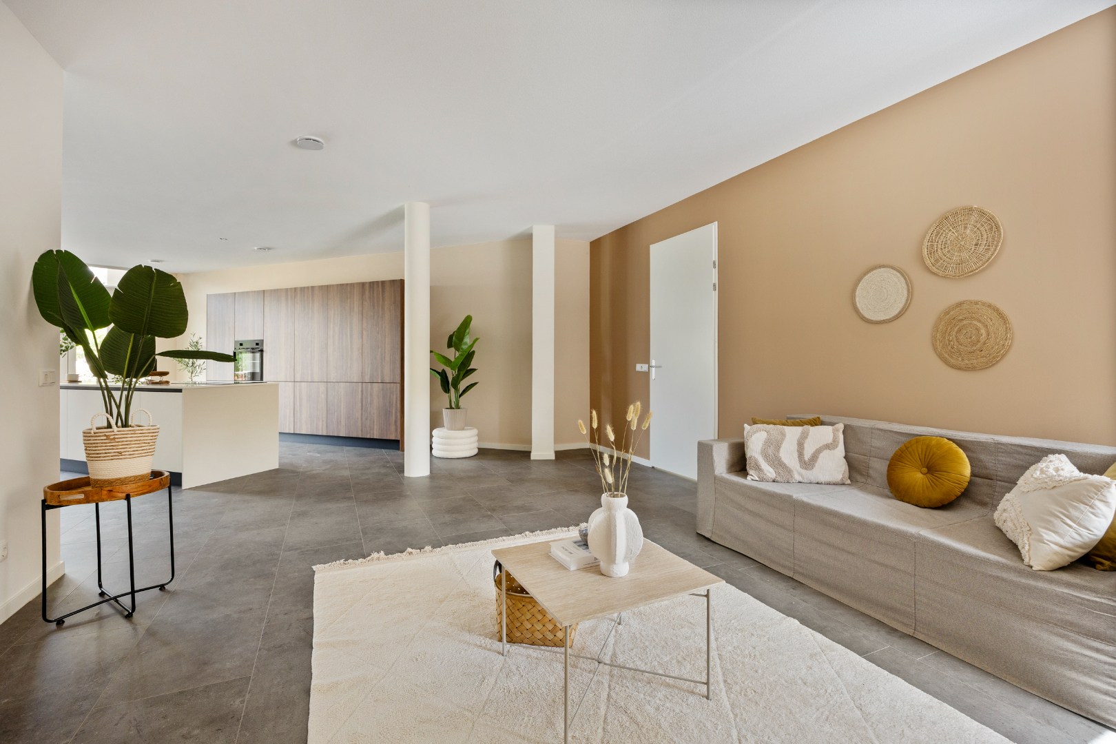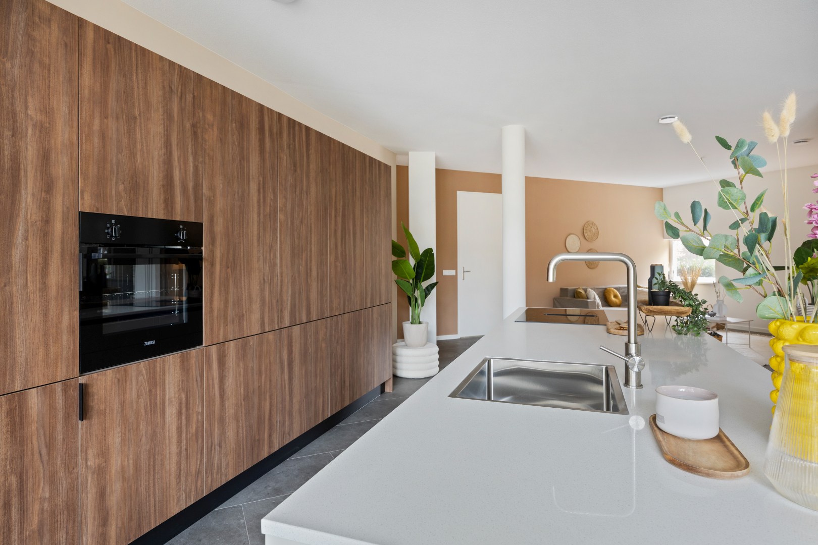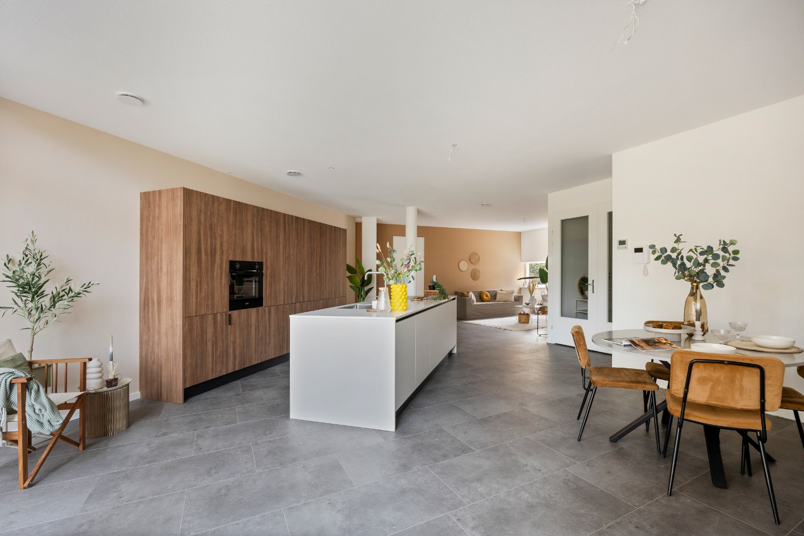 Bij binnenkomst in het riante appartement komt men in de ontvangsthal. In de Living bevindt zich een modern keukeneiland met kastenwand. Deze is voorzien van diverse onder- en hoge kasten, laden, een kunststof werkblad, een rvs spoelbak, inductiekookplaat, afzuigkap, een combi-ovenmagnetron en een koelkast.