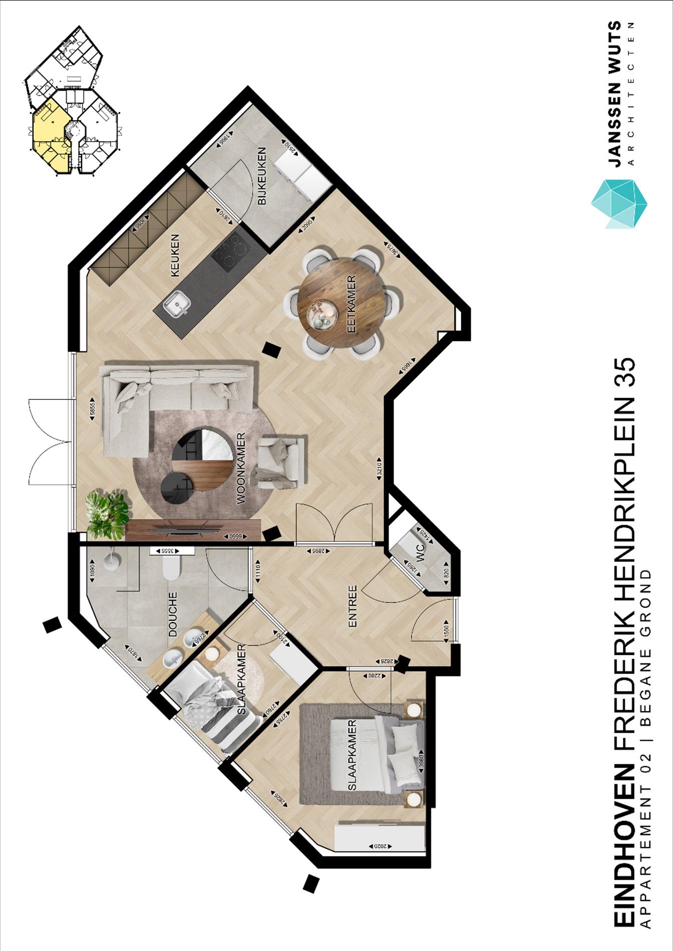 Op de begane grond bevindt zich de centrale entree. Hier vindt u de brievenbussen en het bellentableau. Via de ontvangsthal heeft u toegang tot de bergingen. De woningen op de verdieping kunt u bereiken via de stijlvolle trap. De appartementen zijn van alle gemakken voorzien. Elk appartement beschikt over een ruime woonkamer met een open volledig ingerichte keuken, twee slaapkamers, een aparte berging voor de wasmachine en de wasdroger, een badkamer en een apart toilet. De ruime woonkamer met openslaande deuren naar de tuin of patio is een fijne en lichte verblijfsruimte met een prettige lichtinval door de grote raampartijen. Uiteraard kunnen de appartementen verder geheel naar eigen smaak worden ingericht. Ze bieden daarmee alles voor eigentijds wonen en leven in Eindhoven.
