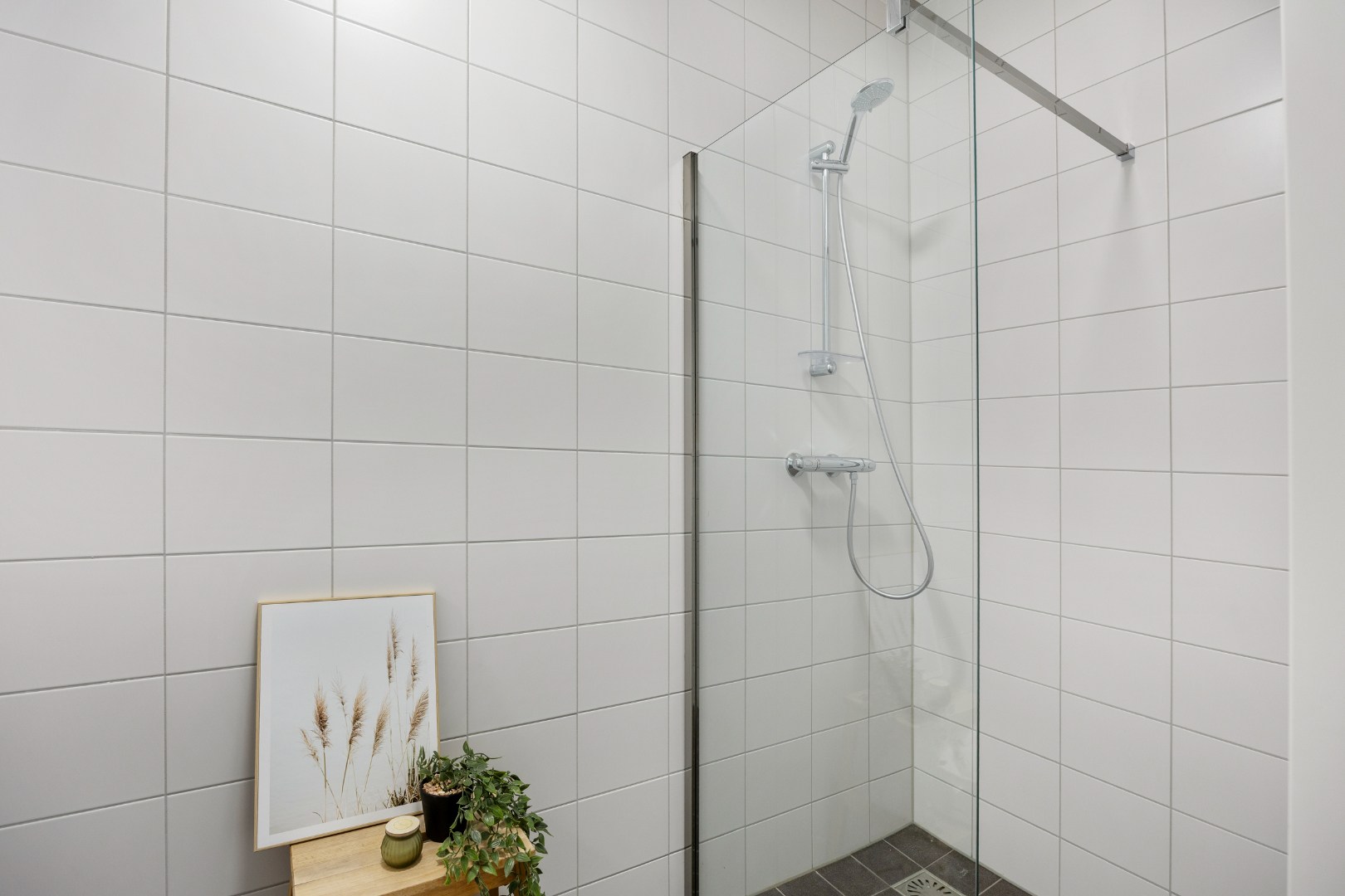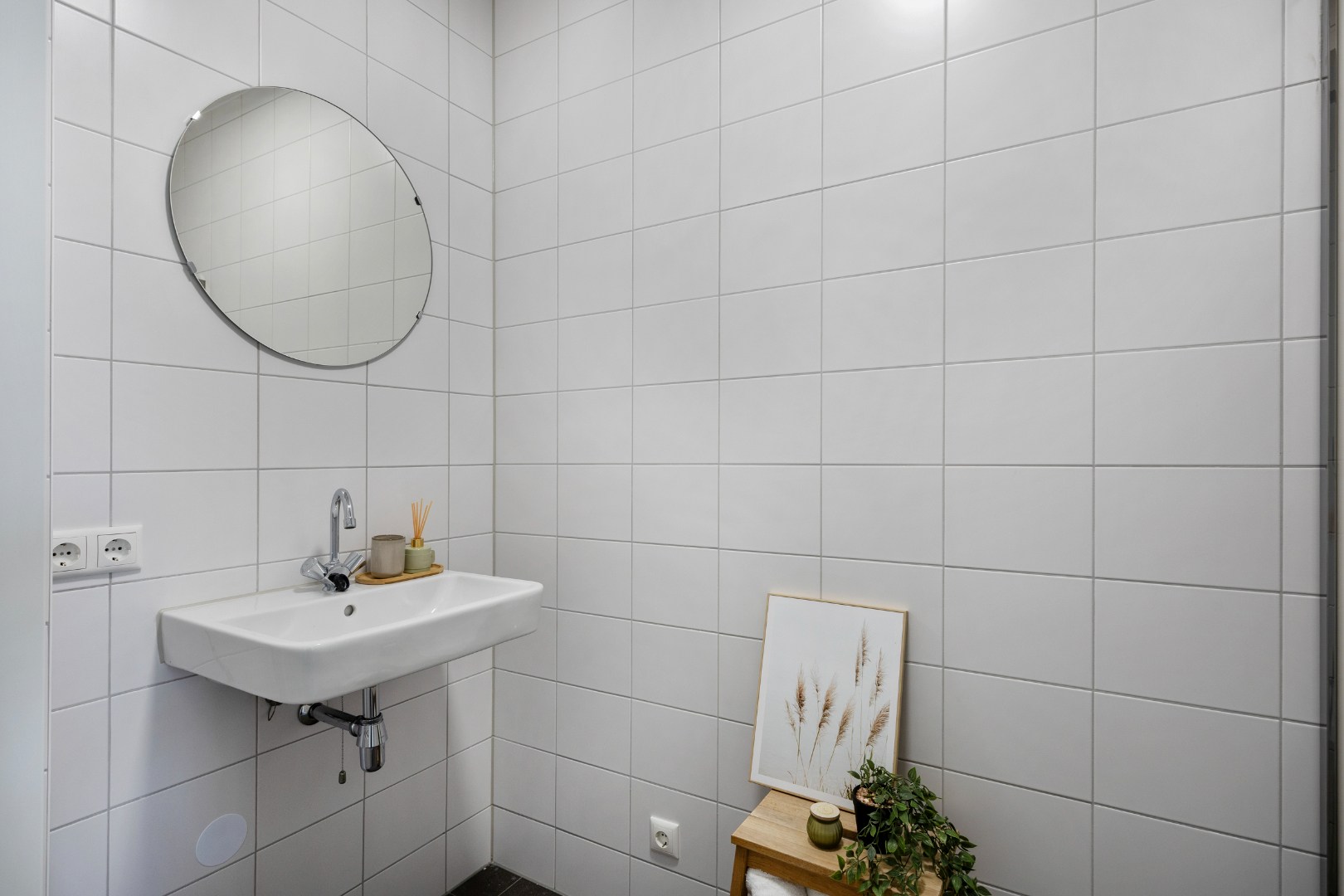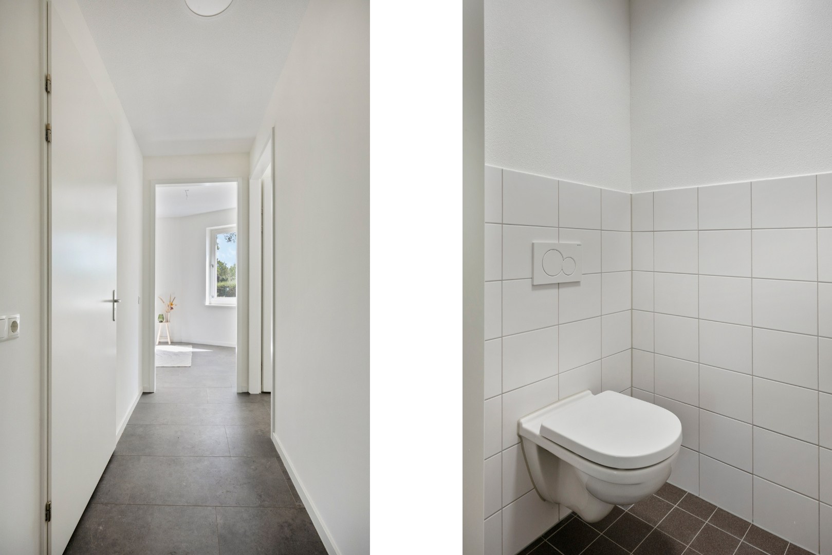 In de betegelde badkamer bevindt zich een wastafel en een inloopdouche. De aparte toiletruimte is betegeld en heeft een wandcloset en een fonteintje en uiteraard een tegelvloer. In de technische ruimte bevindt zich ook de aansluiting voor de vloerverwarming en de aansluiting voor de wasmachine en eventueel de droger.