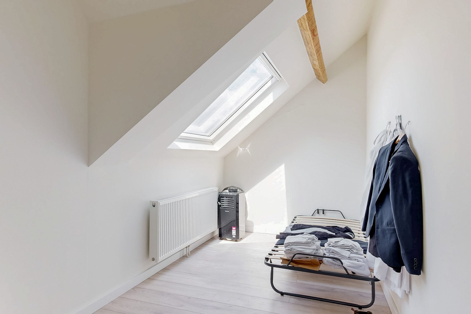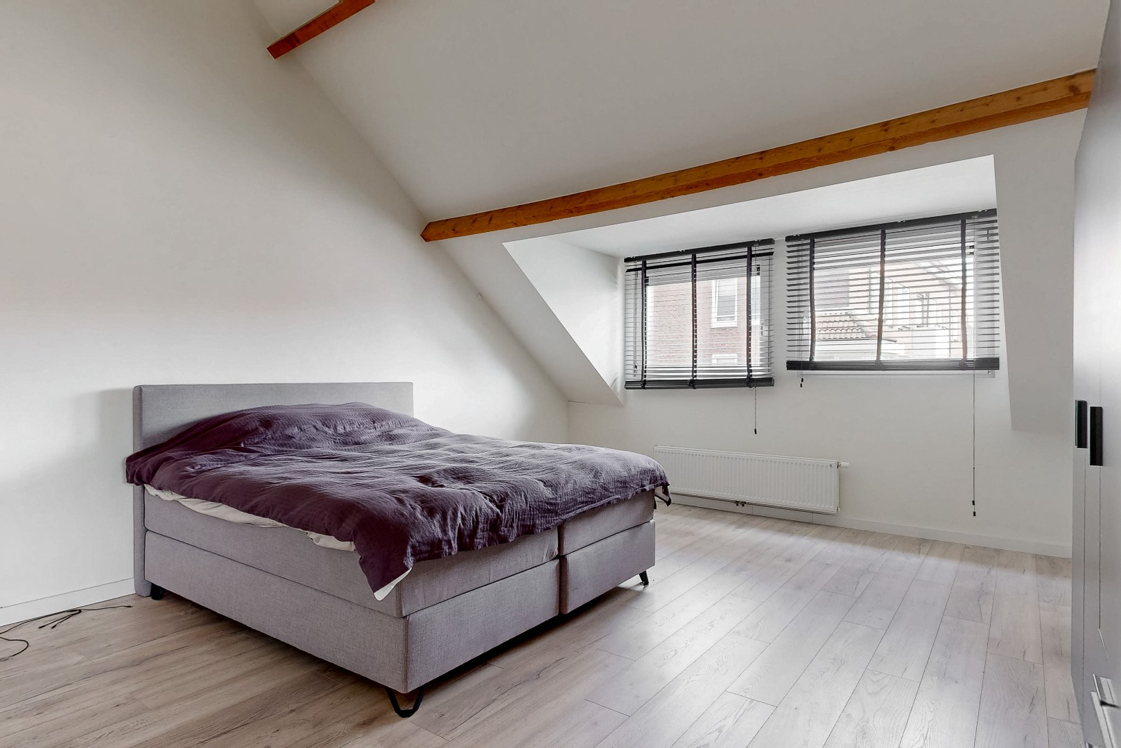 De 2 slaapkamers liggen op de tweede verdieping. Ook hier weer mooie lichtinval dankzij de grote ramen. De houtlook laminaatvloer en de houten balken zorgen voor een warme uitstraling.