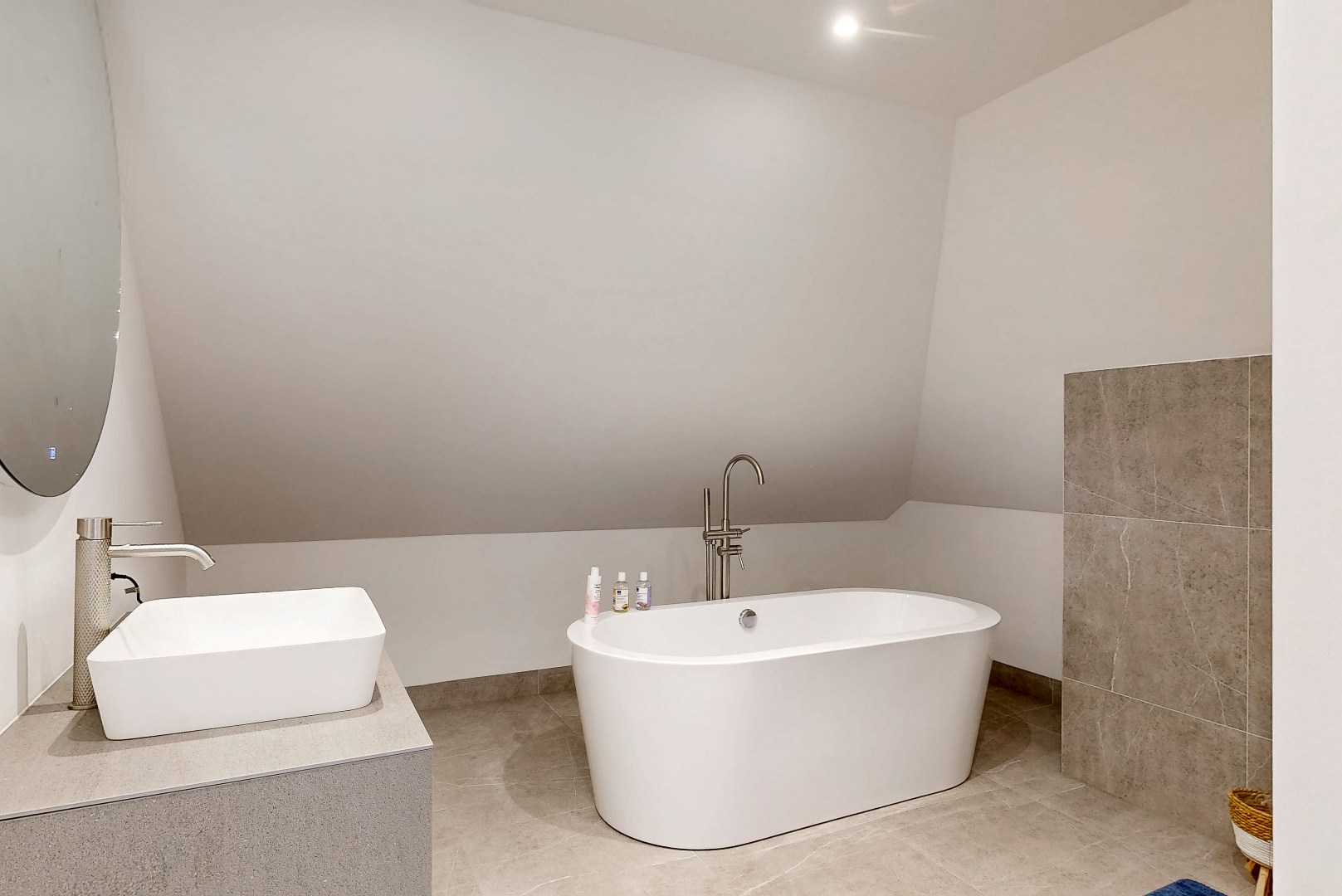 De luxe badkamer ligt ook op de tweede verdieping. Deze is compleet uitgerust met een douche, een vrijstaand ligbad, een wastafel met opbergruimte en spiegel én een toilet – alles wat je nodig hebt voor een heerlijk ontspannen start of afsluiting van je dag.