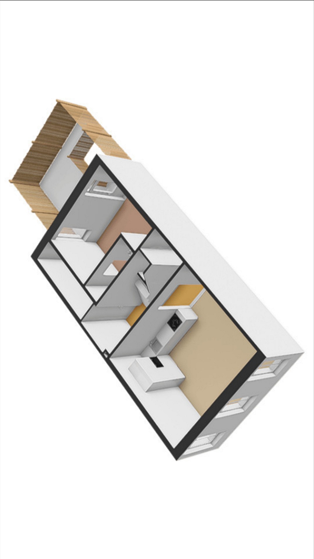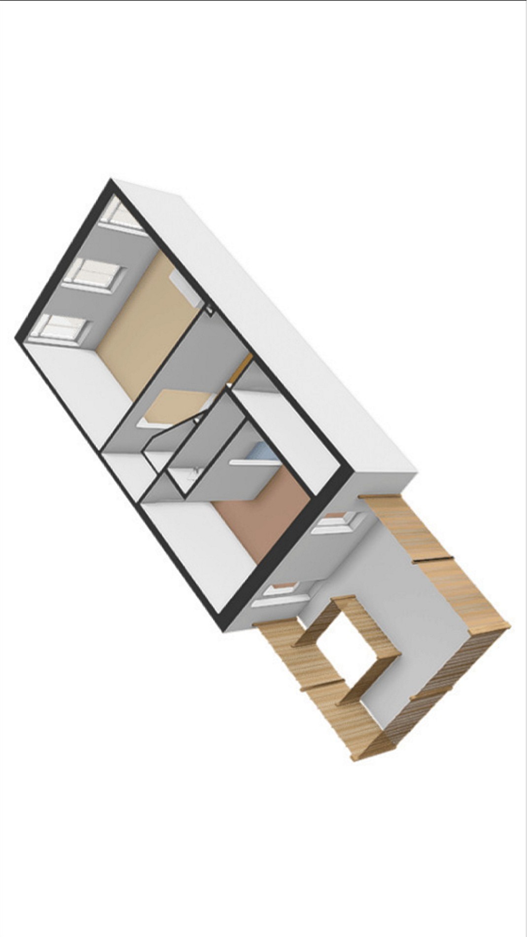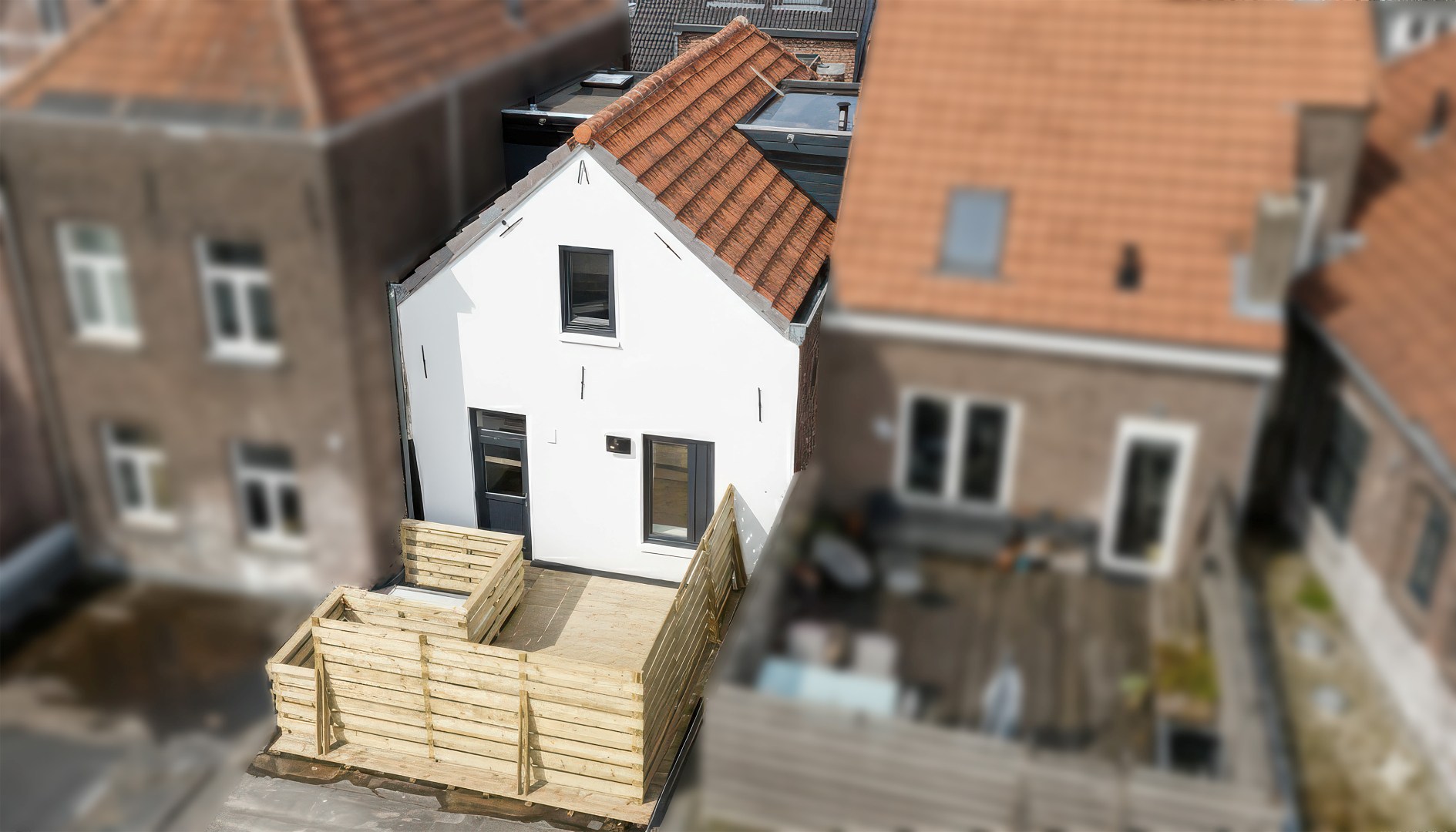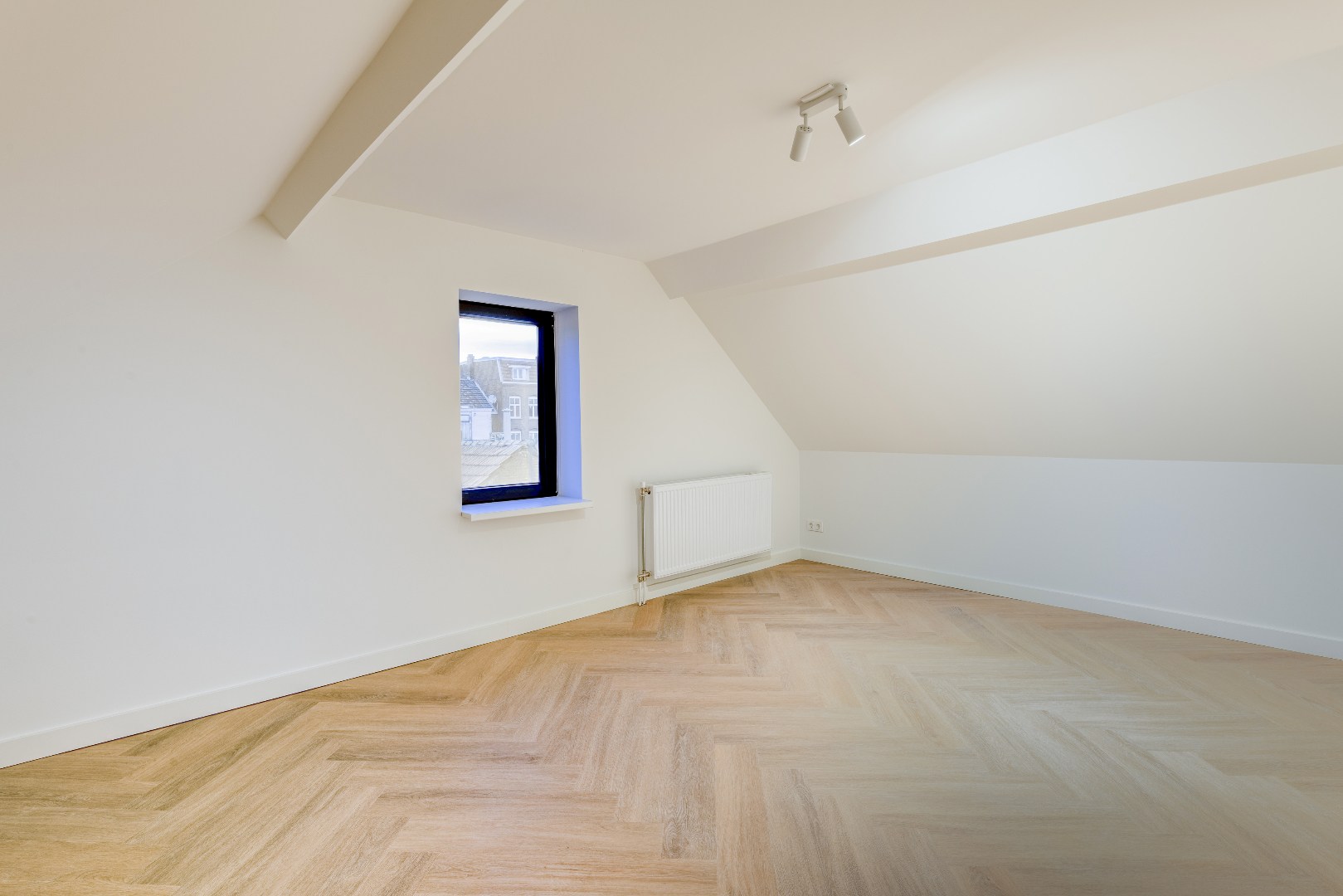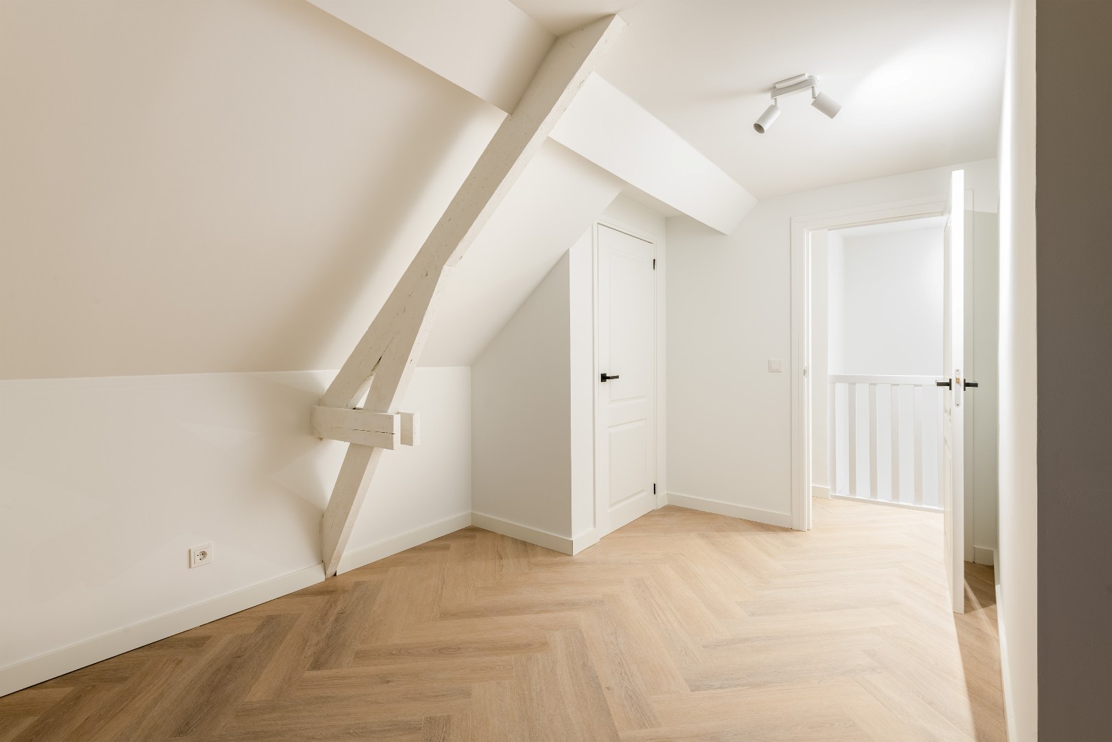 De slaapkamer op de eerste verdieping geeft directe toegang tot het dakterras. Op zonnige dagen kun je hier de deuren wijd openzetten, waardoor binnen en buiten naadloos in elkaar overlopen.