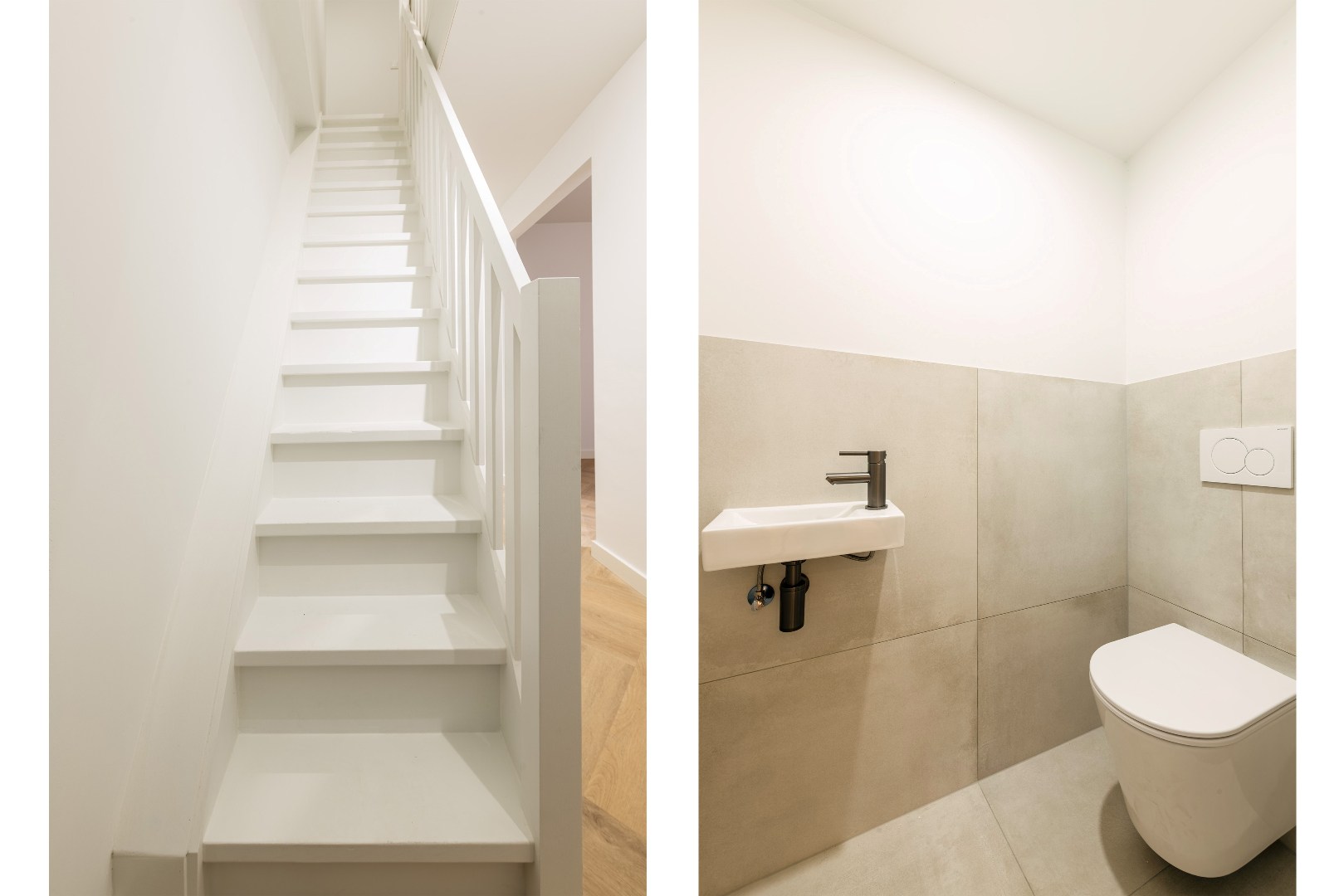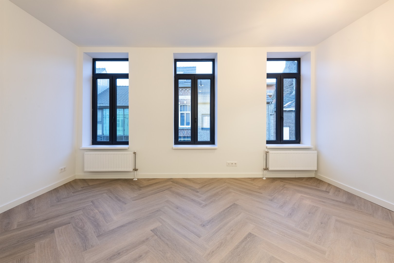 Het appartement strekt zich uit over de eerste en tweede verdieping en ademt al vanaf binnenkomst een gevoel van kwaliteit. Via de hal bereik je de lichte, ruime woonkamer, afgewerkt met een chique visgraat PVC-vloer. Grote raampartijen laten volop daglicht binnen en zorgen voor een warme, uitnodigende sfeer. De luxe afwerking valt direct op.