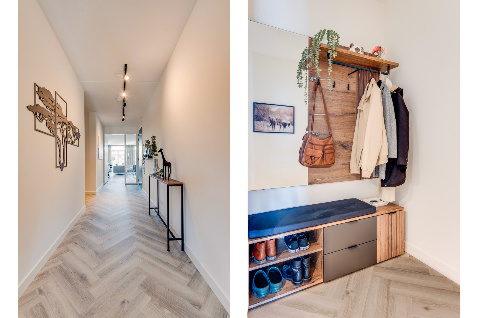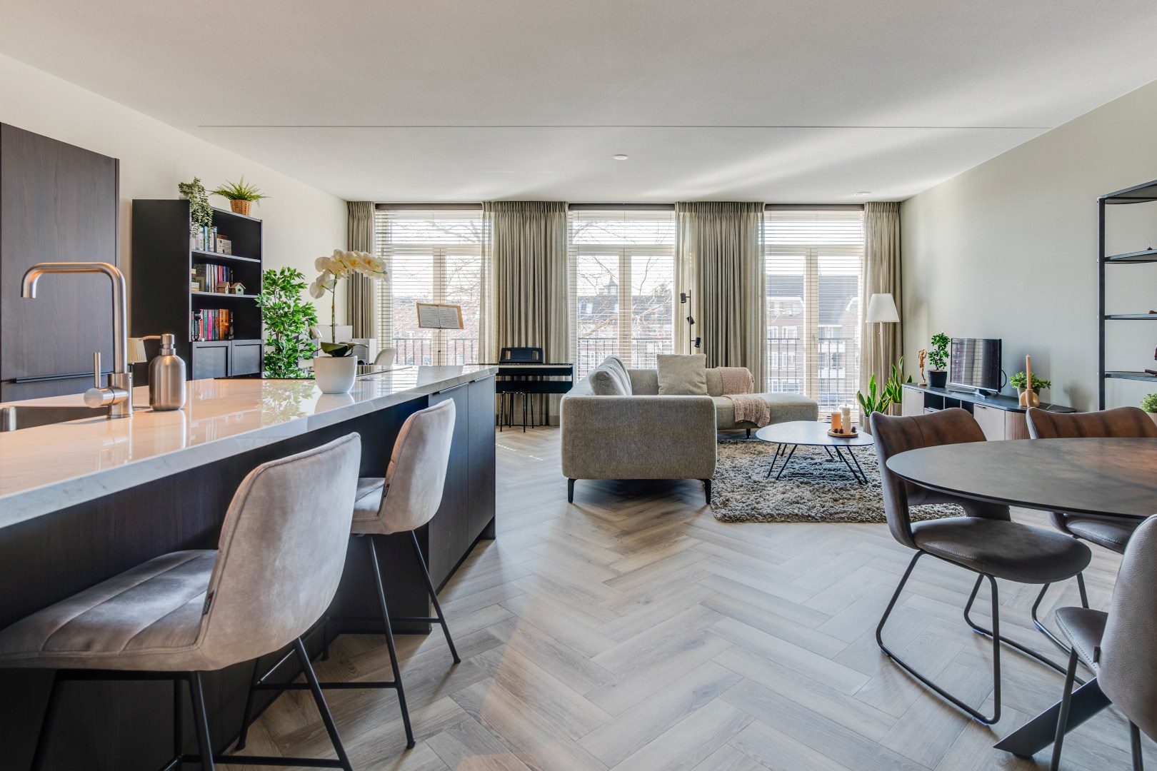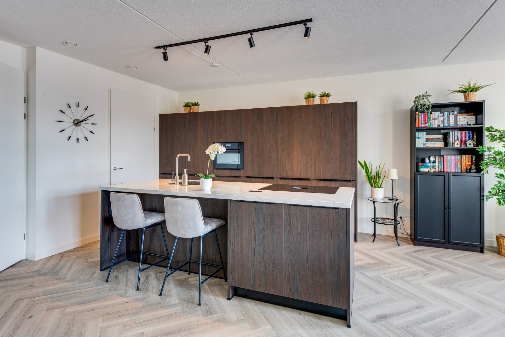 Het hele appartement is voorzien van een stijlvolle pvc-visgraatvloer, wat een luxe en warme sfeer geeft. Vanuit de hal loop je rechts de woonkamer in met een prachtige open keuken met kookeiland. Hier kun je koken terwijl je in contact blijft met je gasten. Naast de keuken is een praktische bijkeuken, perfect voor voorraad of huishoudelijke apparatuur.