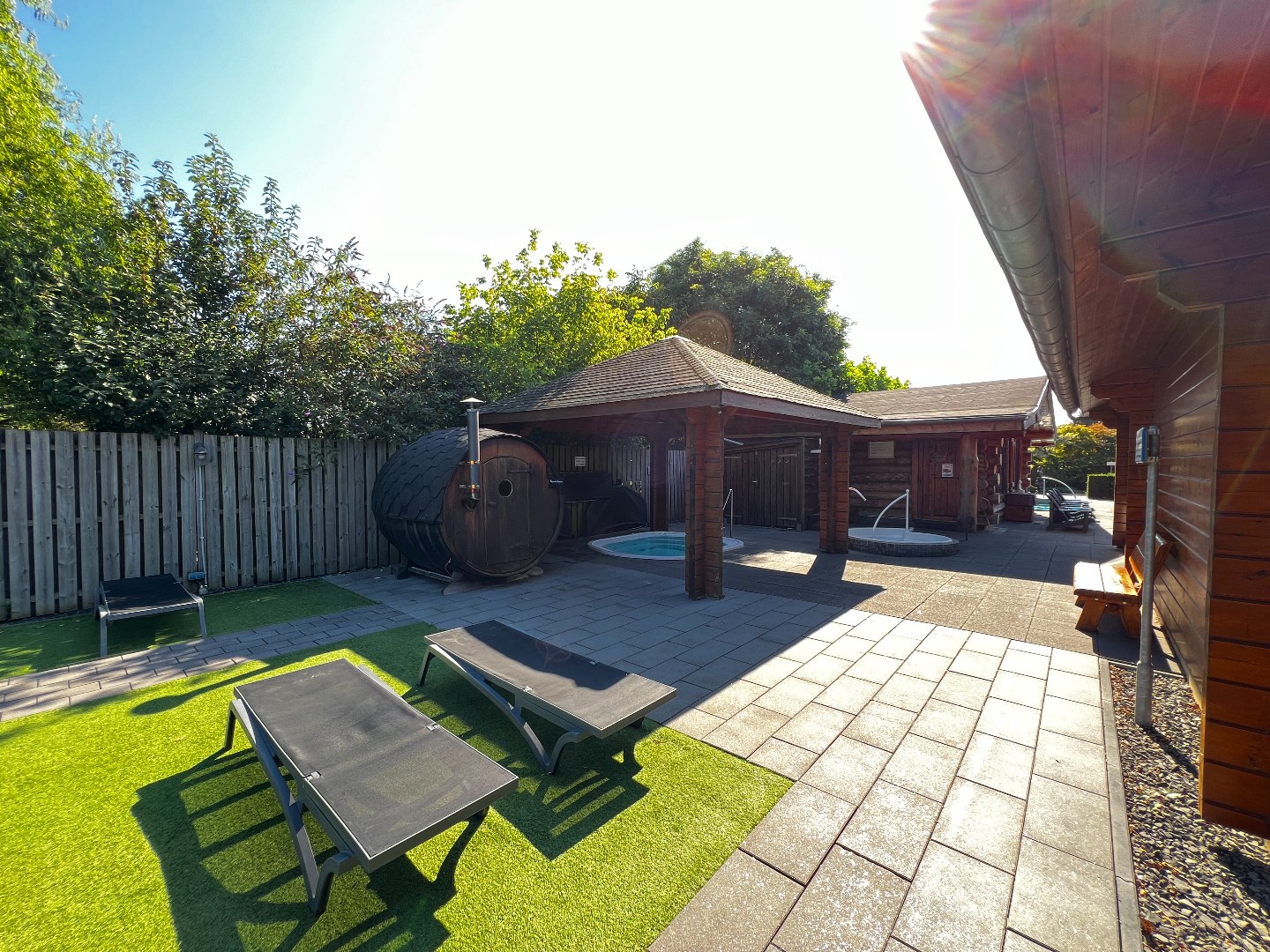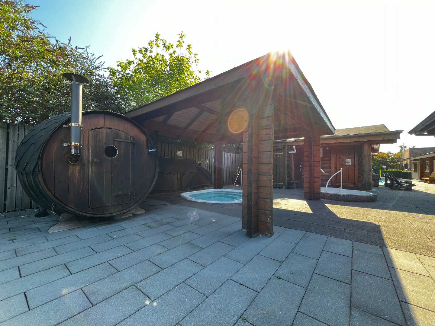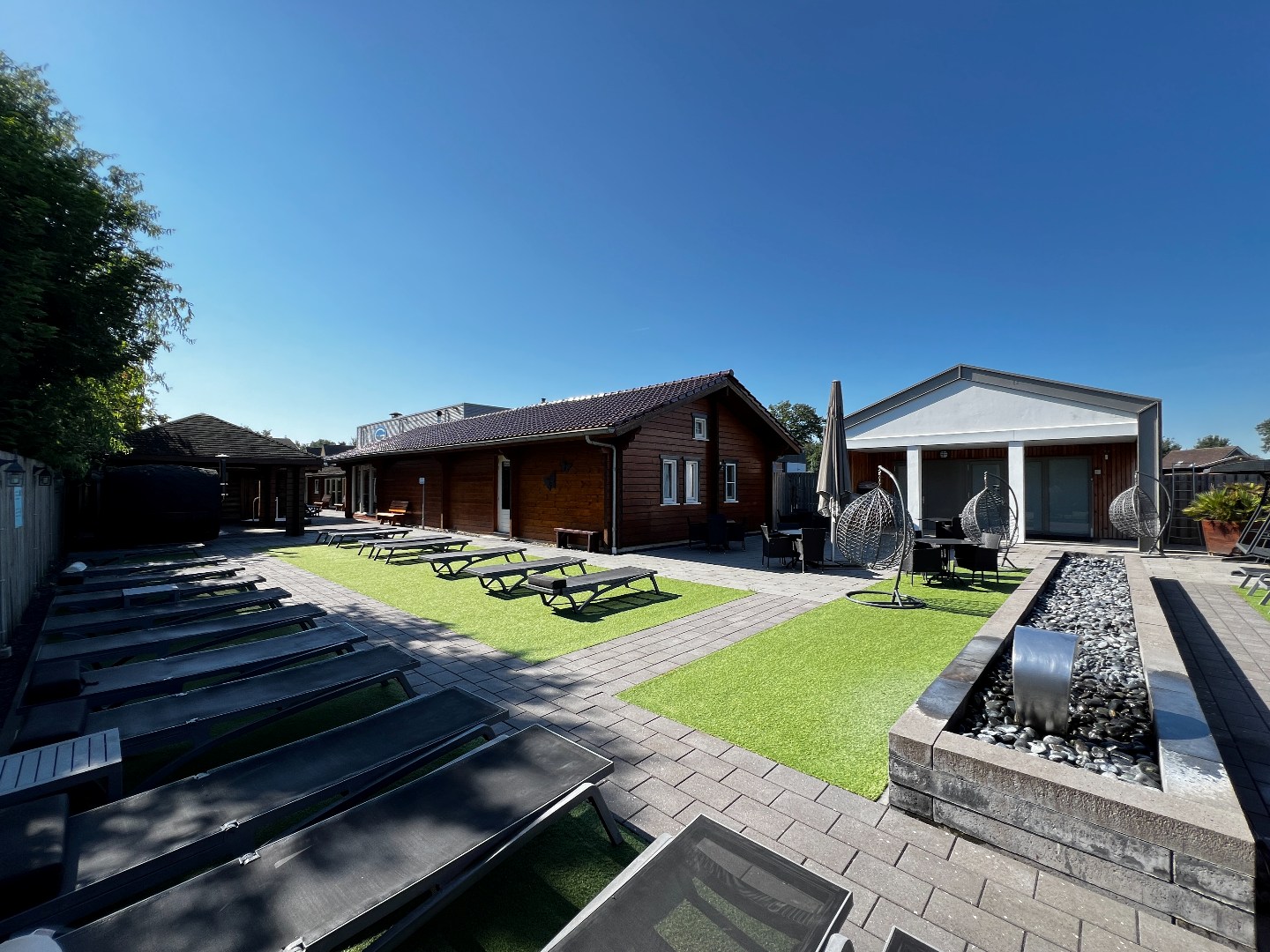 Rondom het wellnesscentrum ligt een fraai aangelegde tuin die rust en privacy garandeert. In deze buitenruimte kunnen gasten ontspannen in de wellnesstuin of op de ligweide en genieten van bijzondere faciliteiten zoals een wijnvatsauna, een whirlpool, een dompelbad en een banja sauna. Voor wie behoefte heeft aan extra rust en comfort is er bovendien een lounge- en slaapruimte waar in alle stilte kan worden ontspannen. De buitenruimte biedt daarnaast volop mogelijkheden voor uitbreiding van behandelfaciliteiten of het creëren van een meditatietuin of extra ontspanningszones. Dankzij de ruime parkeergelegenheid is het wellnesscentrum bovendien uitstekend toegankelijk voor bezoekers.