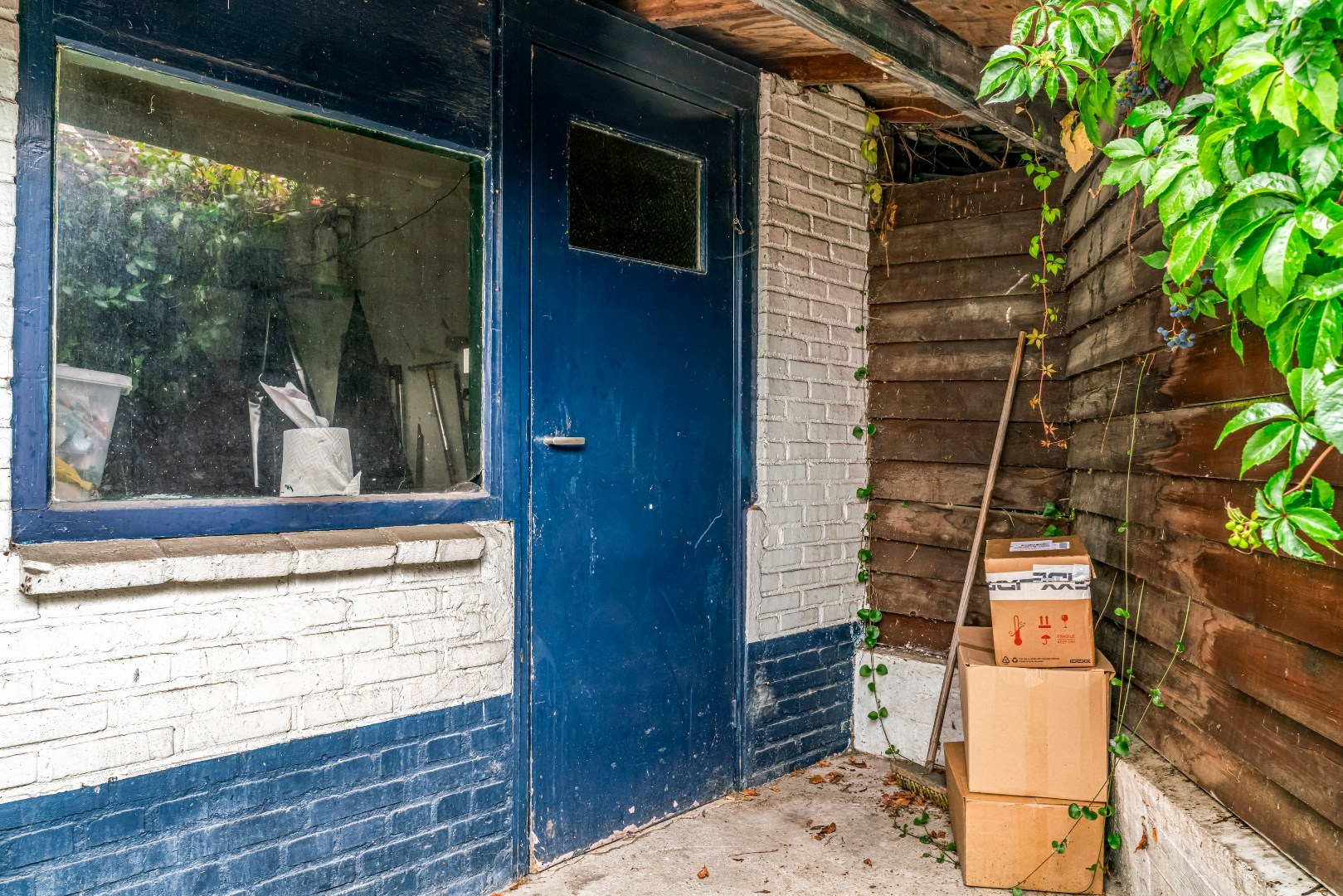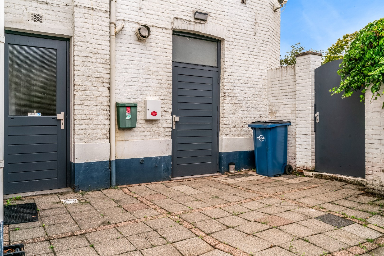 Aan de achterzijde bevindt zich een geheel betegelde tuin met een eigen achterom.