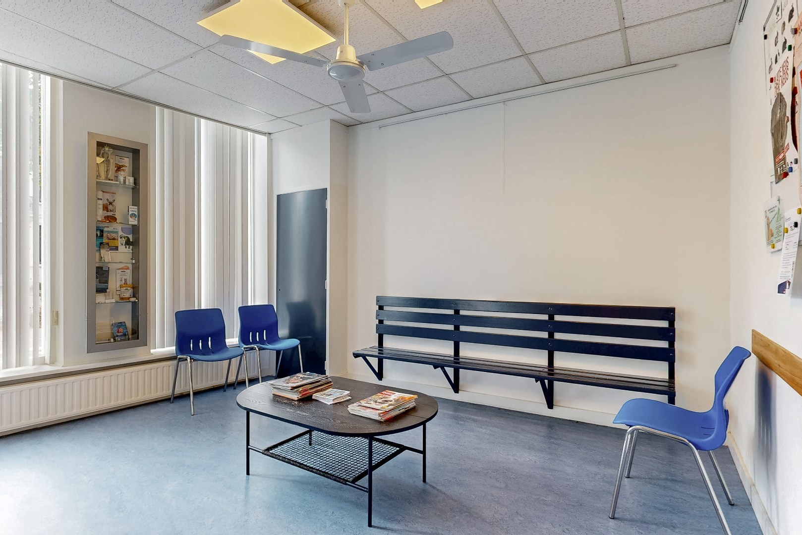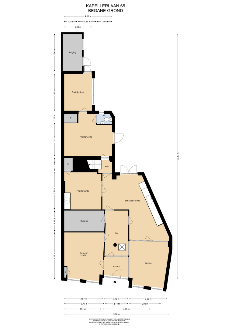 Bij binnenkomst treft u een entree/ontvangsthal die toegang biedt tot de ontvangstruimte en overige (kantoor)ruimtes. In totaal zijn er zes ruimtes aanwezig, die flexibel zijn in te delen. Momenteel worden vier van de ruimtes gebruikt als behandelkamer. Deze ruimtes zijn voorzien van een tegelvloer. De overige twee ruimtes worden als wachtkamer en kantoor/receptie gebruikt. Drie van de ruimtes beschikken over praktische kastruimte. Twee ruimtes zijn uitgerust met een eigen pantry voorzien van een wasbak met mengkraan en extra kastruimte. Daarnaast zijn er twee separate bergingen aanwezig. De toiletruimte is uitgevoerd met een toilet en fonteintje.