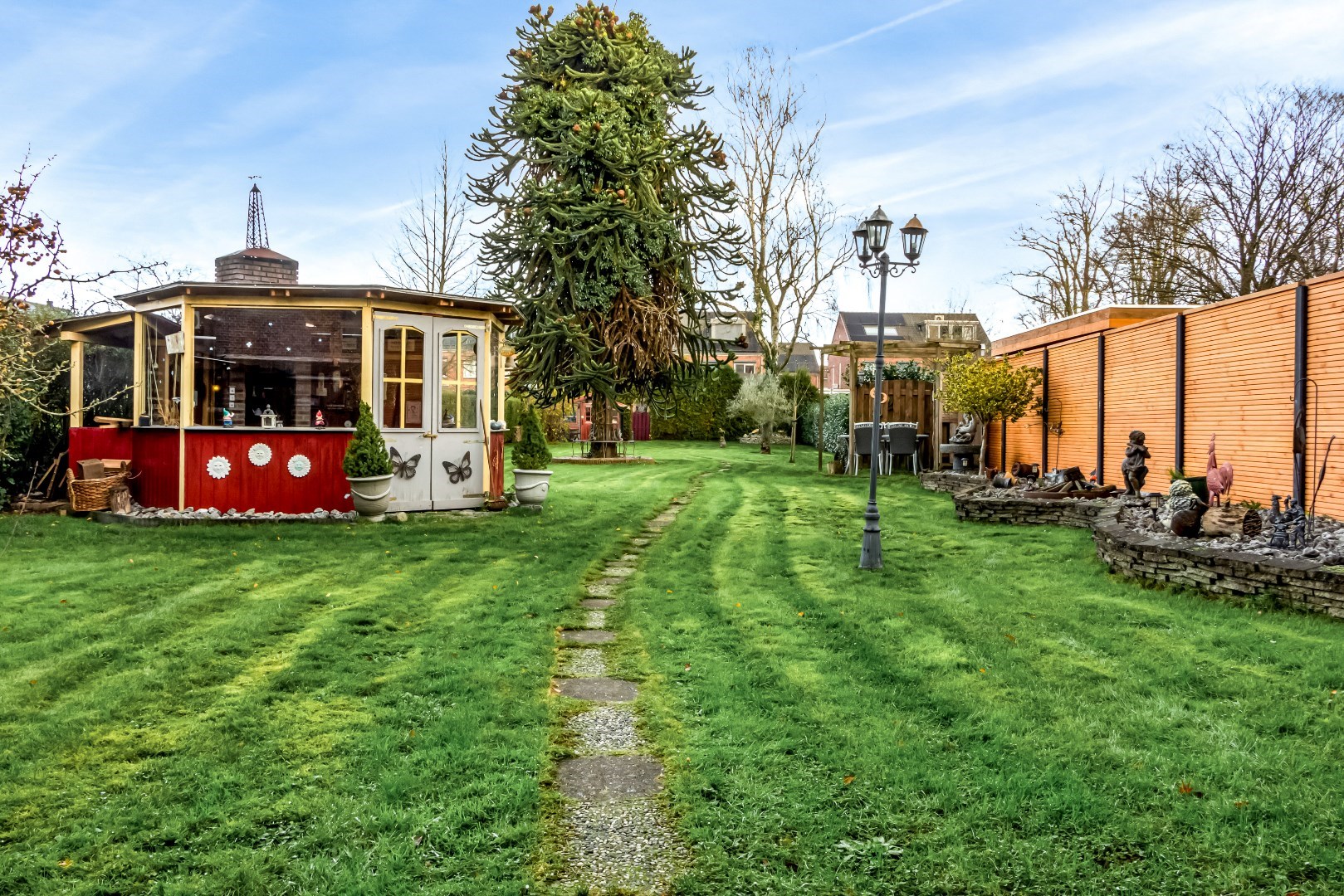 De riante achtertuin is vanuit de opslagruimte toegankelijk en tevens vanuit de zijkant en achterzijde van het pand via een eigen weg. De tuin is ruim en als je groene vingers hebt, dan kun je hier uren in vertoeven. Ook voor kinderen is deze tuin ideaal! Genoeg ruimte om te spelen! Voor in de tuin ligt een theehuis met open haard waar je gezellig kunt zitten met familie of vrienden onder het genot van een hapje en drankje. Achterin de tuin bevindt zich een tuinhuis, waar de fietsen gestald kunnen worden of je tuingereedschap in opgeborgen kan worden. Aan de achterzijde liggen twee grote garages waar voldoende ruimte is om diverse (grote) voertuigen in te stallen. Deze zijn bereikbaar via een afgesloten eigen weg.