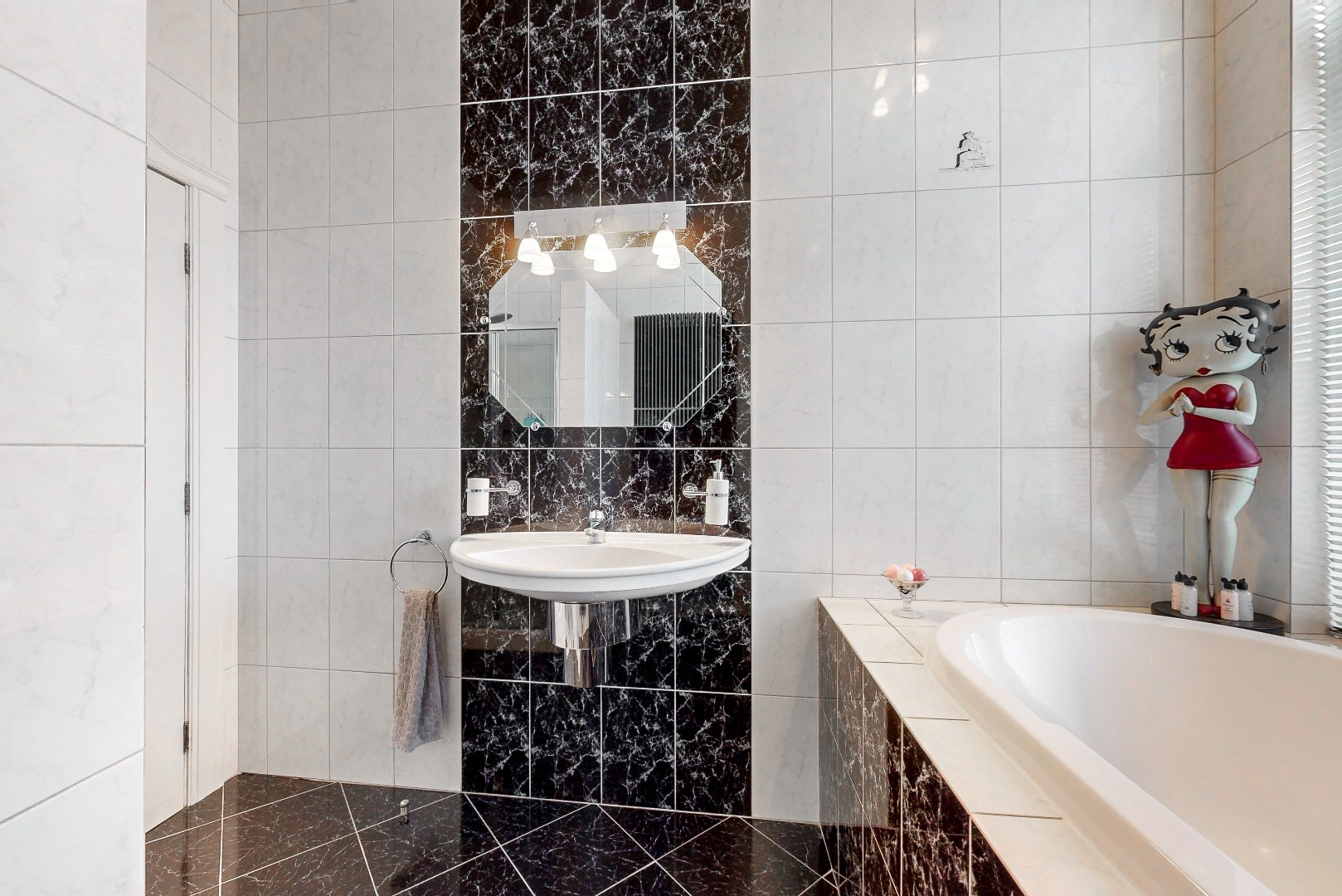 Ook de badkamer bevindt zich op de eerste verdieping. Deze beschikt over een wastafel, een ligbad en een douche. Het toilet bevindt zich apart op de eerste verdieping.