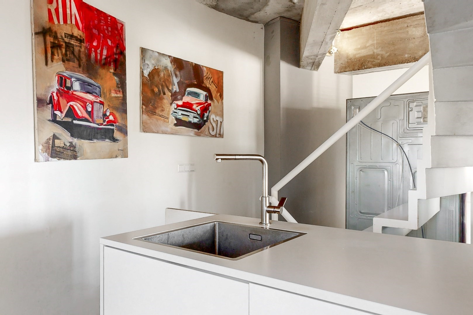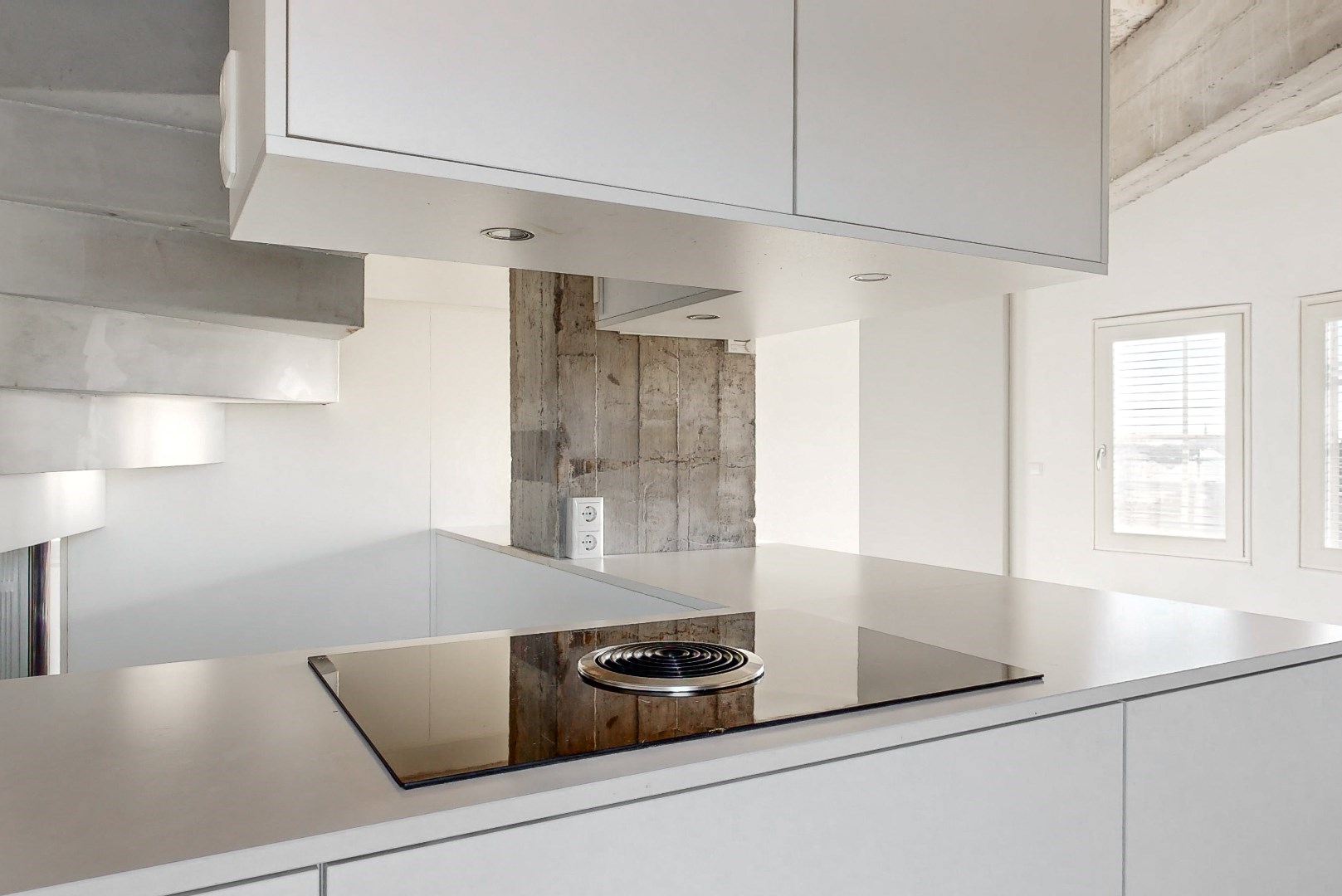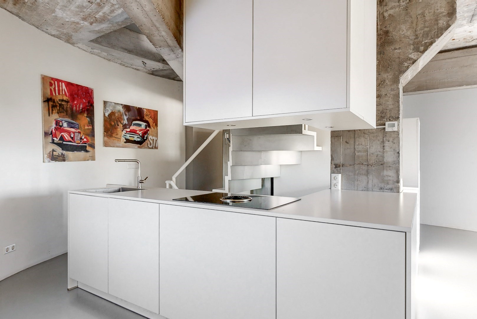 Via een vaste trap bereik je de tweede verdieping waar de grote woonkeuken zich bevindt. Deze staat in het midden van de ruimte en loopt in een U-vorm. De keuken beschikt over een inductiekookplaat met downdraftafzuiging, een wasbak, koelkast en opbergruimte.