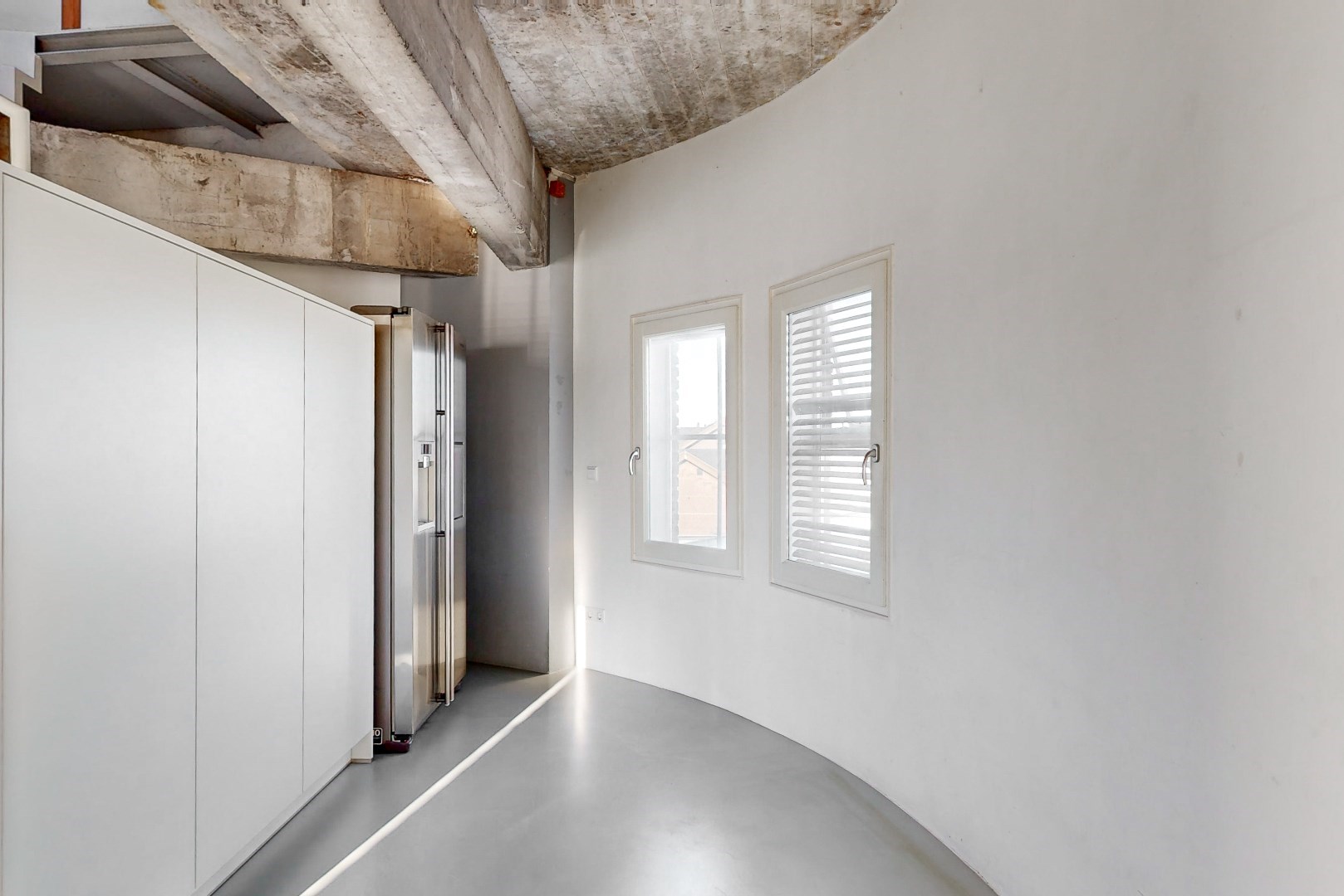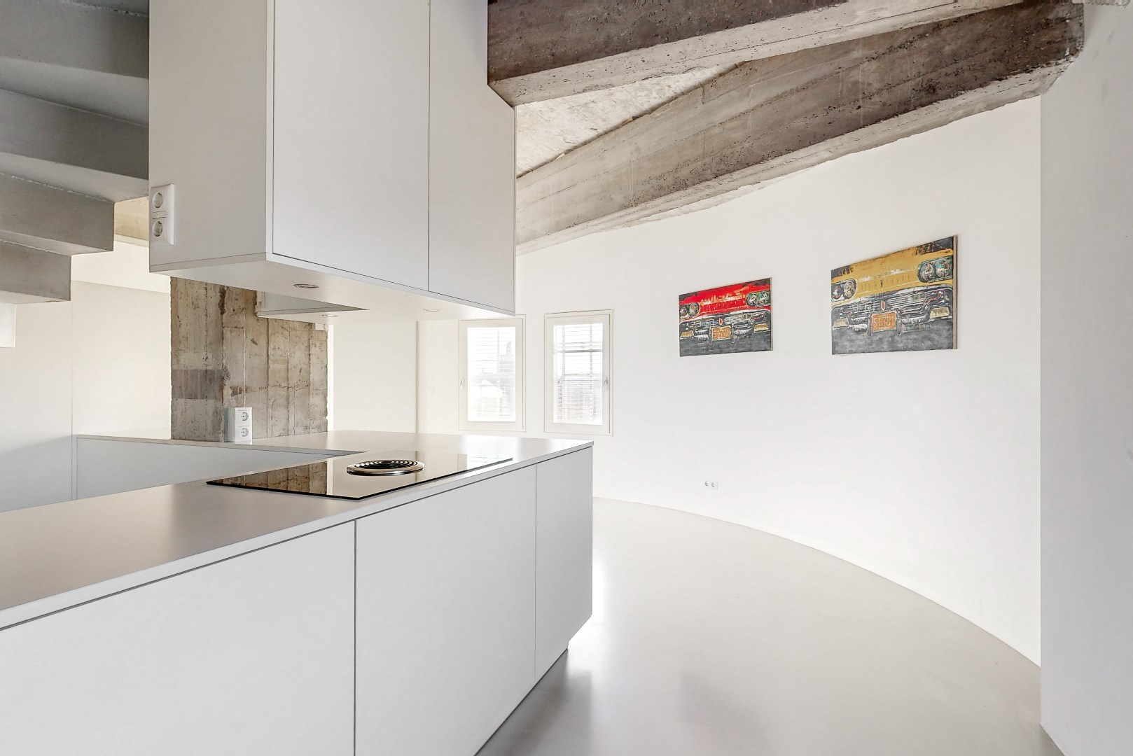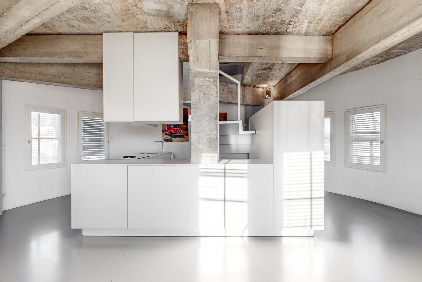 Via een vaste trap bereik je de tweede verdieping waar de grote woonkeuken zich bevindt. Deze staat in het midden van de ruimte en loopt in een U-vorm. De keuken beschikt over een inductiekookplaat met downdraftafzuiging, een wasbak, koelkast en opbergruimte.