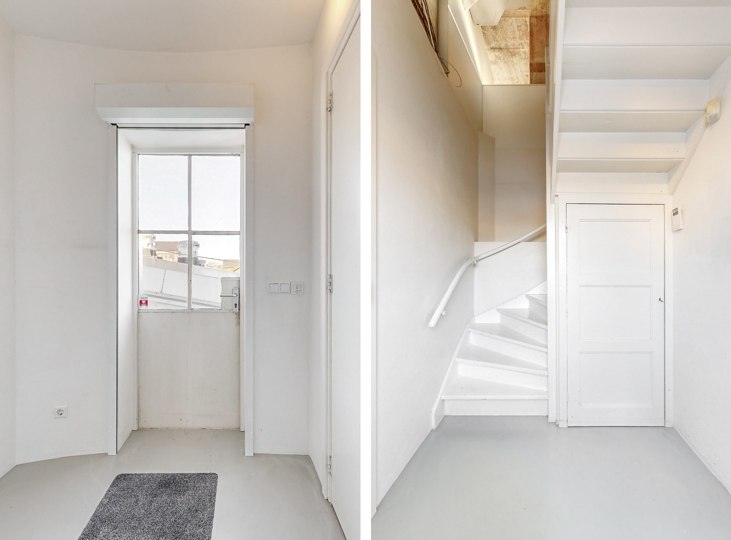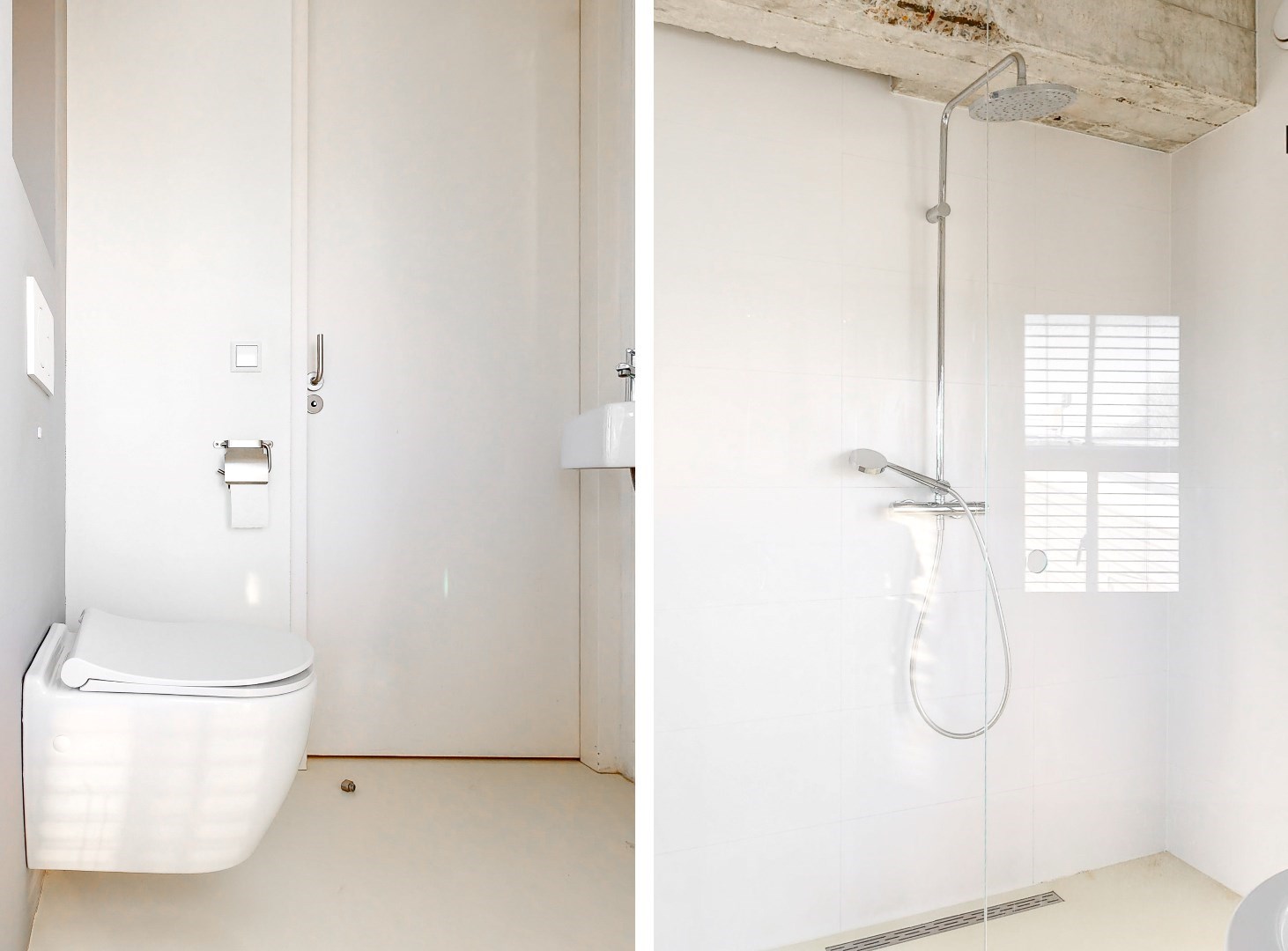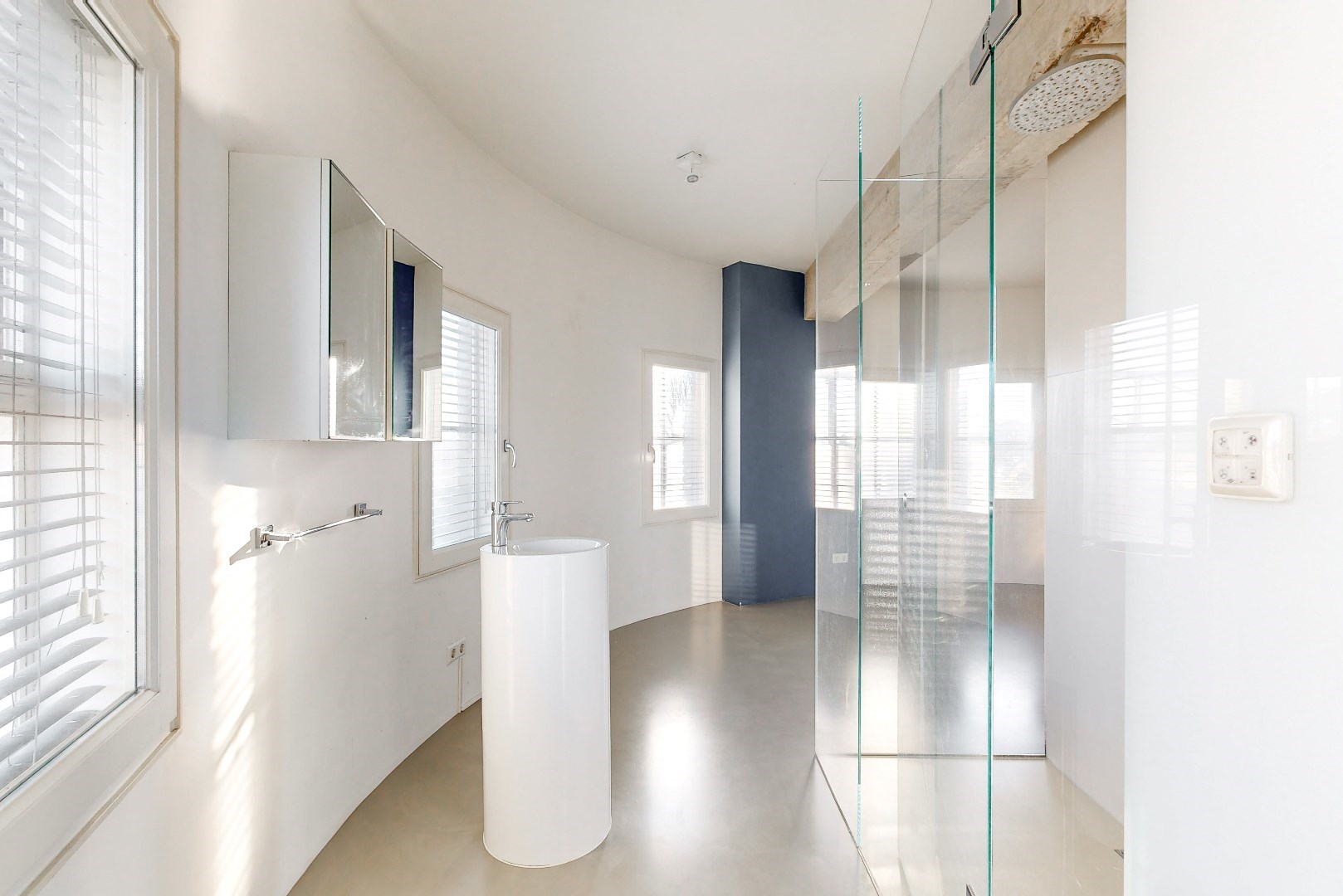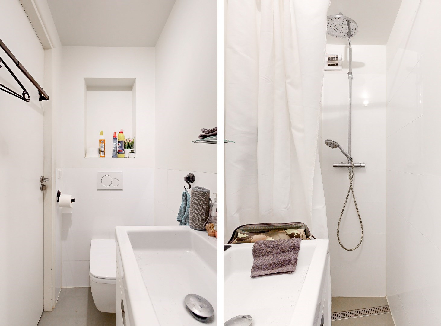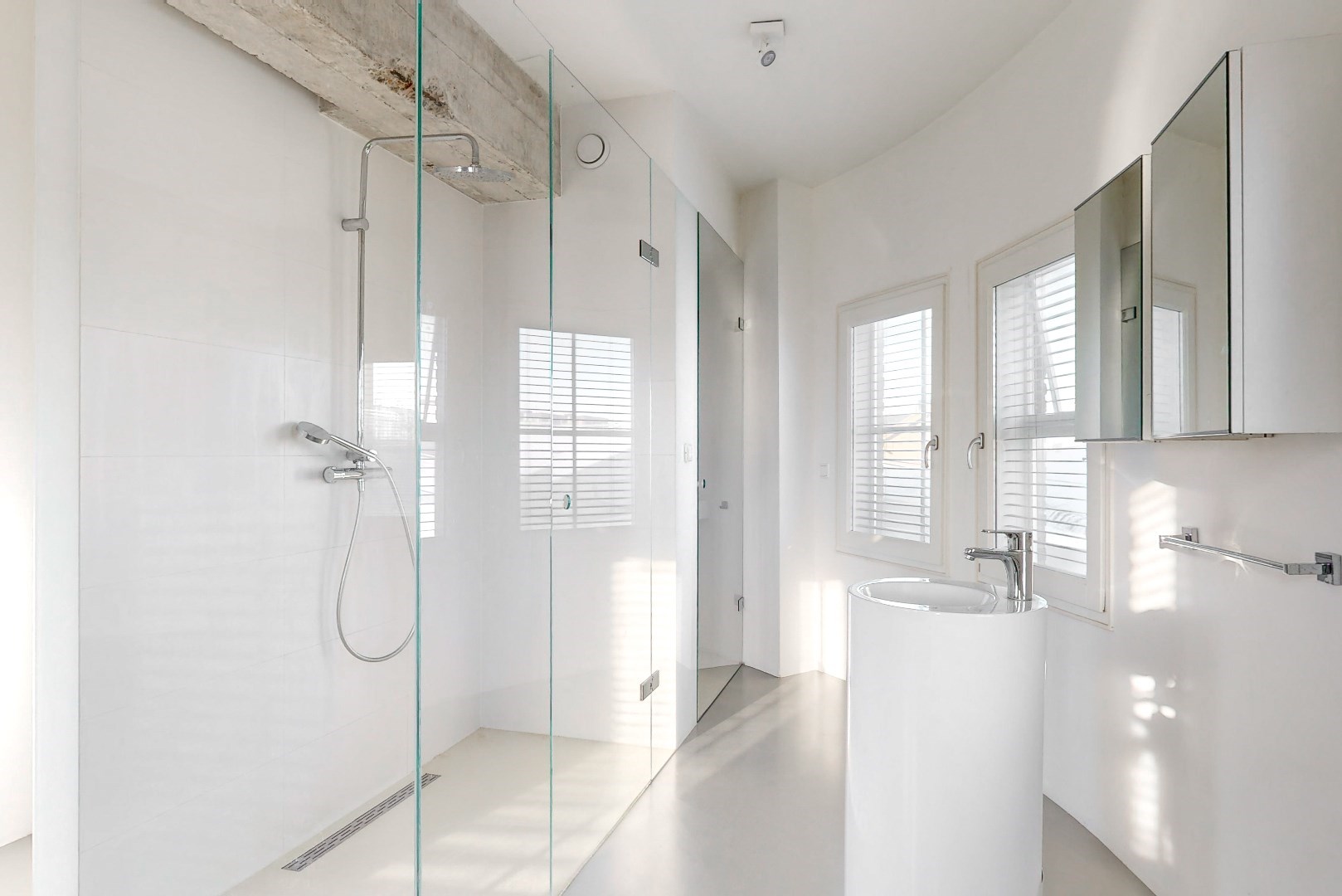 Het appartement is bereikbaar via een eigen ingang. Het appartement heeft drie verdiepingen. Via een eigen entree kom je binnen op de eerste verdieping. Hier bevindt zich de badkamer en de slaapkamer of woonkamer. De badkamer beschikt over een inloopdouche, toilet, wastafel en twee opbergkastjes met spiegels.