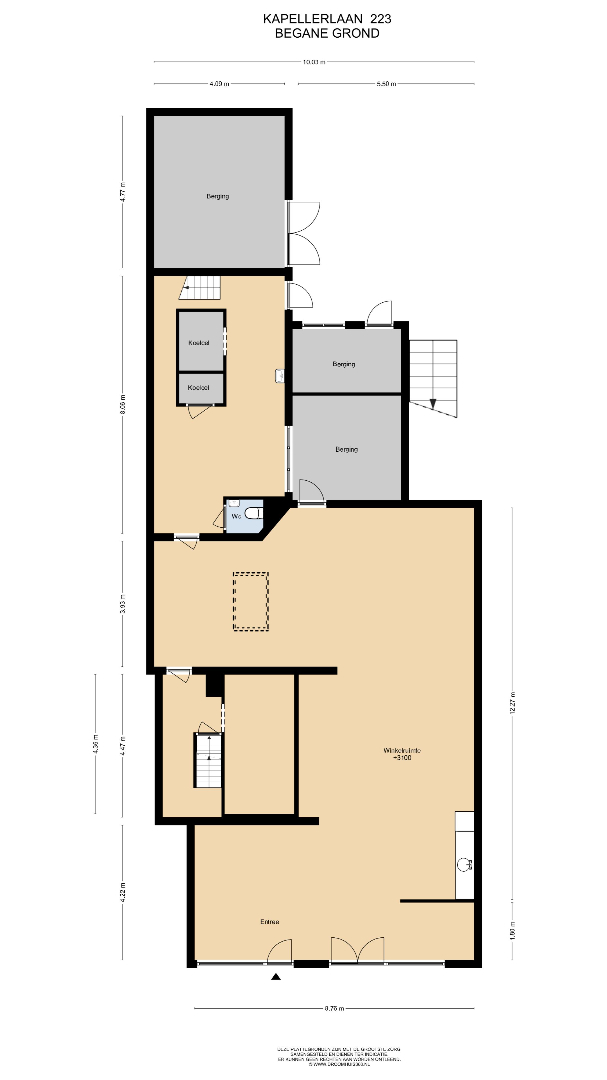 Op de begane grond bevindt zich een grote winkelruimte met achterliggende voorraadruimte/magazijn en een koelcel. De winkelruimte beschikt over een grote toonbank met vitrine en een keukenblok. De winkelruimte is ca. 100 m². De opslagruimte is ca. 33 m². Tevens bevindt zich een toilet in de opslagruimte. Ook bevindt zich nog een kantoorruimte op de begane grond. Deze is ca. 9 m² groot.