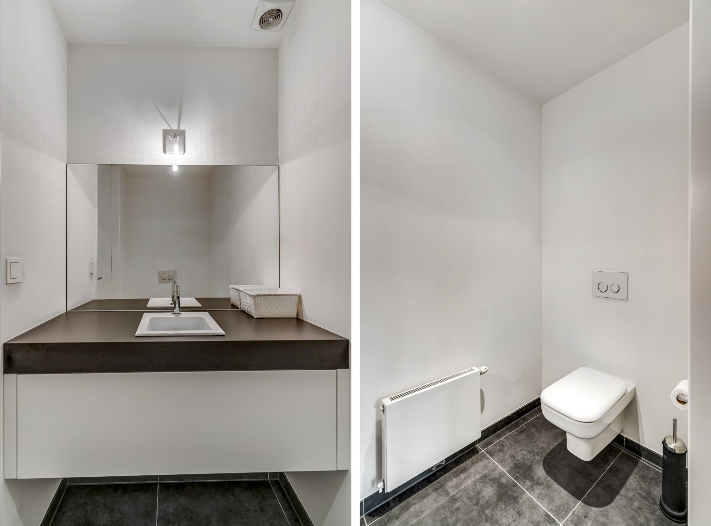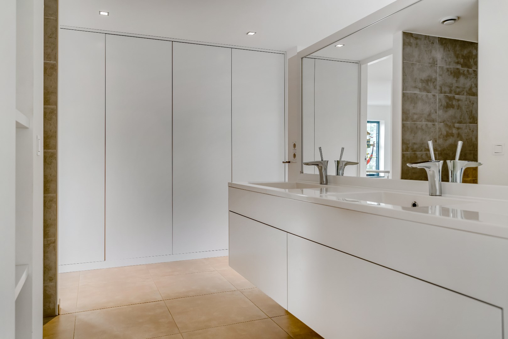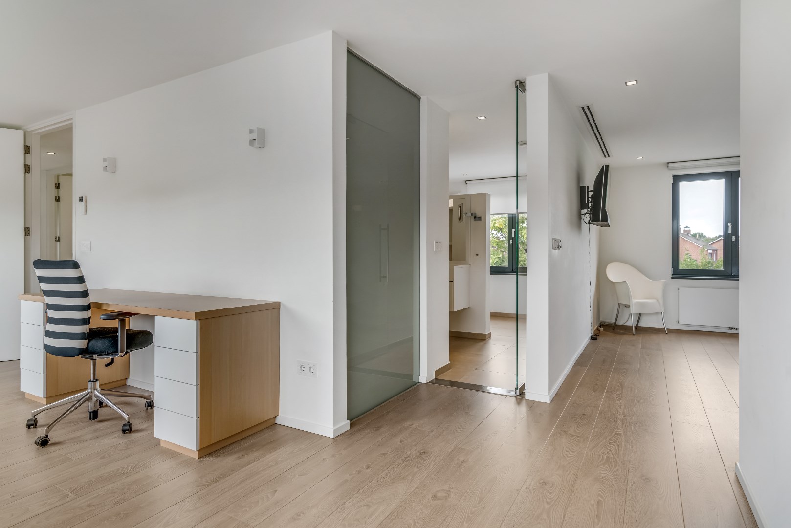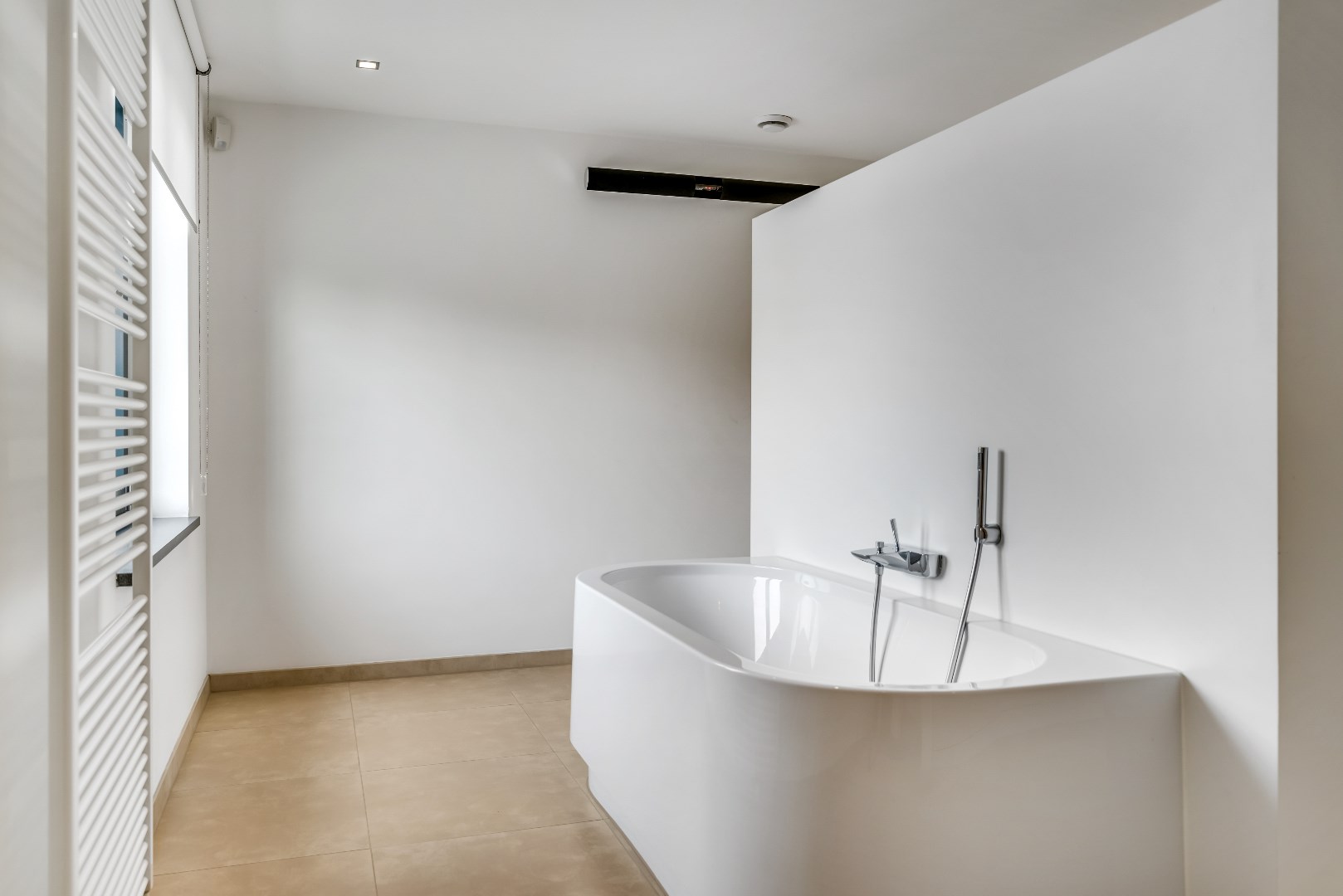 Vanuit de slaapkamer leidt een glazen deur rechtstreeks naar de ruime badkamer met vloerverwarming, met in het midden een dubbele wastafel; deze staat tegen een scheidingswand waarachter zich een ligbad bevindt, met tegen de wand een designradiator.