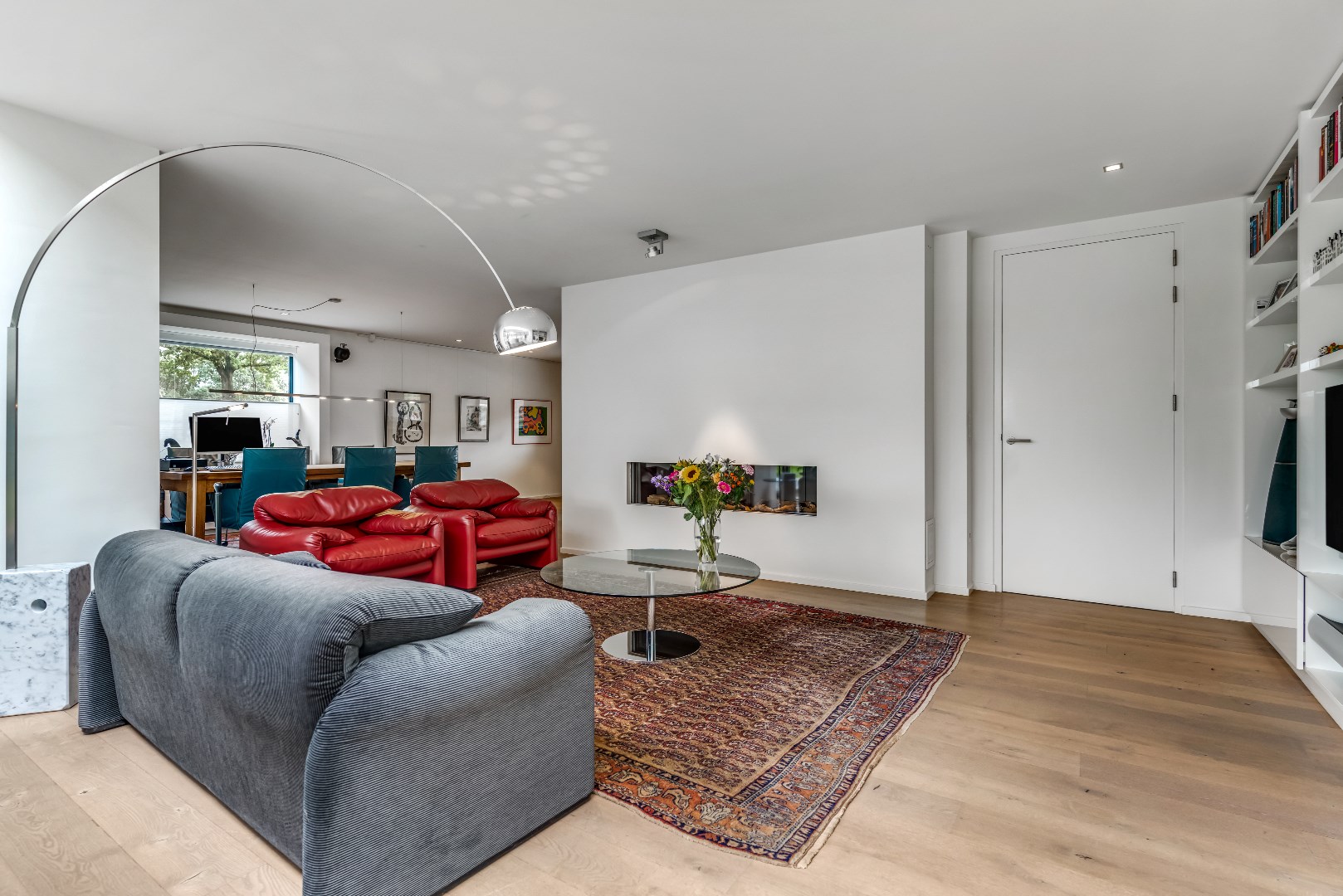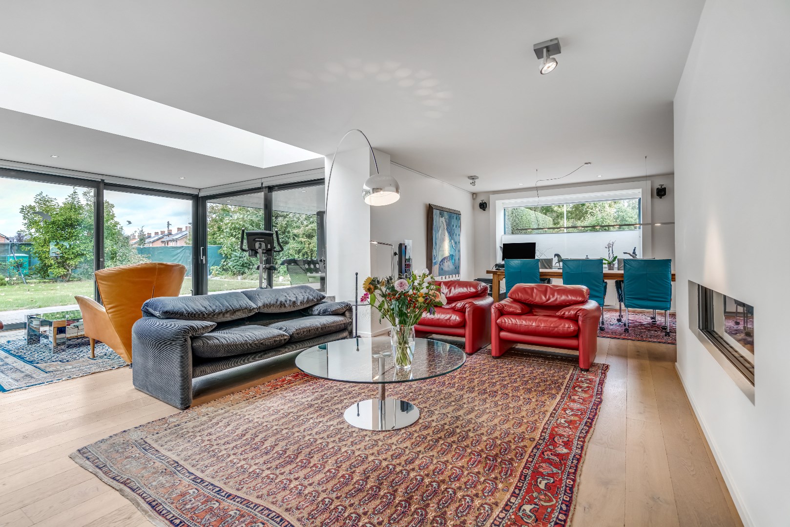 De eiken parketvloer geeft de living een warme uitstraling. Het zitgedeelte heeft een open gashaard en loopt naadloos over in de eethoek met een raam dat zicht biedt op de natuurrijke omgeving.