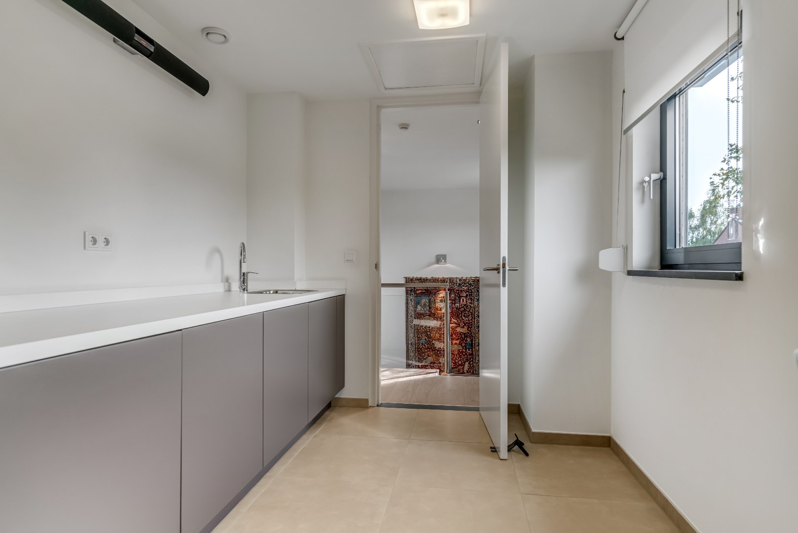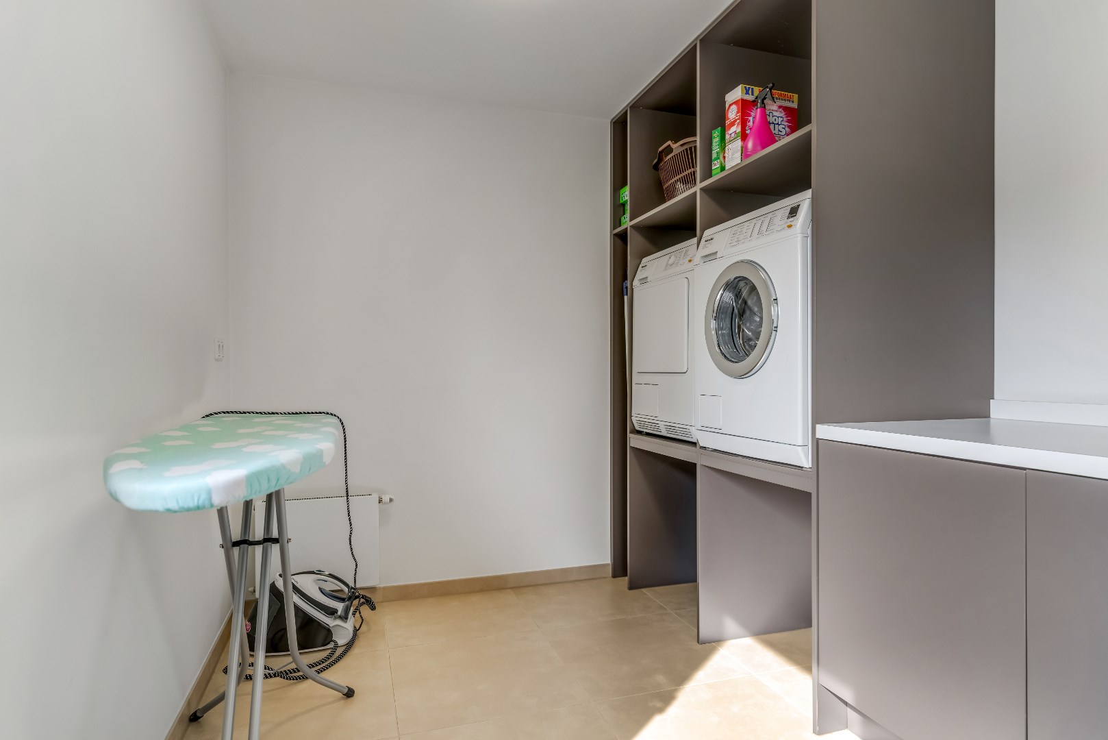 De betegelde wasruimte (10 m²) heeft een aansluiting voor een wasmachine en een droger en beschikt over een groot aanrecht met een wasbak en volop opbergruimte. Deze ruimte biedt zicht op het beloopbare dak van de garage, waarop zich 12 zonnepanelen bevinden.
