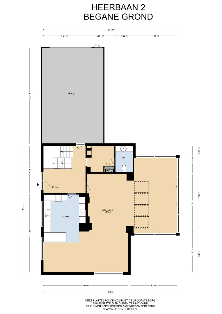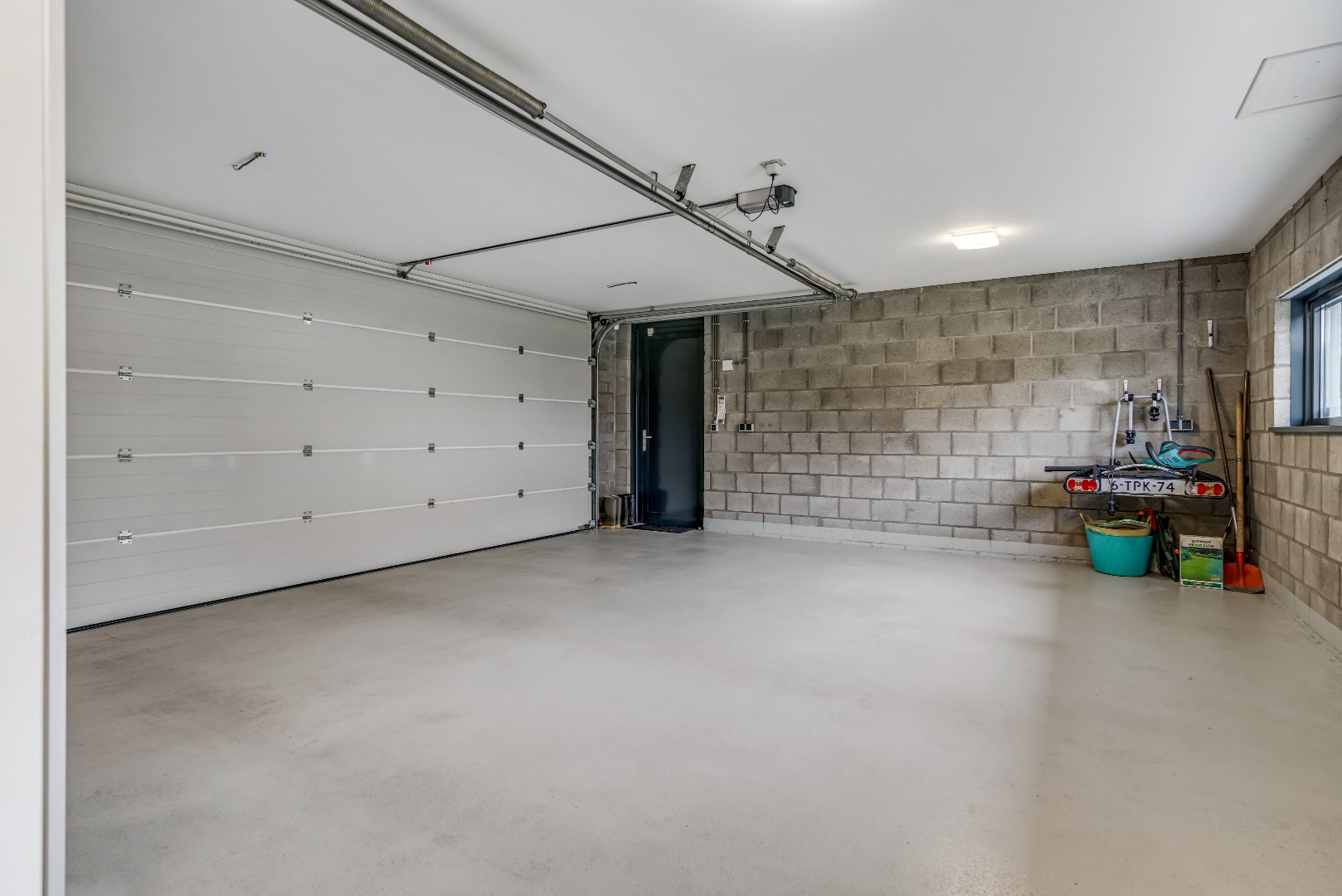 Zowel vanuit de ontvangsthal als een deur aan de buitenzijde is er toegang tot de ruime garage (50 m²) met ruimte voor twee auto’s en een aparte berging. Vanuit de straatzijde is de garage via de oprit met een op afstand bedienbare roldeur bereikbaar.