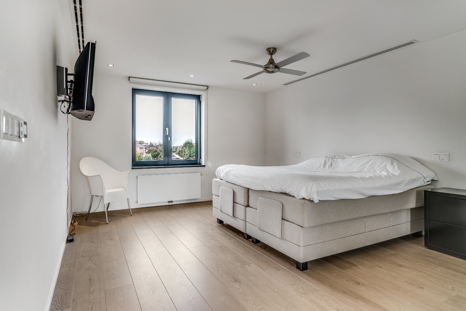 De slaapkamer (41 m²) met laminaatvloer heeft een grote plafondventilator en een grote spiegelwand. De slaapkamer biedt ook een open verbinding met de ruimte aan de straatzijde; deze heeft twee grote raampartijen en is bijvoorbeeld prima geschikt als kantoor- of werkruimte. De gehele slaapkamer is voorzien van airco.