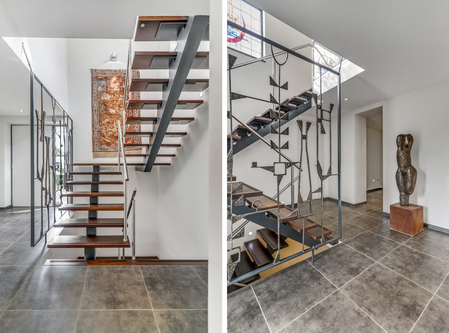 Na binnenkomst via de overdekte entree maakt de zeer ruime ontvangsthal (12 m²) met zijn grootformaat keramische tegels meteen indruk. Aan de rechterzijde bevindt zich een deur naar de keuken, terwijl rechtdoor een deur toegang biedt tot de woonkamer. Aan de linkerzijde gaat een deur naar de garage en via een trap in de entree is er toegang tot diverse kelderruimtes. Er is ook een open verbinding met een ruimte met een garderobenis en meerdere hoedenplanken; hier bevindt zich ook de meterkast en een deur naar een ruim toilet met een vrijhangend closet en een grote wastafel.