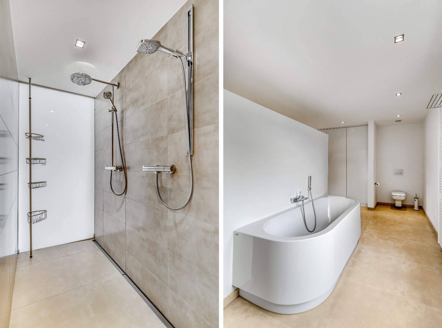 Tegenover de wastafel is de ingang naar de dubbele douche, met onder meer een regendouche. In een andere hoek bevindt zich een vrijhangend toilet. Een wand met meerdere aan het zicht onttrokken inbouwkasten met volop bergruimte maakt het comfort in de badkamer compleet. Zowel de ramen in de slaapkamer als de badkamer hebben op afstand bedienbare zonwering; daarnaast kunnen alle ramen op de bovenverdieping worden verduisterd met screens.