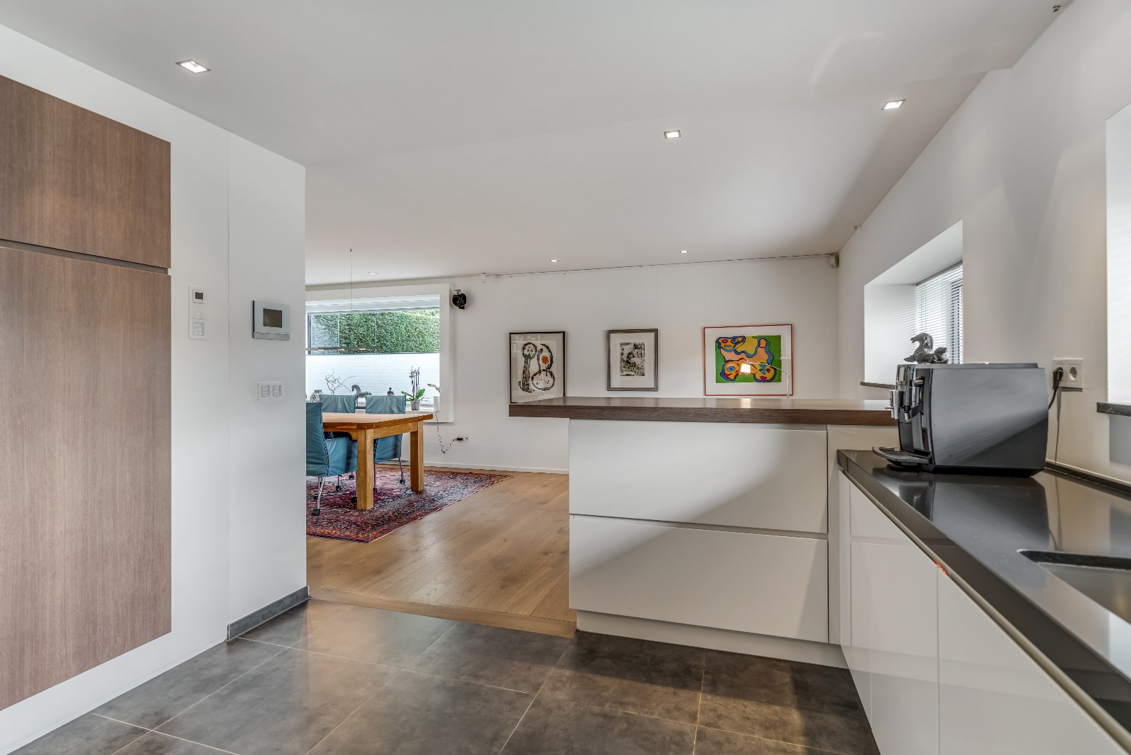 Aan de straatzijde van de grote open ruimte op de begane grond ligt de keuken met een vloer van grootformaat keramische tegels, een eetbar en een groot aanrecht met een stenen werkblad. Als inbouwapparatuur is een vaatwasser, een oven en een magnetron van Miele aanwezig, evenals een 5-pits inductiekookplaat en een rvs afzuigkap. De vele kastjes bieden voldoende opbergruimte voor keukengerei en het deponeren van keukenafval.