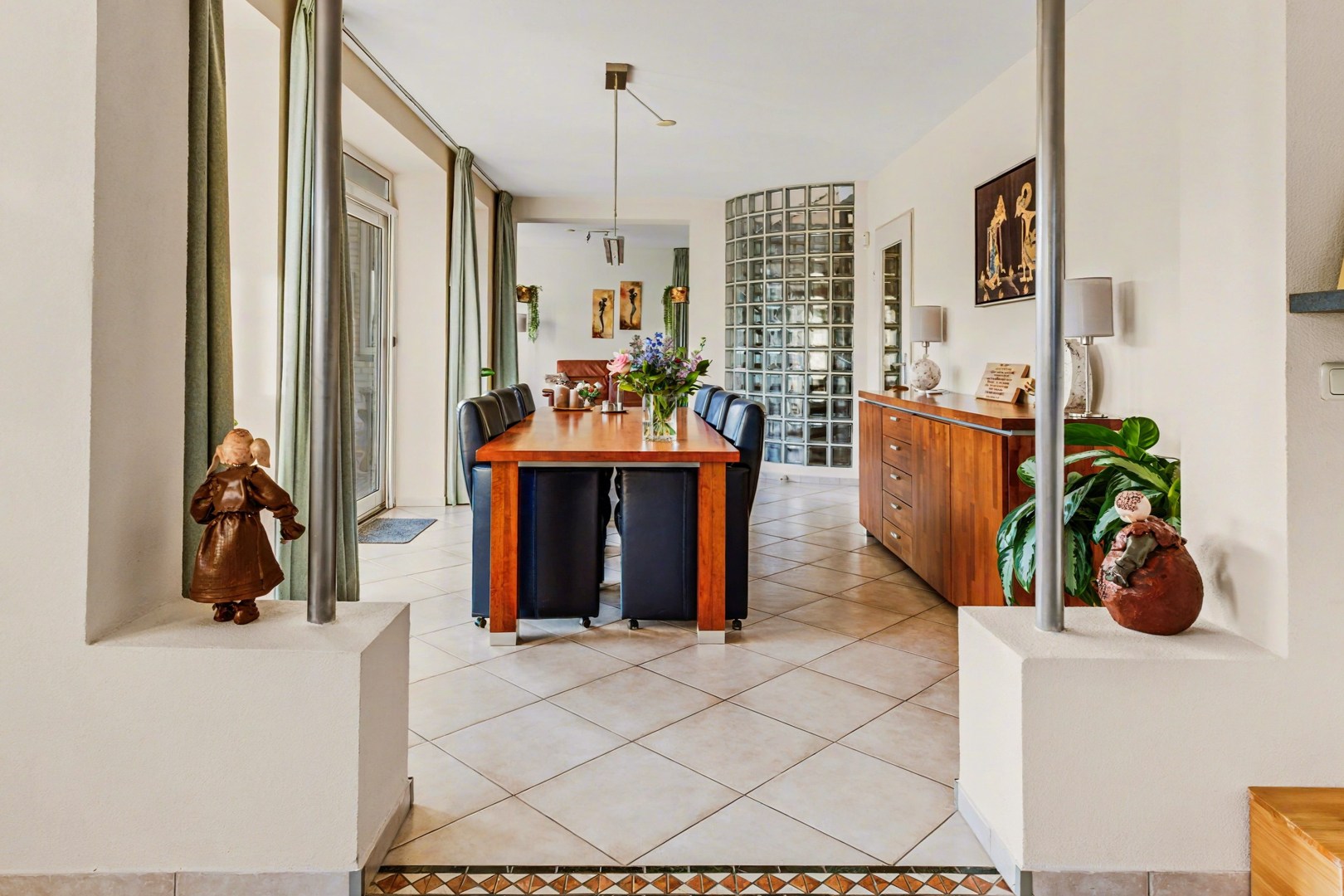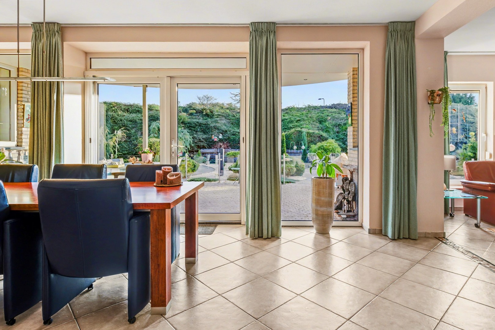 De woonkamer voelt ruim en licht aan en vormt een prettige plek om tot rust te komen. Door de grote ramen valt er veel daglicht naar binnen, wat zorgt voor een open en aangename sfeer. Aangrenzend ligt de eetkamer, een ruimte die uitnodigt om samen te komen. Hier is volop plek voor een royale eettafel waar je gezellig kunt eten, werken of lange avonden kunt doorbrengen met familie en vrienden.
