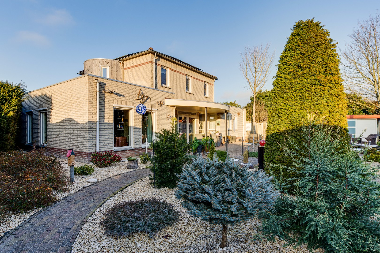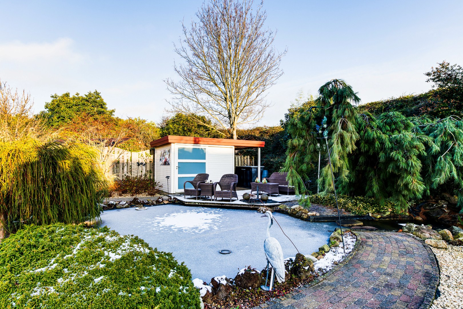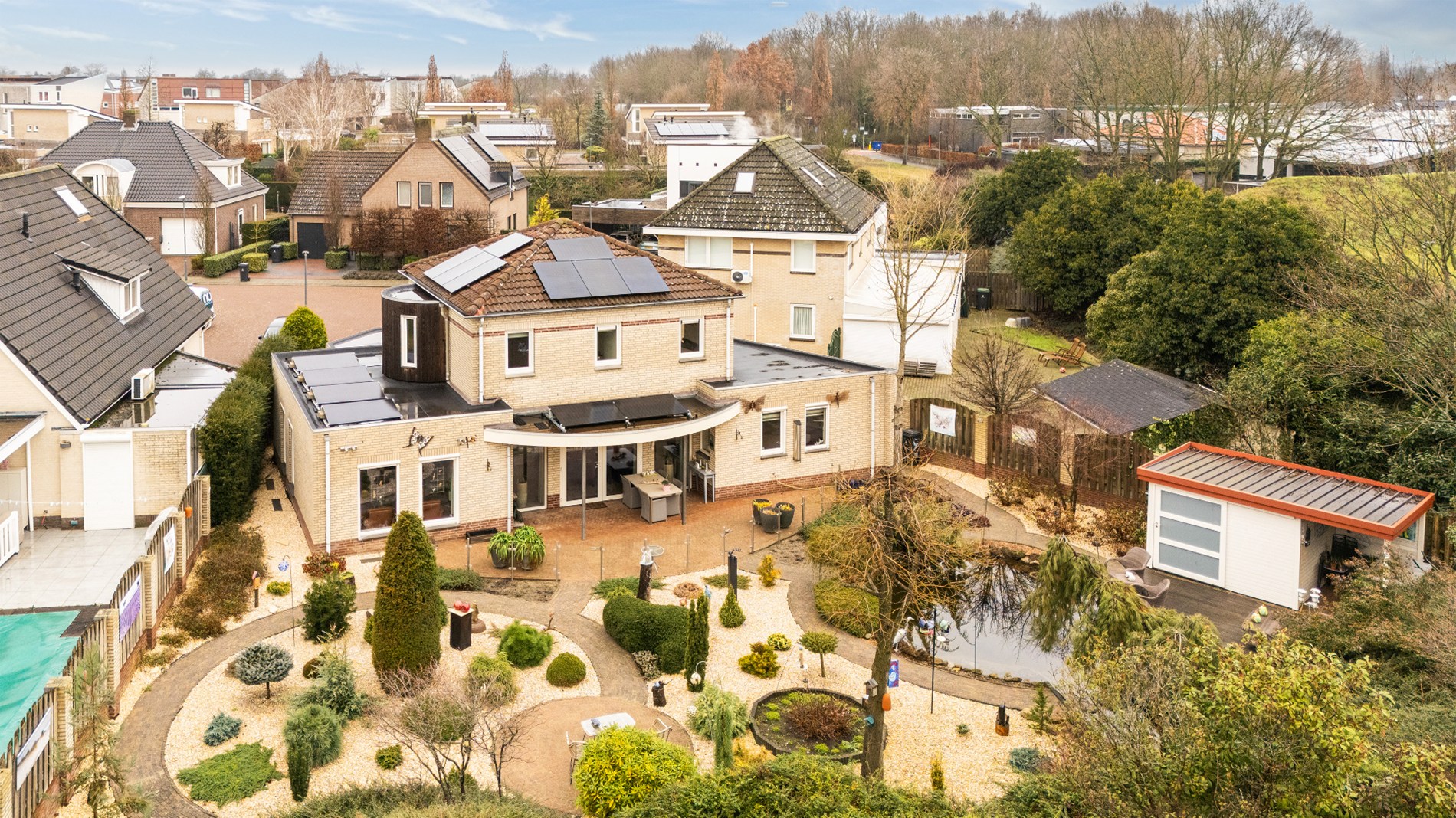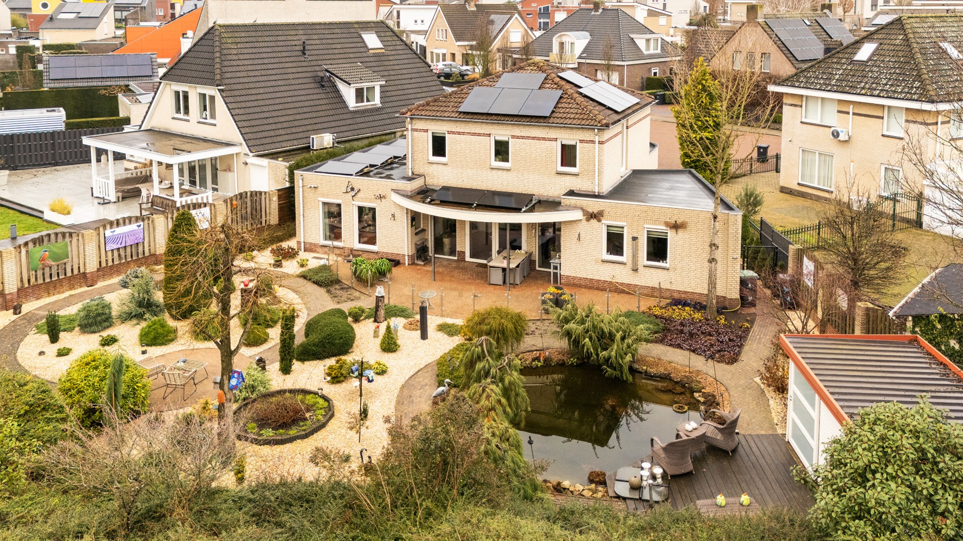 De tuin is zonder twijfel het visitekaartje van deze woning. Met veel zorg en aandacht is hier een bijzondere buitenruimte gecreëerd die een heel eigen karakter heeft. Door de verschillende perkjes ontstaat een levendig en groen geheel, dat tegelijkertijd onderhoudsvriendelijk is. Hierdoor geniet je het hele jaar door van deze tuin, zowel binnen als buiten. De vijver vormt het middelpunt van de tuin en brengt een gevoel van rust en natuur met zich mee. Het kabbelende water en het groen rondom maken dit een plek waar je echt even kunt ontsnappen aan de drukte van de dag. Dankzij de verschillende hoekjes en zitplekken kun je hier op ieder moment van de dag een fijne plek vinden om te genieten van het zonnetje!