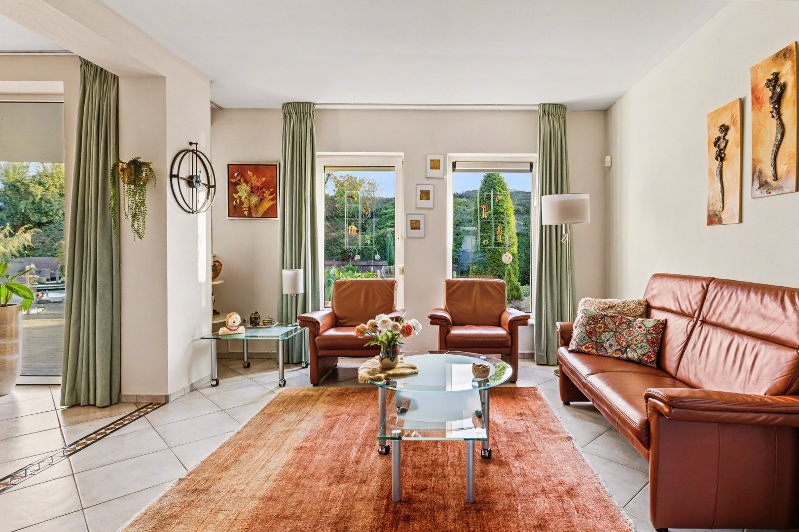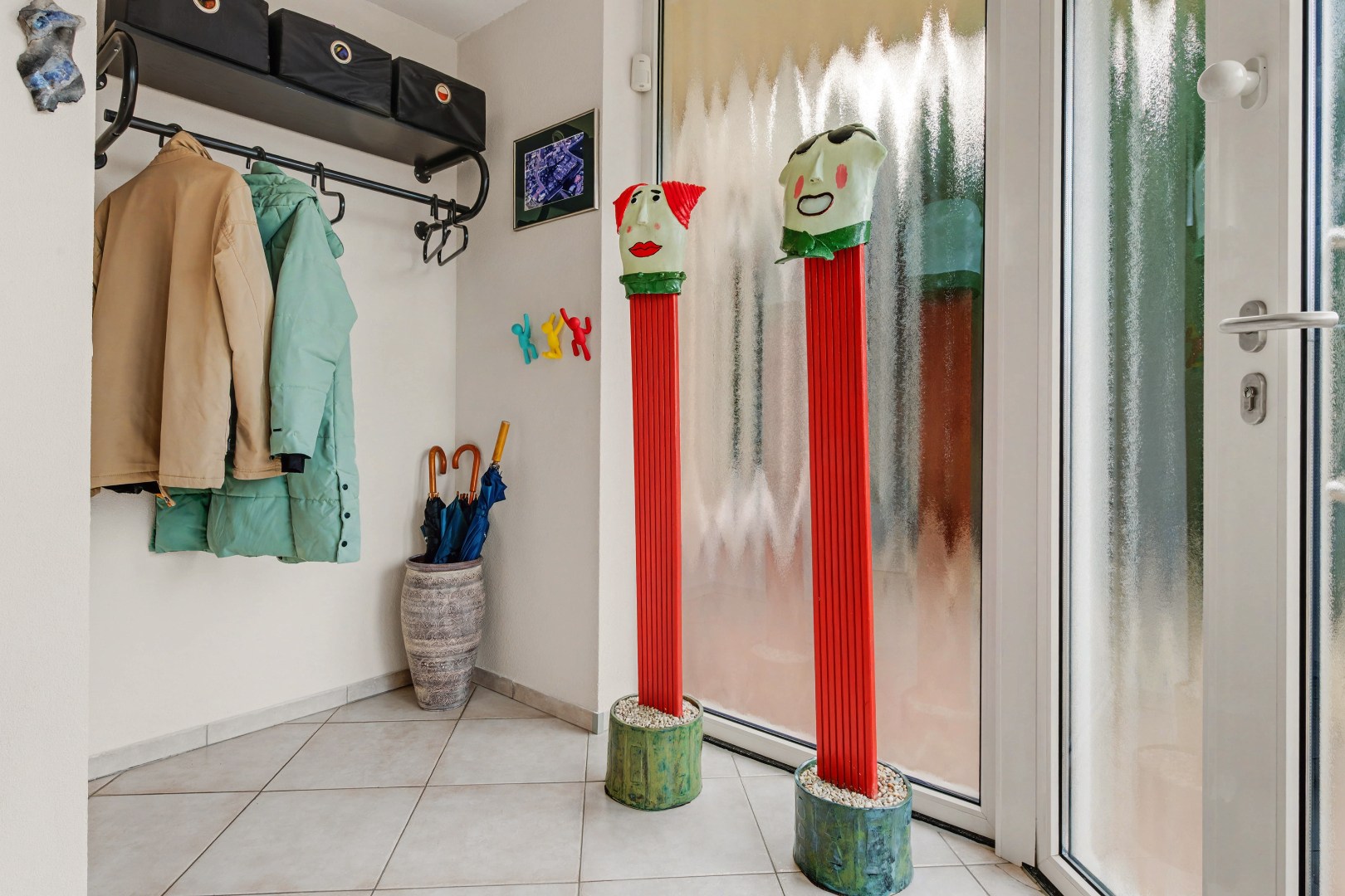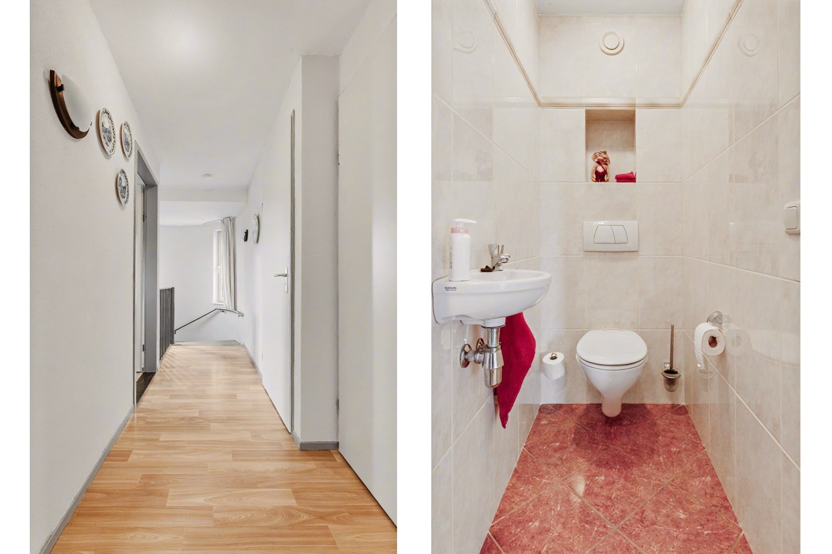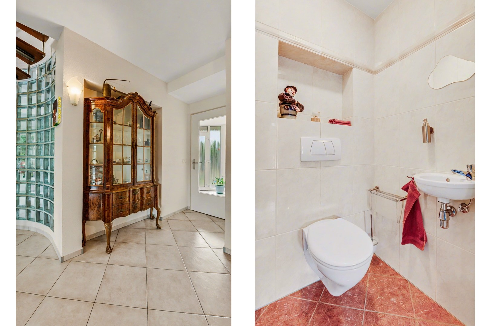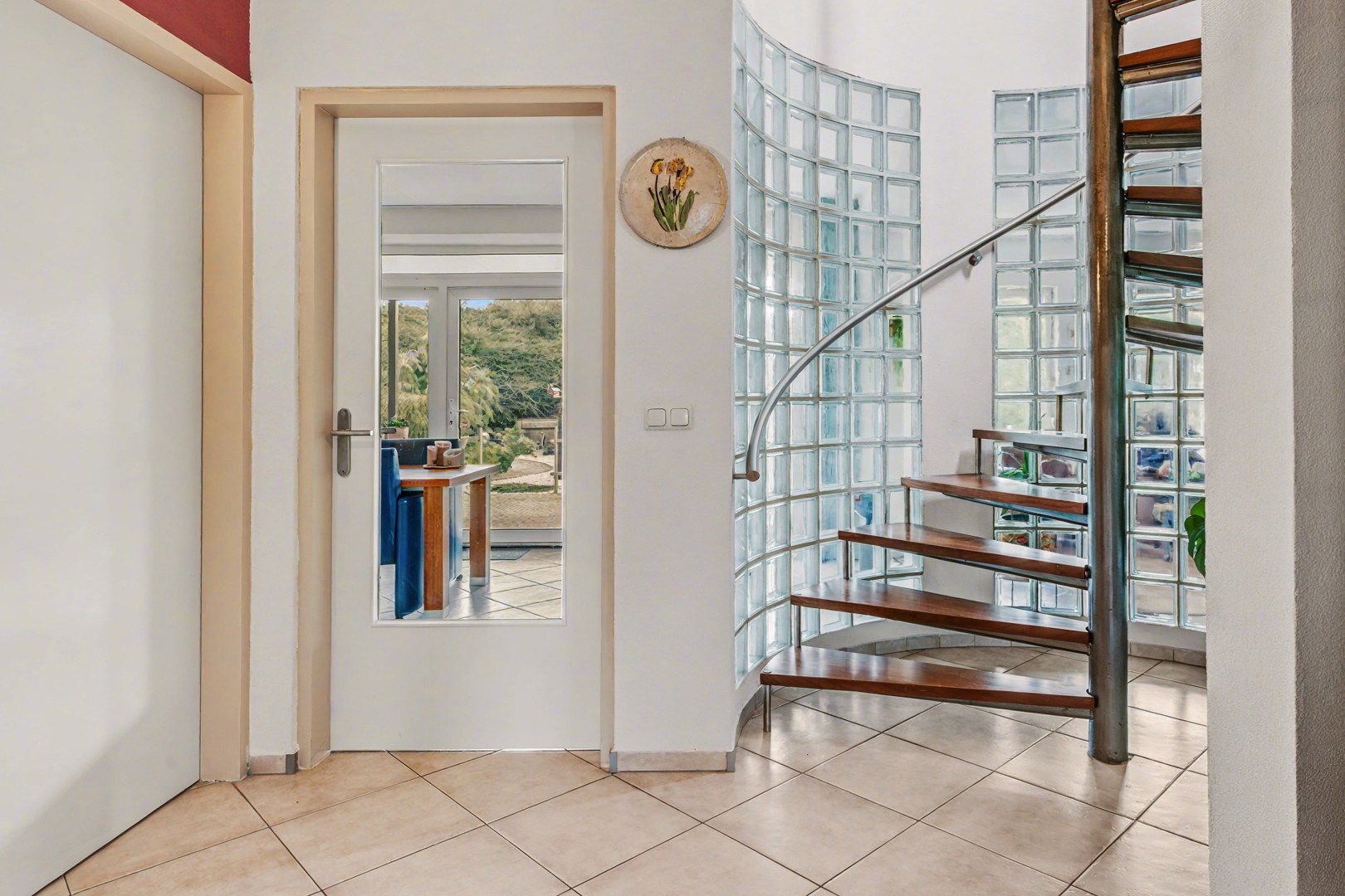 Bij binnenkomst via de entree stap je de hal in, het centrale punt van de woning van waaruit verschillende ruimtes bereikbaar zijn. Hier bevinden zich onder andere het gastentoilet en de wasruimte, maar ook de doorgang naar de leefruimtes van het huis.