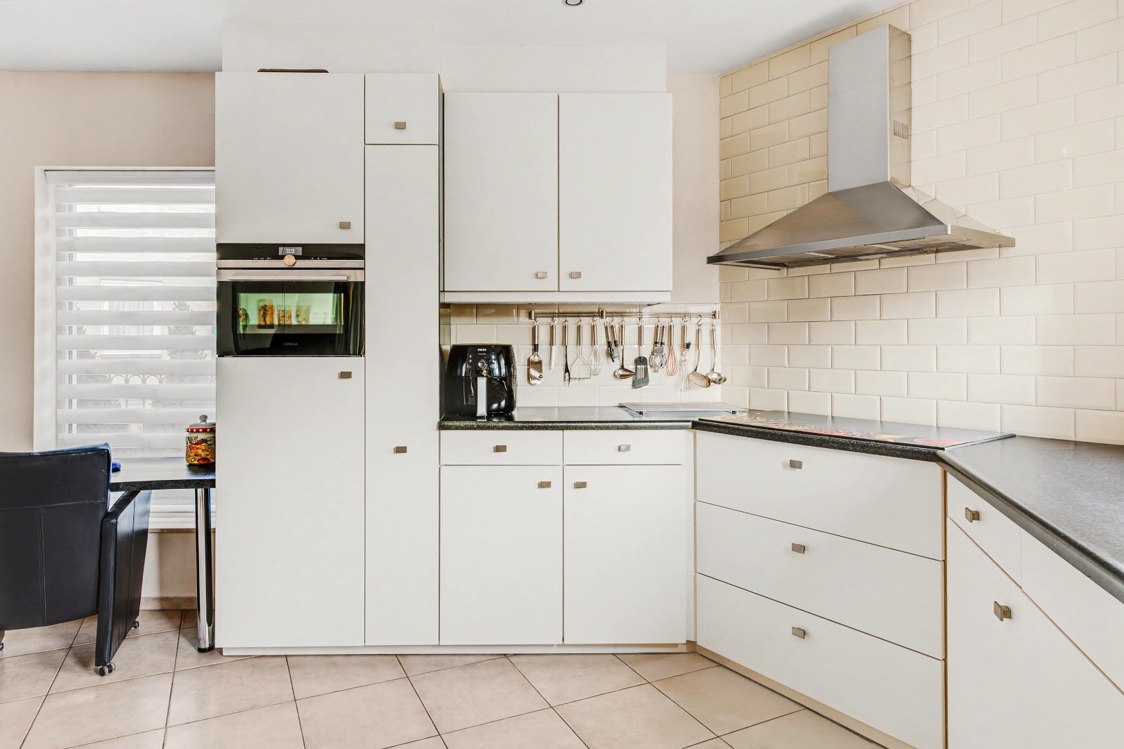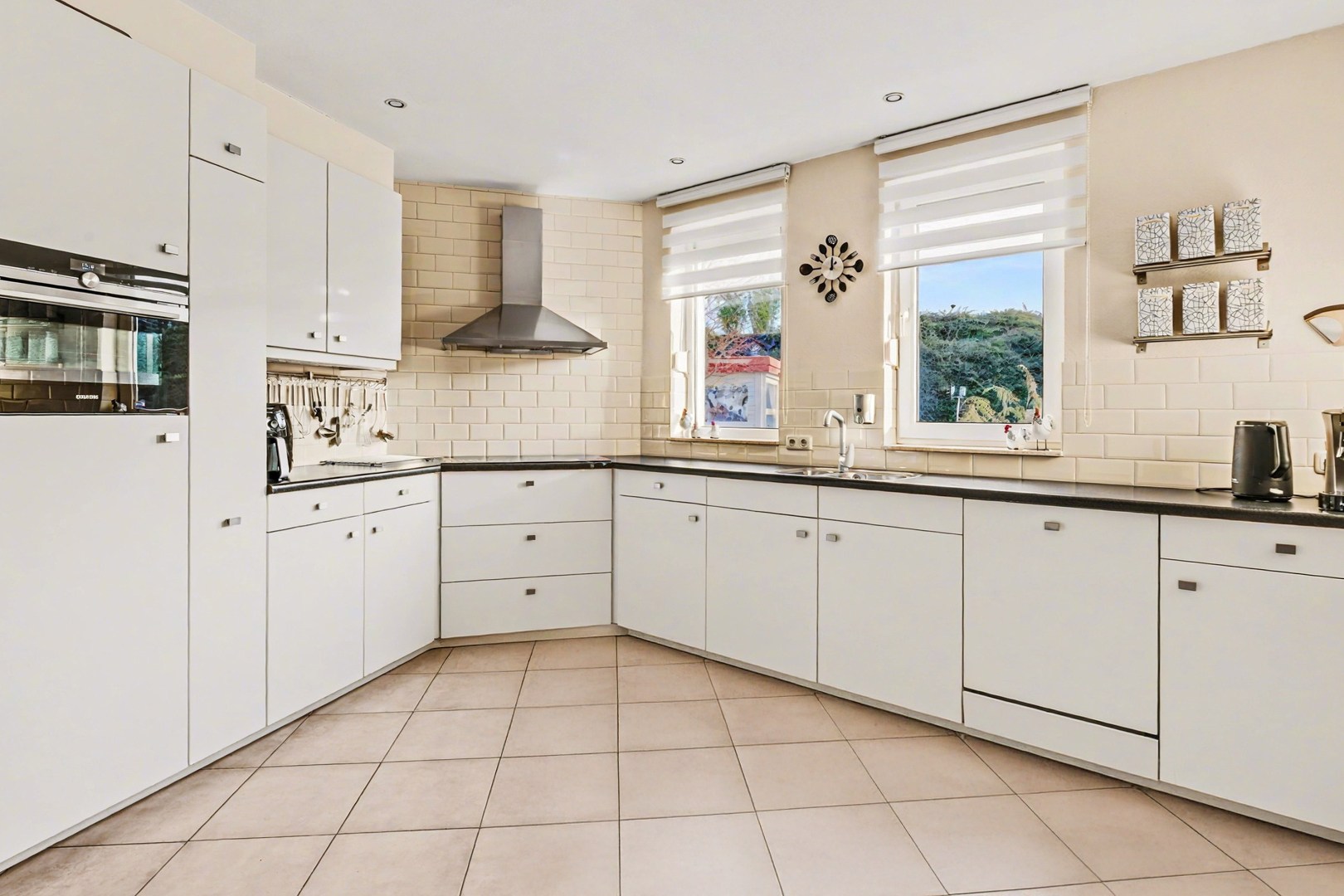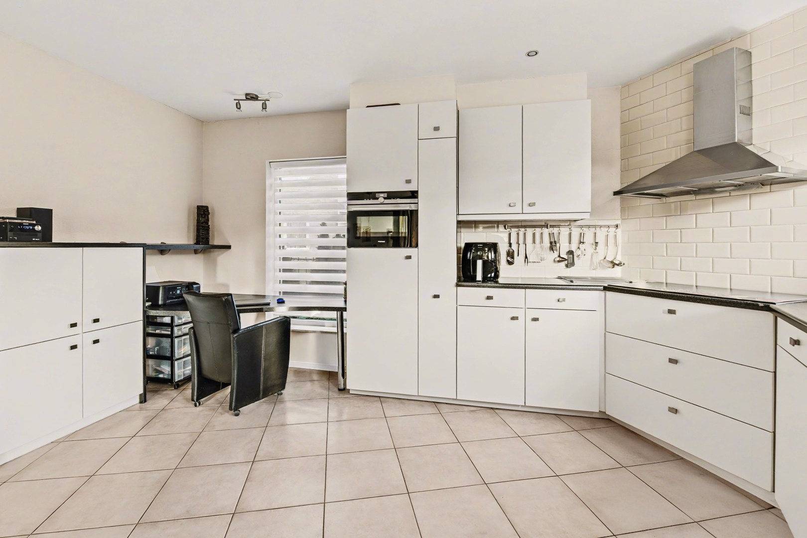 De keuken sluit aan op de eetkamer en is praktisch ingericht. Hierdoor ontstaat een fijne verbinding tussen koken en samen zijn. Terwijl er gekookt wordt, blijft het contact met de rest van het gezelschap behouden, wat deze plek tot een natuurlijke ontmoetingsplek in huis maakt. Bovendien is er vanuit deze ruimte een prettige verbinding met de tuin, wat zorgt voor extra licht en een ruimtelijk gevoel.