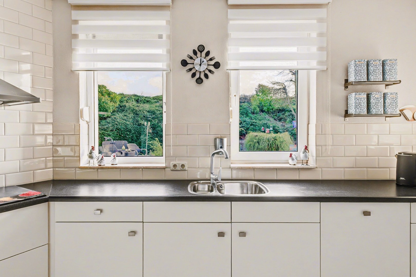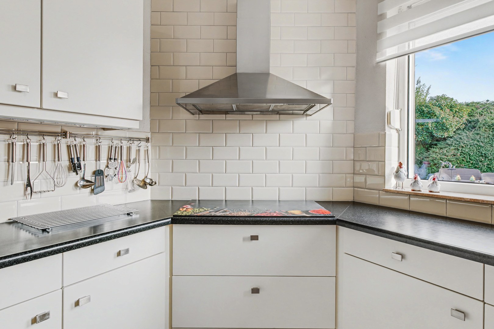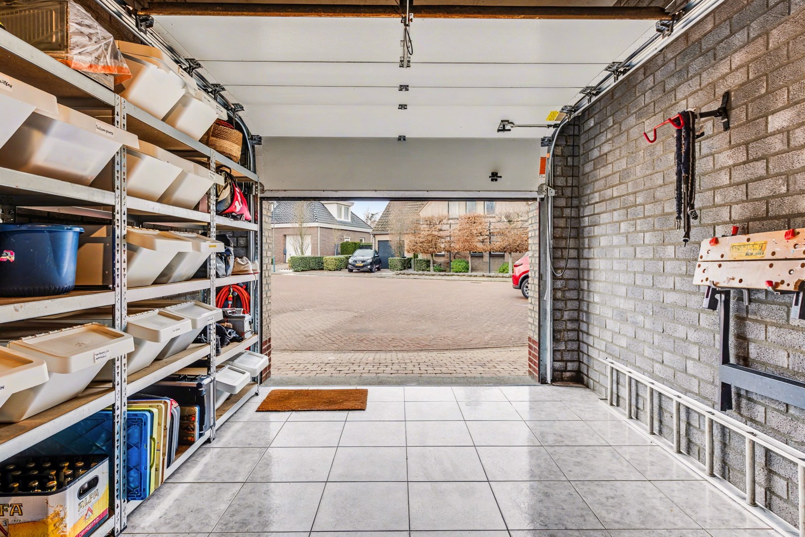 De keuken sluit aan op de eetkamer en is praktisch ingericht. Hierdoor ontstaat een fijne verbinding tussen koken en samen zijn. Terwijl er gekookt wordt, blijft het contact met de rest van het gezelschap behouden, wat deze plek tot een natuurlijke ontmoetingsplek in huis maakt. Bovendien is er vanuit deze ruimte een prettige verbinding met de tuin, wat zorgt voor extra licht en een ruimtelijk gevoel.