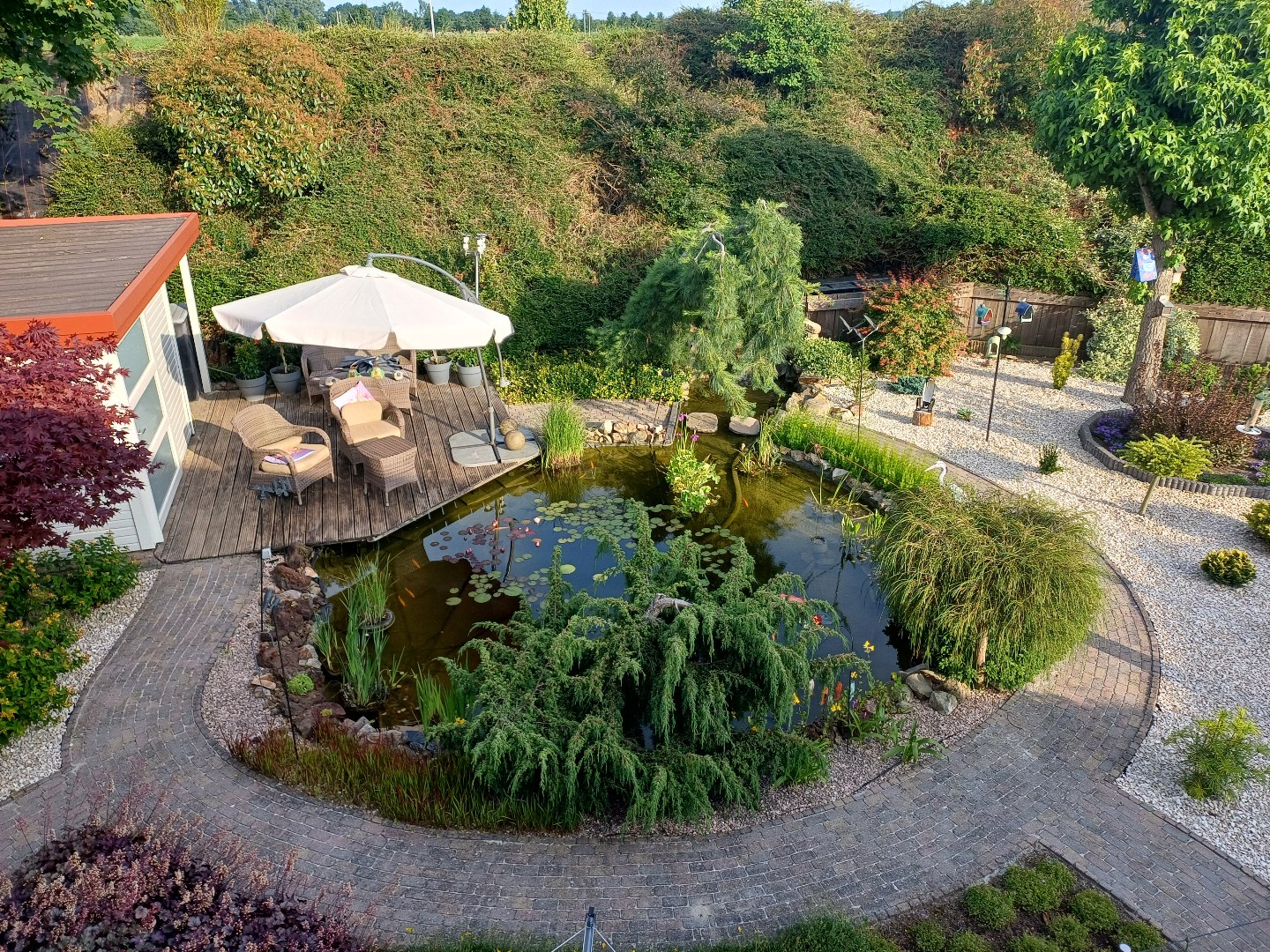 Zodra je buiten komt merk je dat dit niet zomaar een tuin is: een sfeervol aangelegde buitenruimte met een prachtige vijver en verschillende perkjes die samen een groene en karaktervolle omgeving vormen. Het is een plek waar rust, privacy en natuur samenkomen en waar je ieder seizoen opnieuw kunt genieten van het buitenleven.