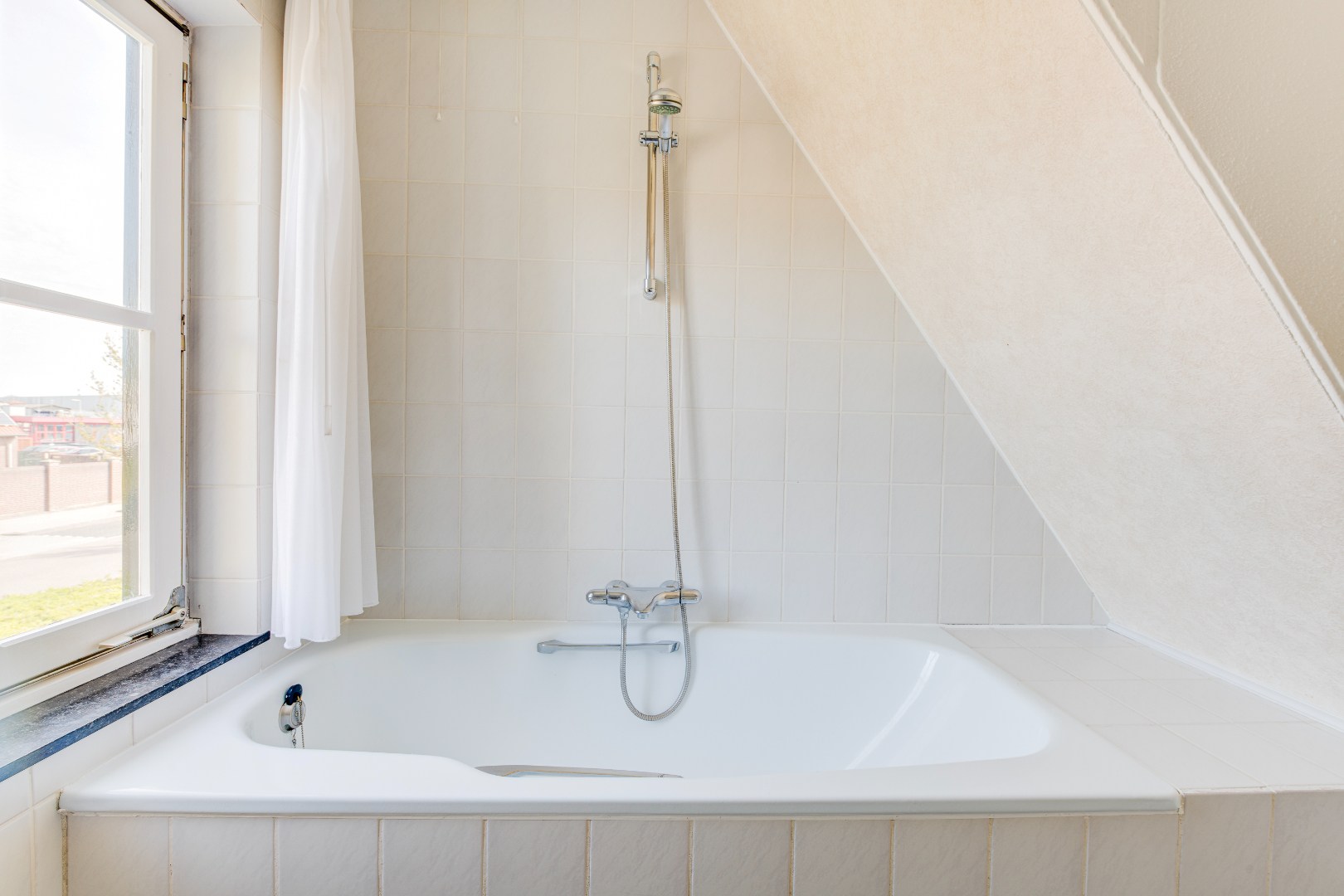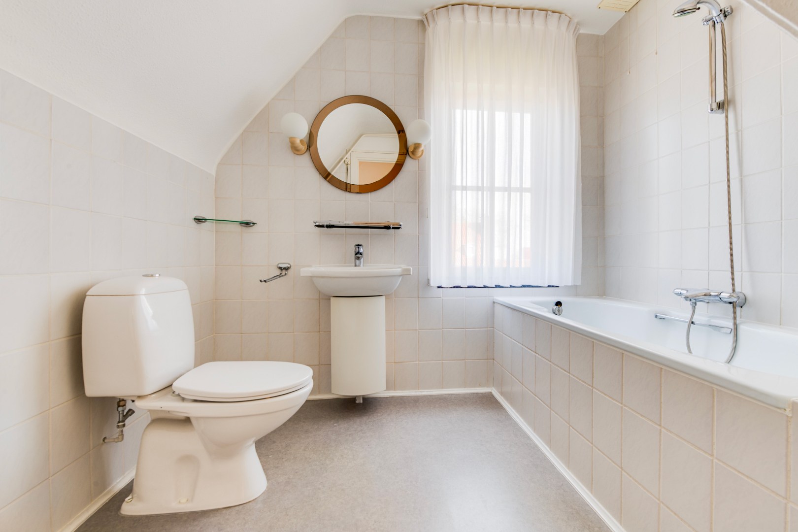 De badkamer is voorzien van een ligbad met douche, een wastafel en een toilet. Hoewel functioneel, biedt ook deze ruimte volop kansen om naar hedendaagse maatstaven te moderniseren en volledig naar eigen smaak in te richten.