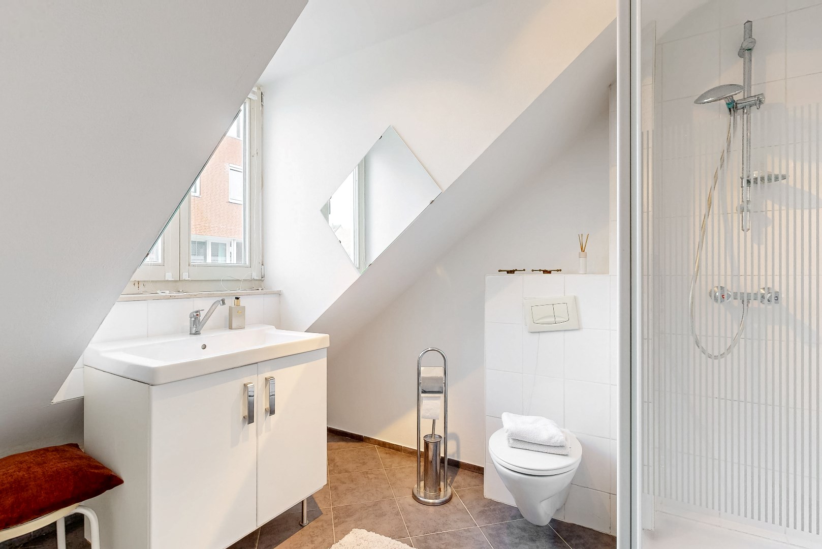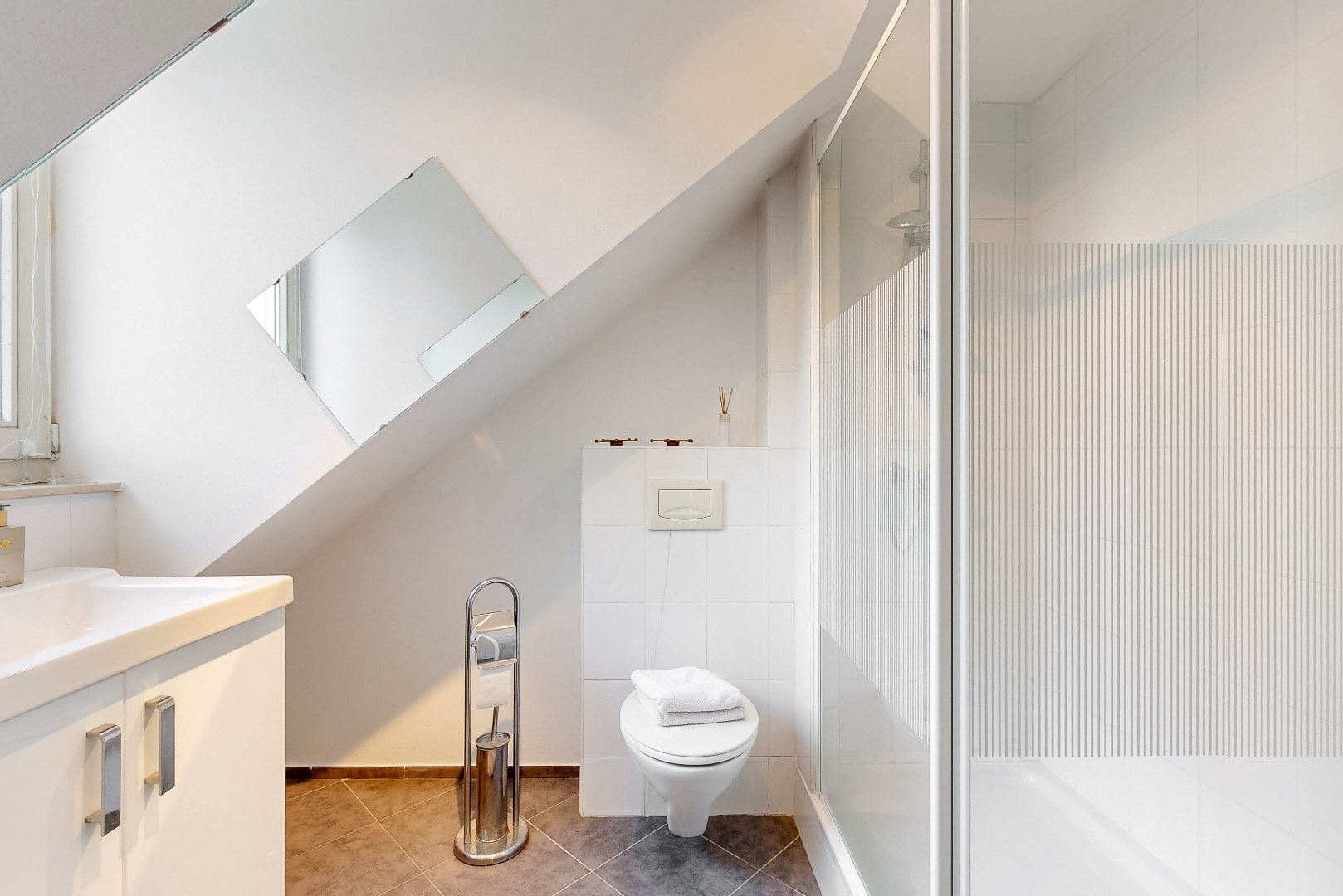 De badkamer op de tweede verdieping beschikt over een douche, wastafel en toilet.