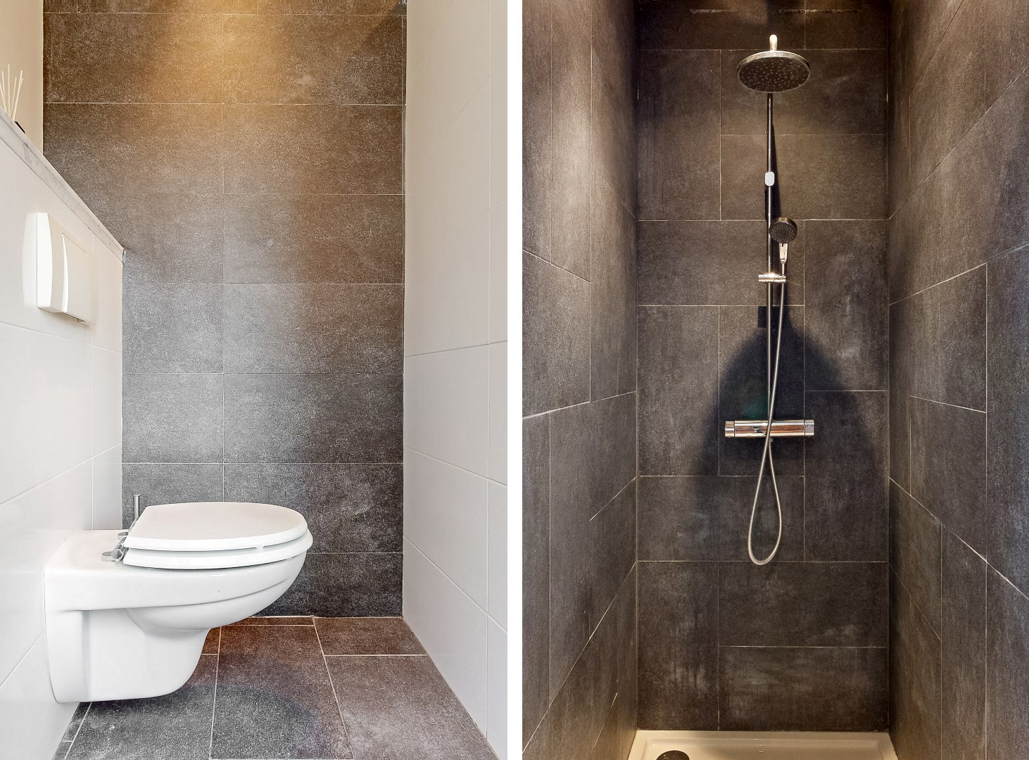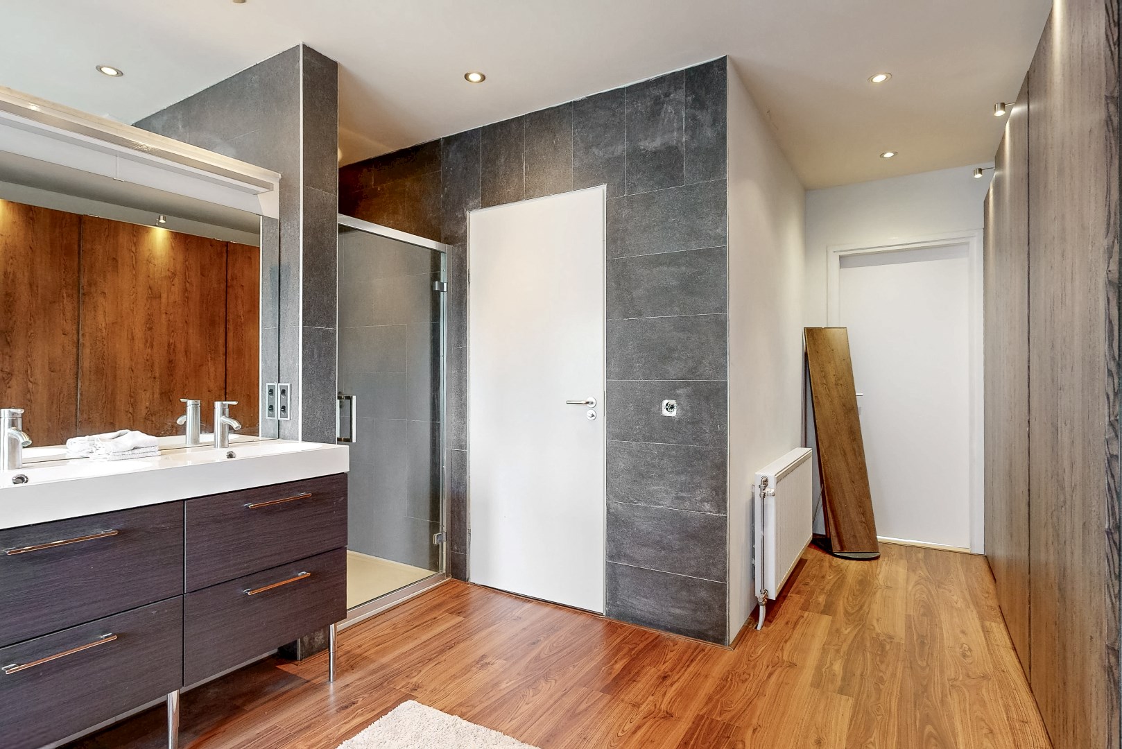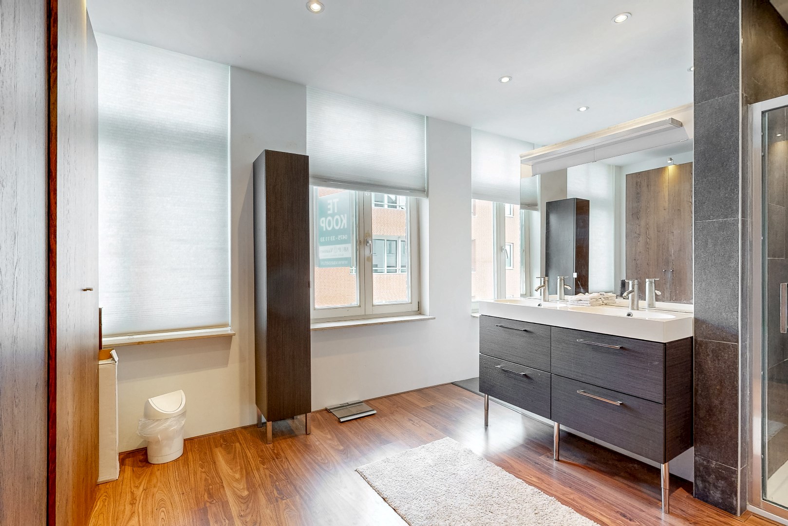 De woning beschikt over 2 badkamers op de eerste en tweede verdieping. De badkamer op de eerste verdieping beschikt over een inloopdouche, een dubbele wastafel met opberglades en een toilet. Tevens bevindt zich een kastenwand in de badkamer. Hierin bevindt zich de witgoedaansluiting.