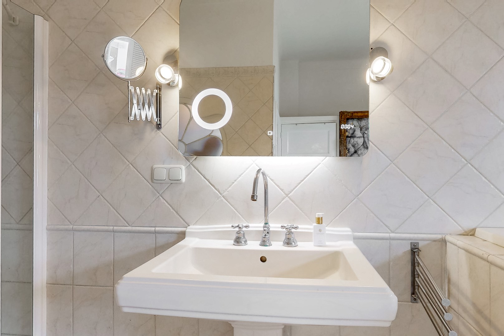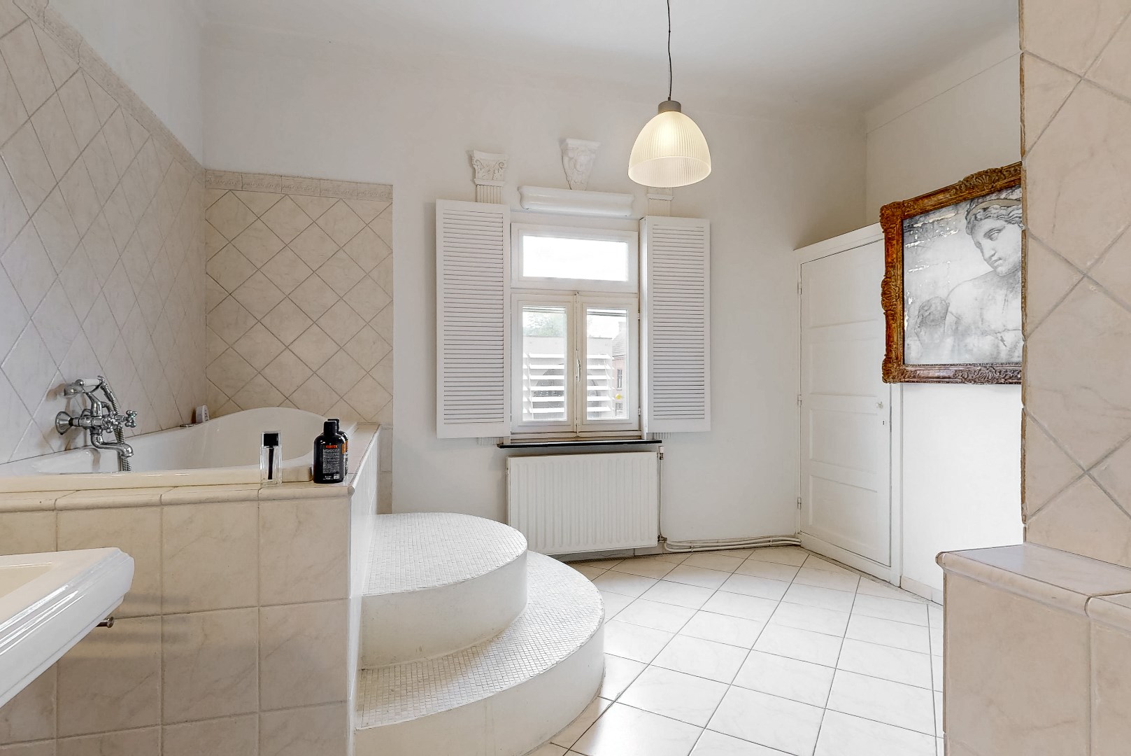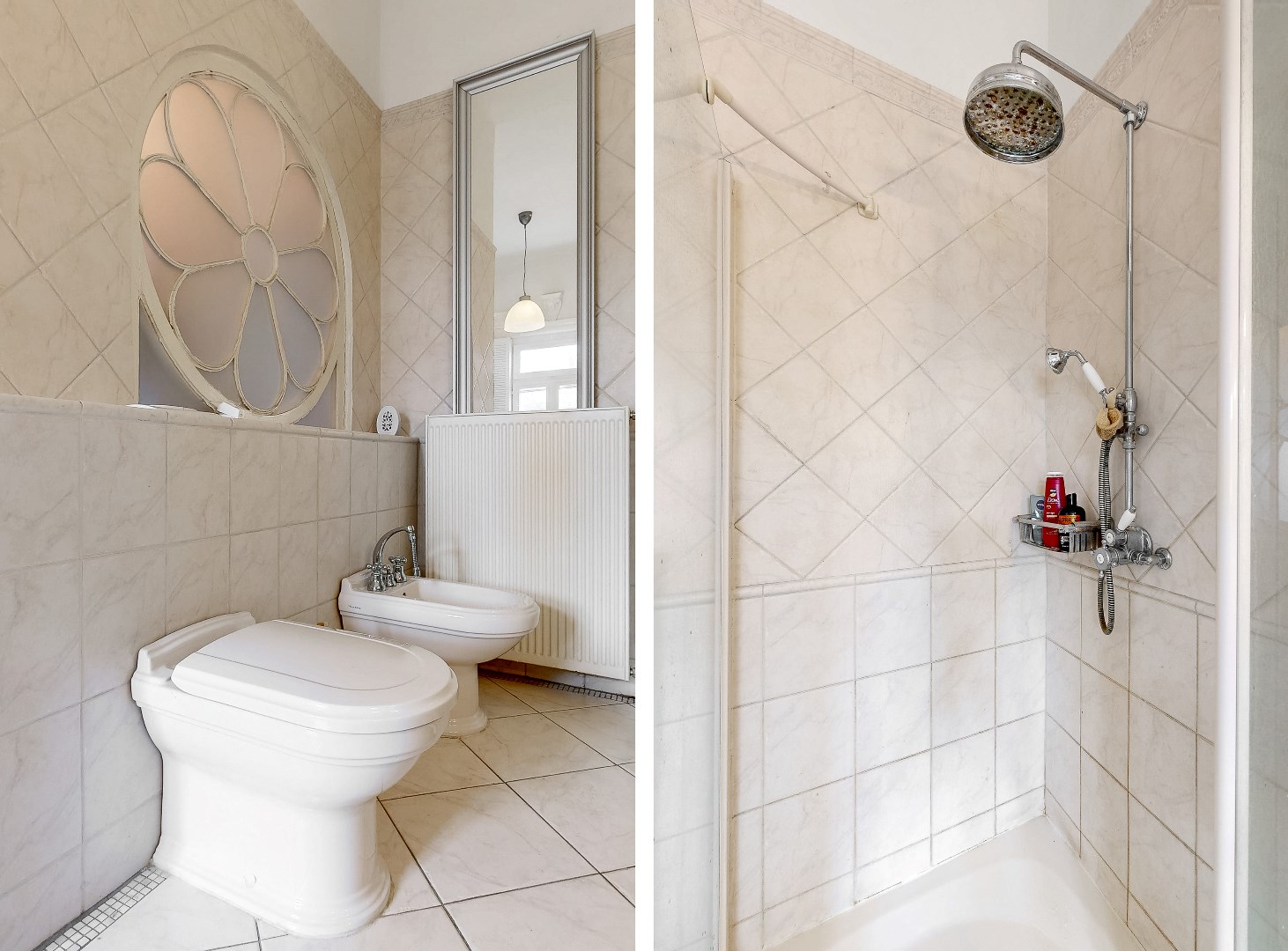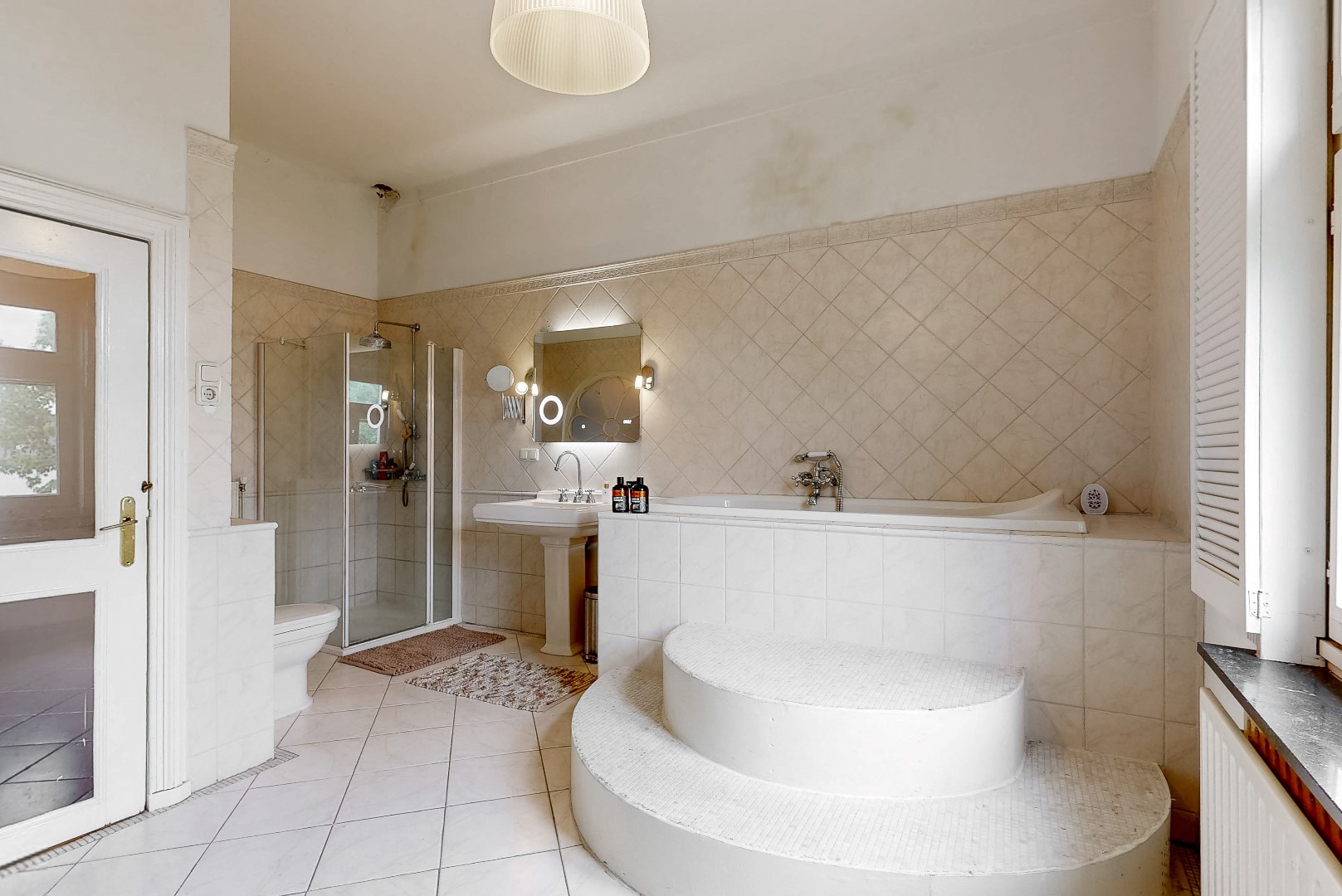 De badkamer beschikt over een wastafel met opbergkastjes, een douche, een ligbad, een toilet en een bidet.