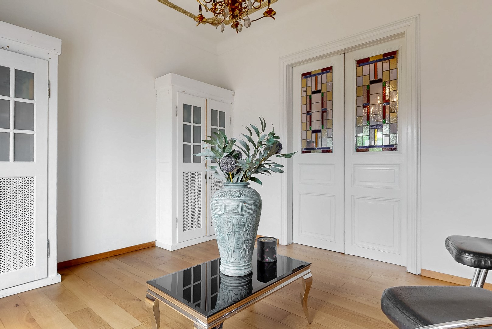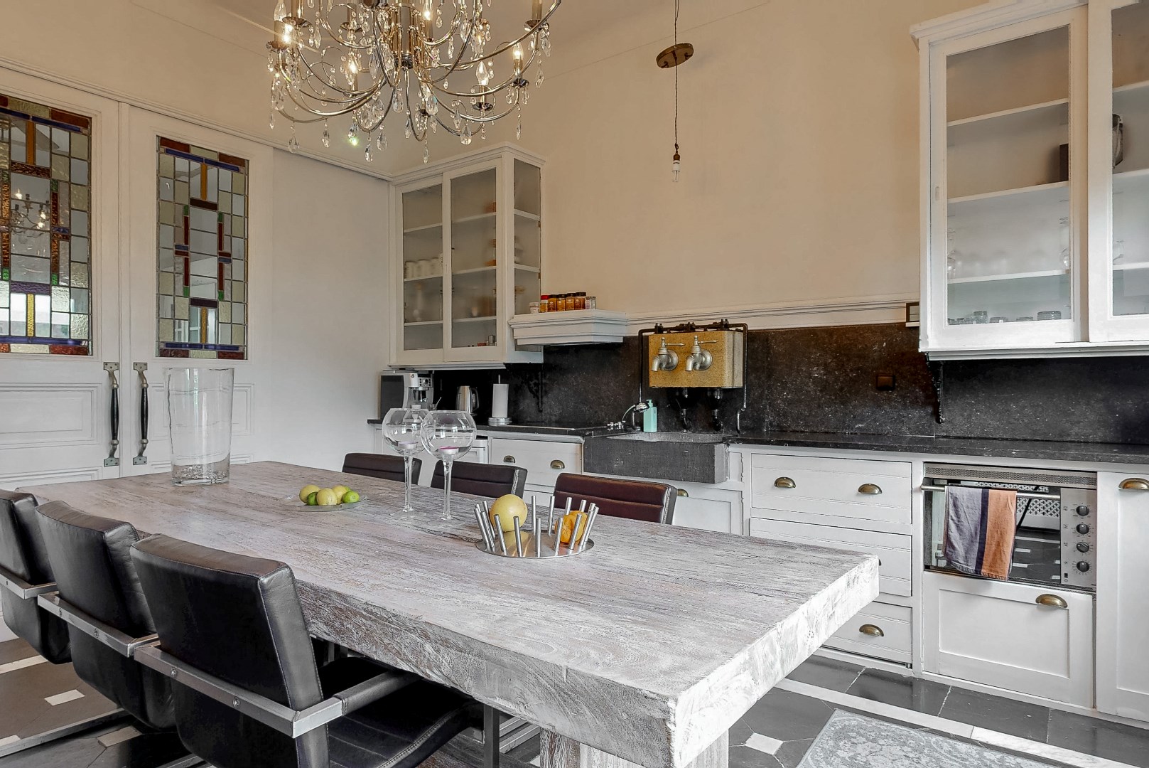 Vanuit de woonkamer loop je de keuken in door schuifdeuren met prachtige glas-in-loodramen. De keuken beschikt over een inductiekookplaat, afzuigkap en een wasbak met kraan. Verder beschikt de keuken over veel kastruimte, waar je al je servies, pannen en voorraad in kunt opbergen.