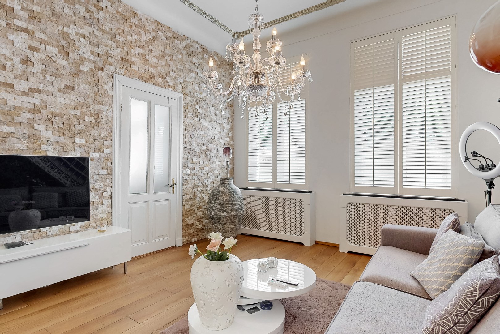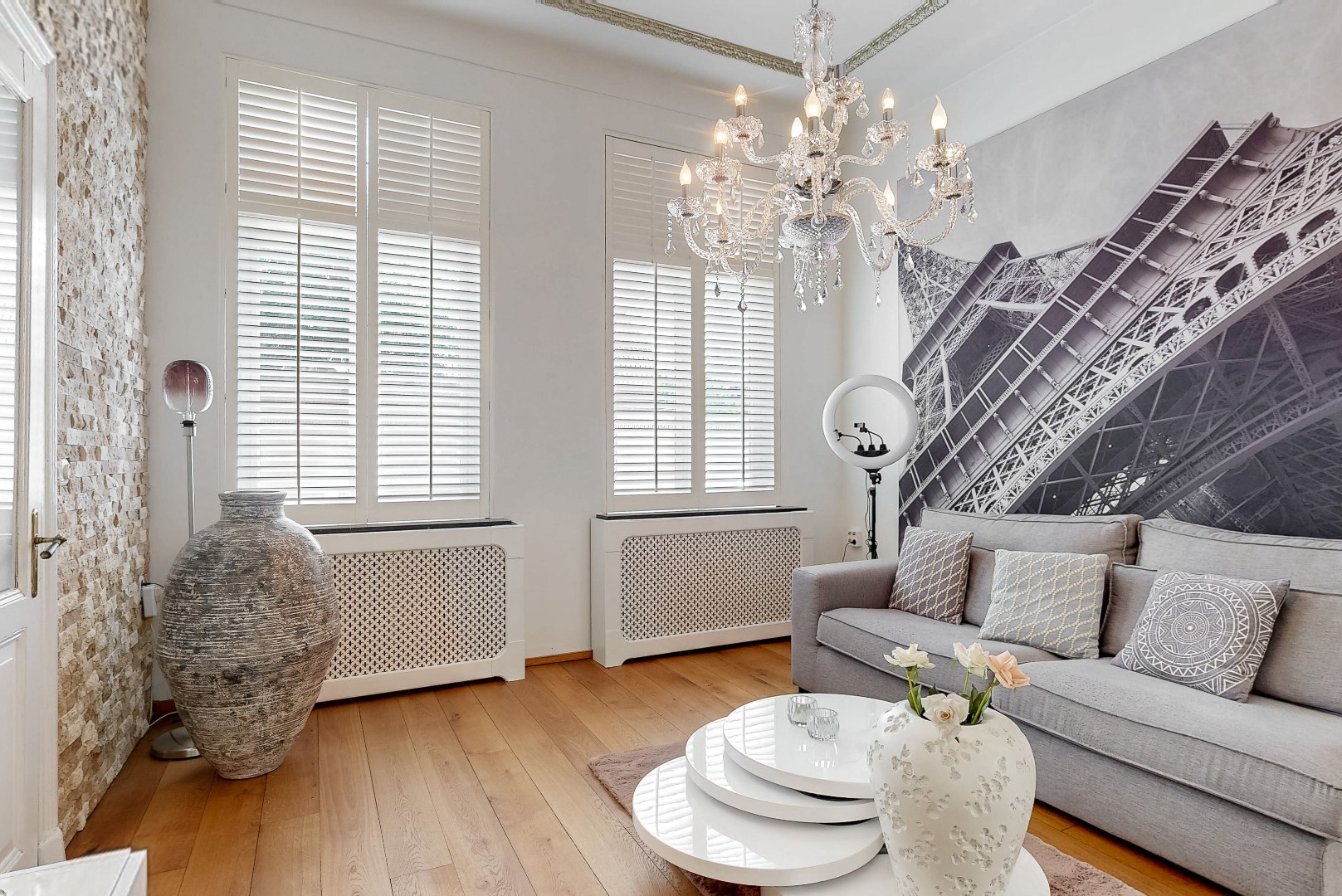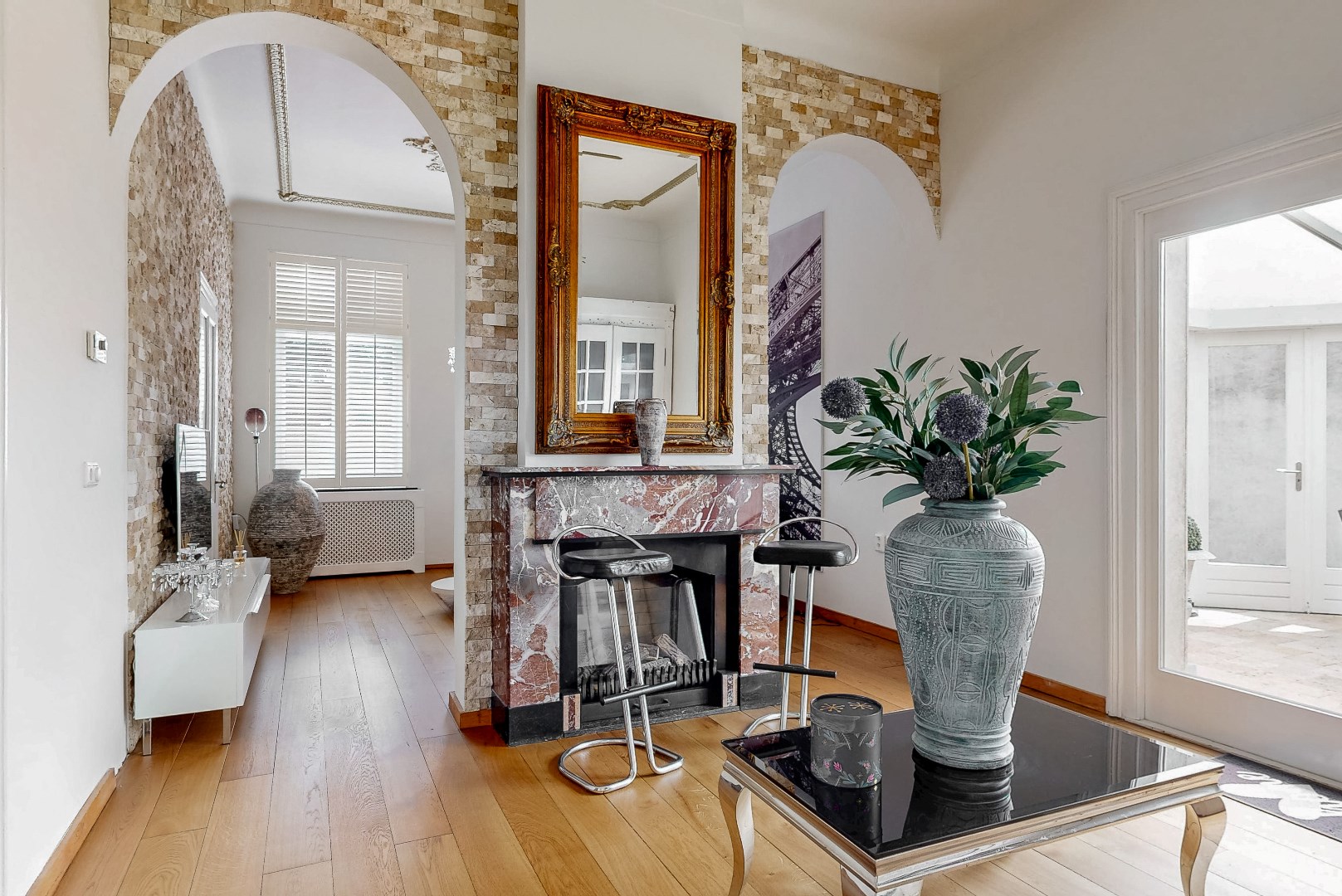 De woonkamer heeft een ruime opzet en veel lichtinval door de tuindeuren aan de zijkant van de woning die naar het overdekte terras leiden. De woonkamer is opgedeeld in twee delen, waardoor je bijvoorbeeld een zitgedeelte en leefgedeelte kunt inrichten. In de woonkamer bevindt zich een gashaard. Op een koude winterdag kun je dan ook heerlijk opwarmen na een wandeling in de kou.