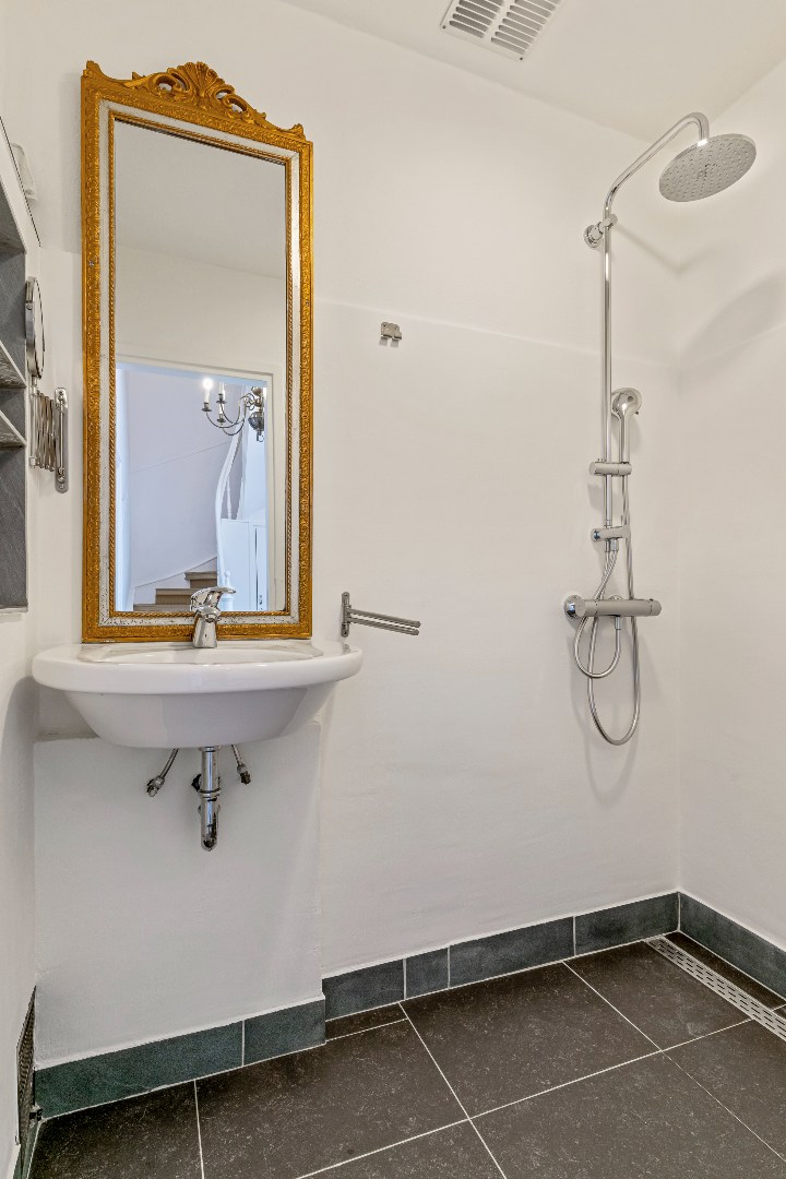 De badkamer op de eerste verdieping beschikt over een inloopdouche en wastafel. Het toilet vind je in de aangrenzende ruimte, apart van de badkamer.