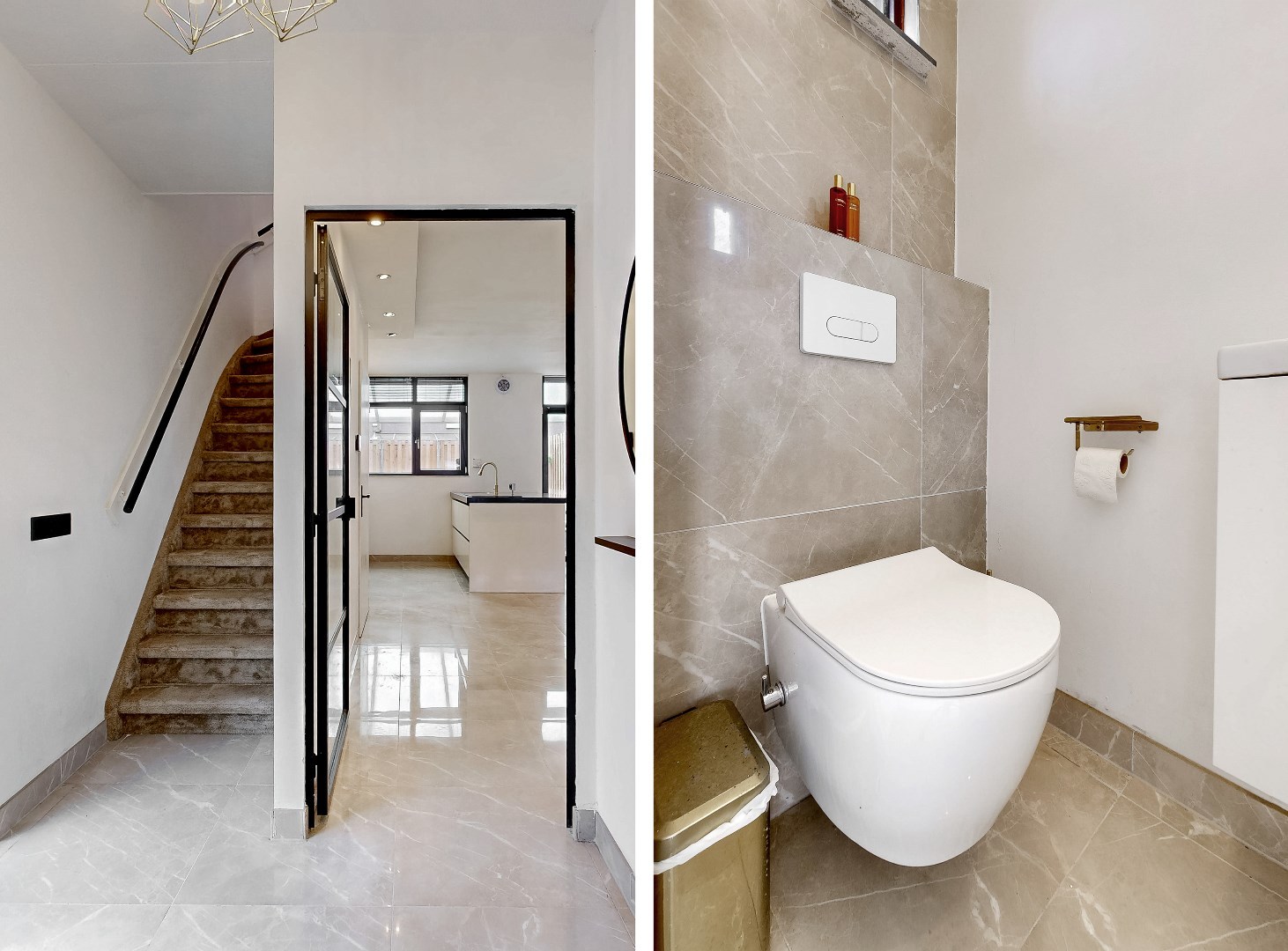 De moderne badkamer (2022) is voorzien van betegelde wanden en vloeren, een inloopdouche, een toilet en een dubbele wastafel met opberglades voor al je producten. Tevens is er een toilet, een handdoekenradiator en bevindt de witgoedaansluiting zich ook op de badkamer.